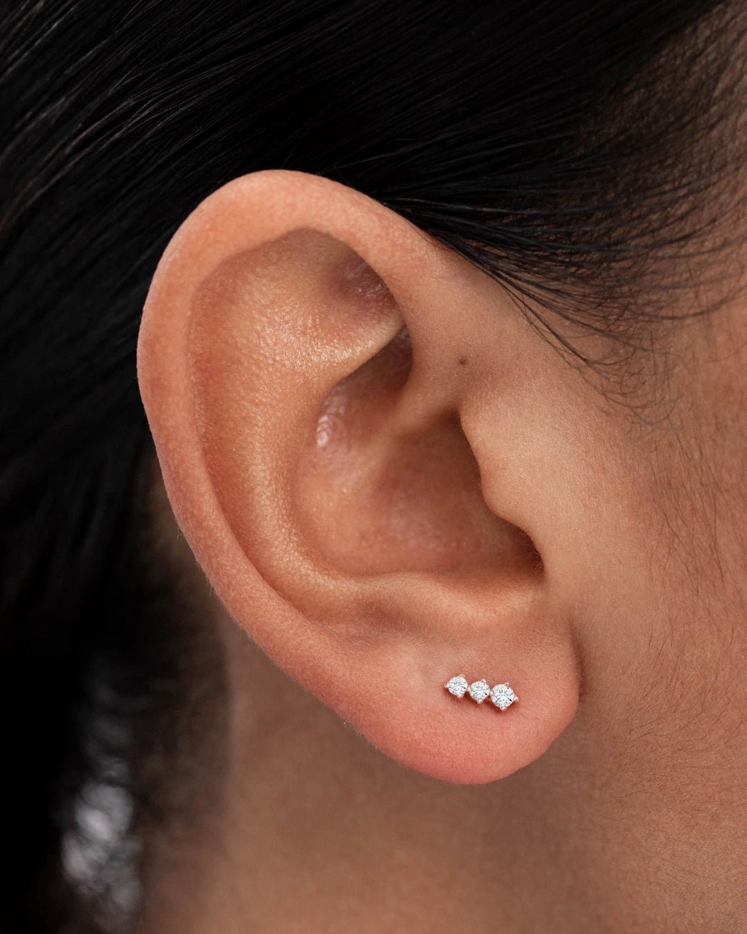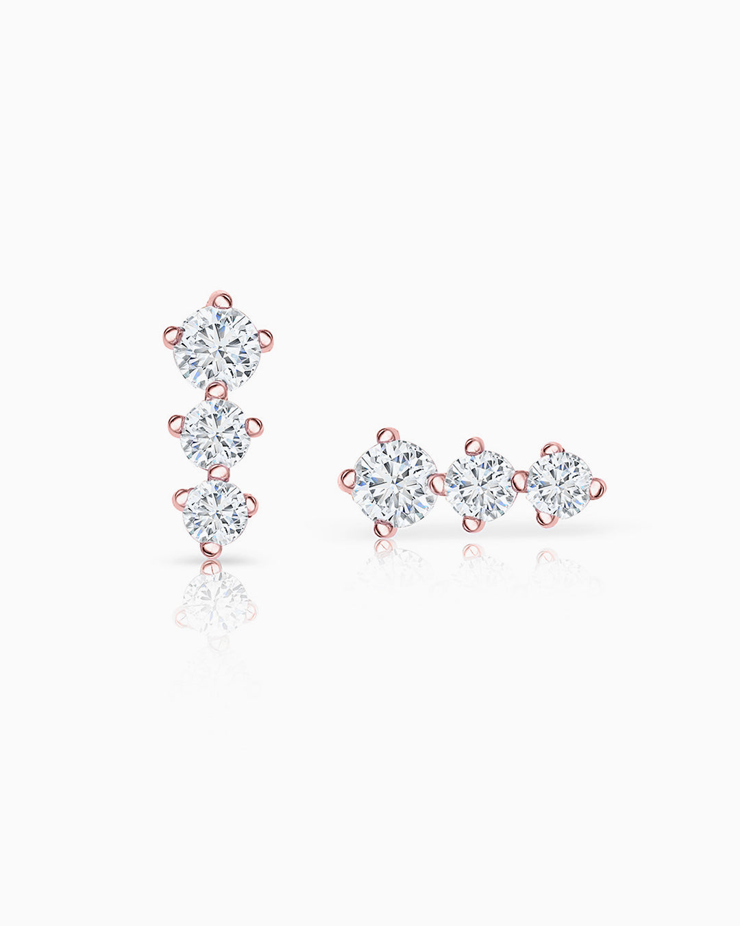 Trinity earrings with diamonds set in 18k rose gold. The beauty of contemporary simplicity is brought to life through our Trinity earrings. In these original earrings, three diamonds on an invisible setting evoke the celestial forms of a starry night. They are just the right size to be worn either vertically or horizontally, adapting perfectly to the piercing hole in which you prefer to wear them. They have a press fit closure. The post is located in a central point, contributing to its versatility. Earrings with a touch of magic that will captivate you.The Trinity earrings are available in three versions, 18k yellow, white and rose gold.