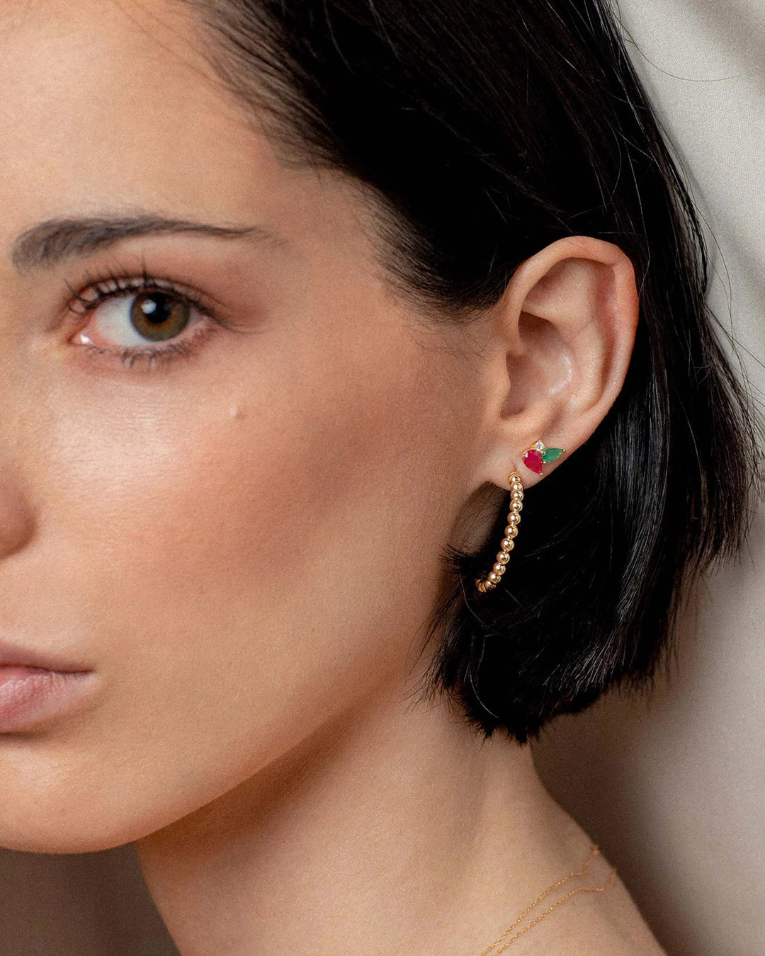 Eternity Colours diamond, ruby and emerald earrings in a striking flower shape in 18k yellow gold. The essence of the Eternity Colours collection is reflected again in an earring design that will enchant you. These original 18k yellow gold earrings perfectly capture the magic of a beautiful play of shapes and shades that evoke the blooming of a flower. The interplay of shapes is created through a pear-cut emerald and ruby combined with a delicate diamond that symbolizes the heart of the flower. They are the perfect size to be worn either in the first piercing hole of the earlobe or in the cartilage, creating an original effect. Stop dreaming and add them to your jewelry box!