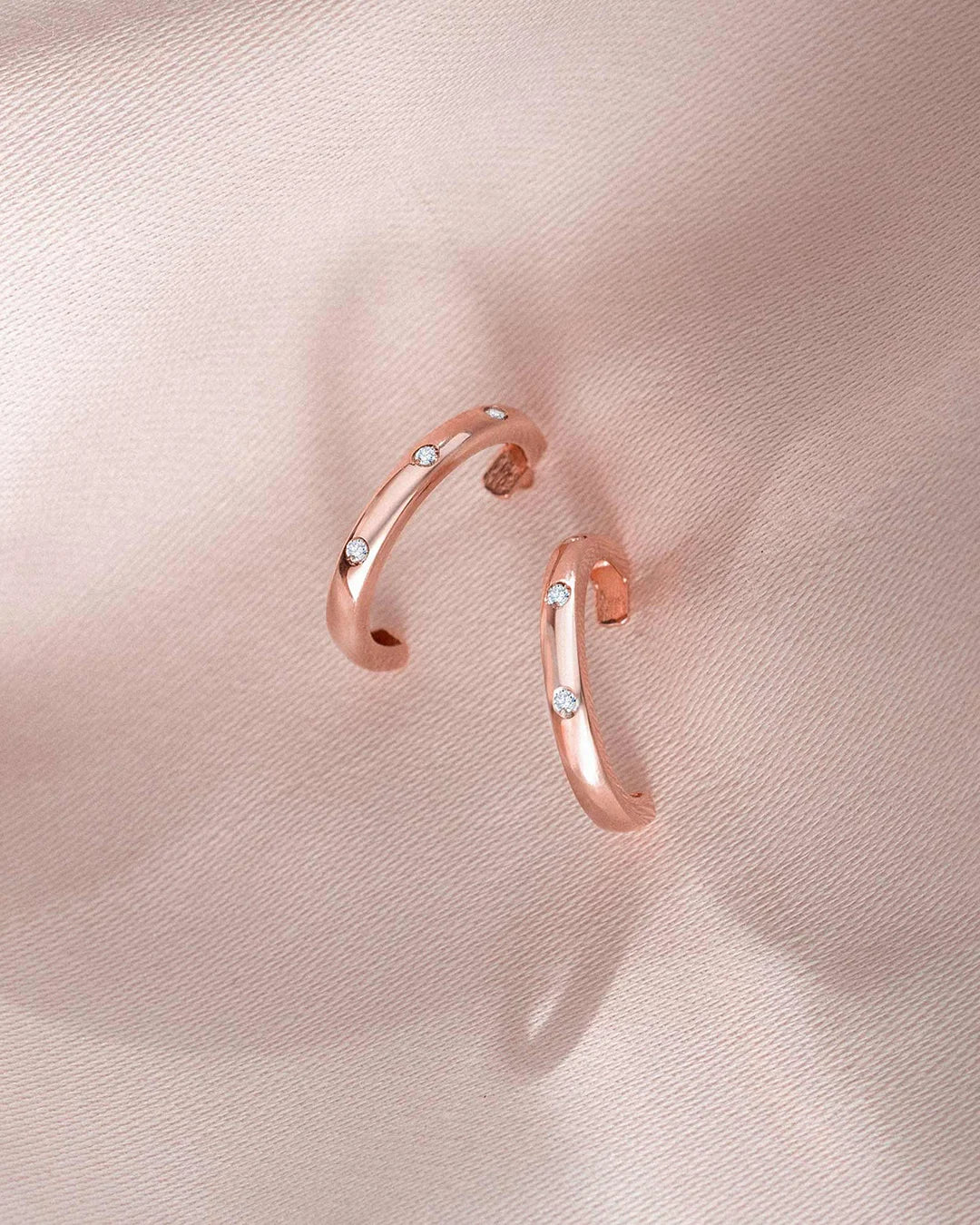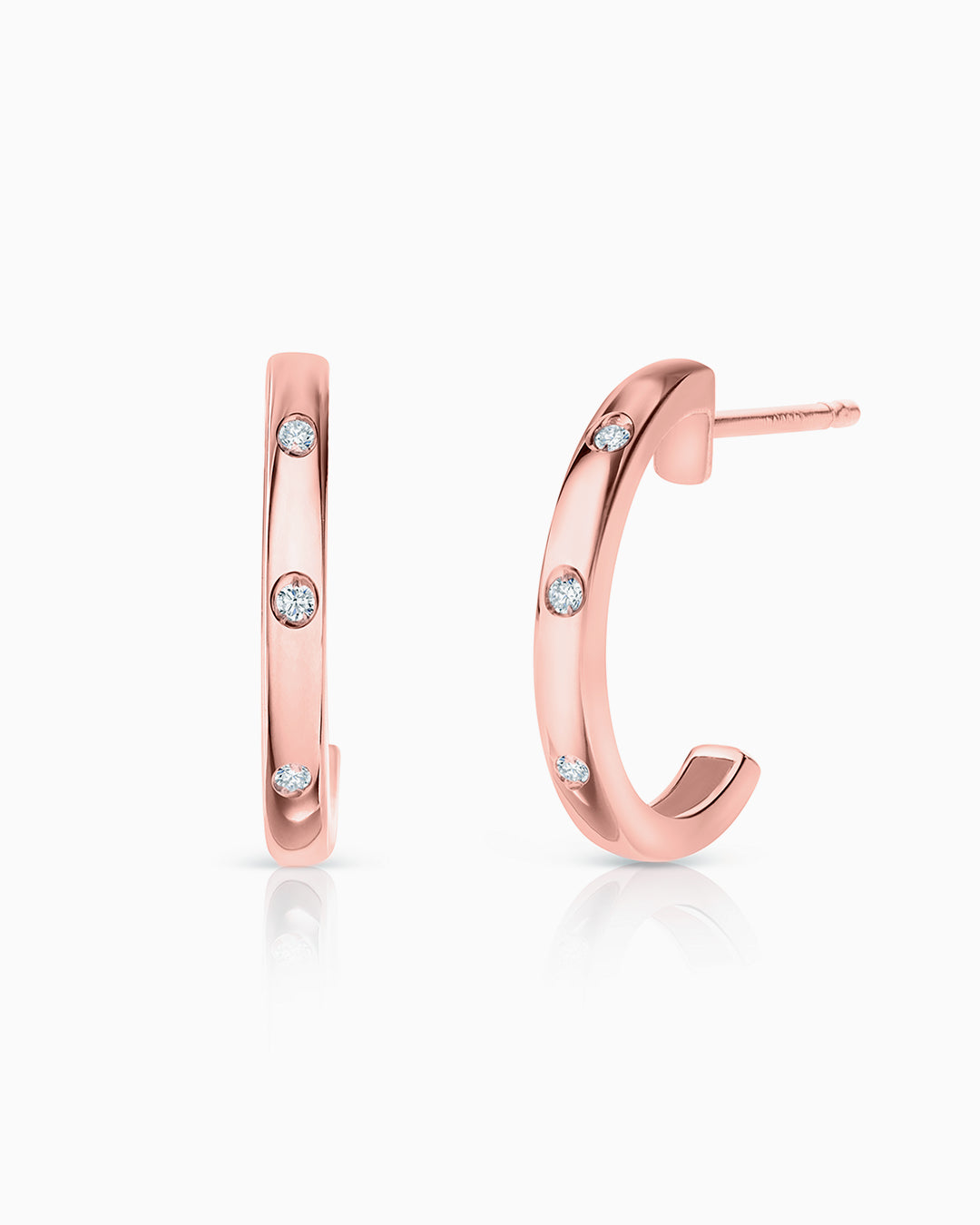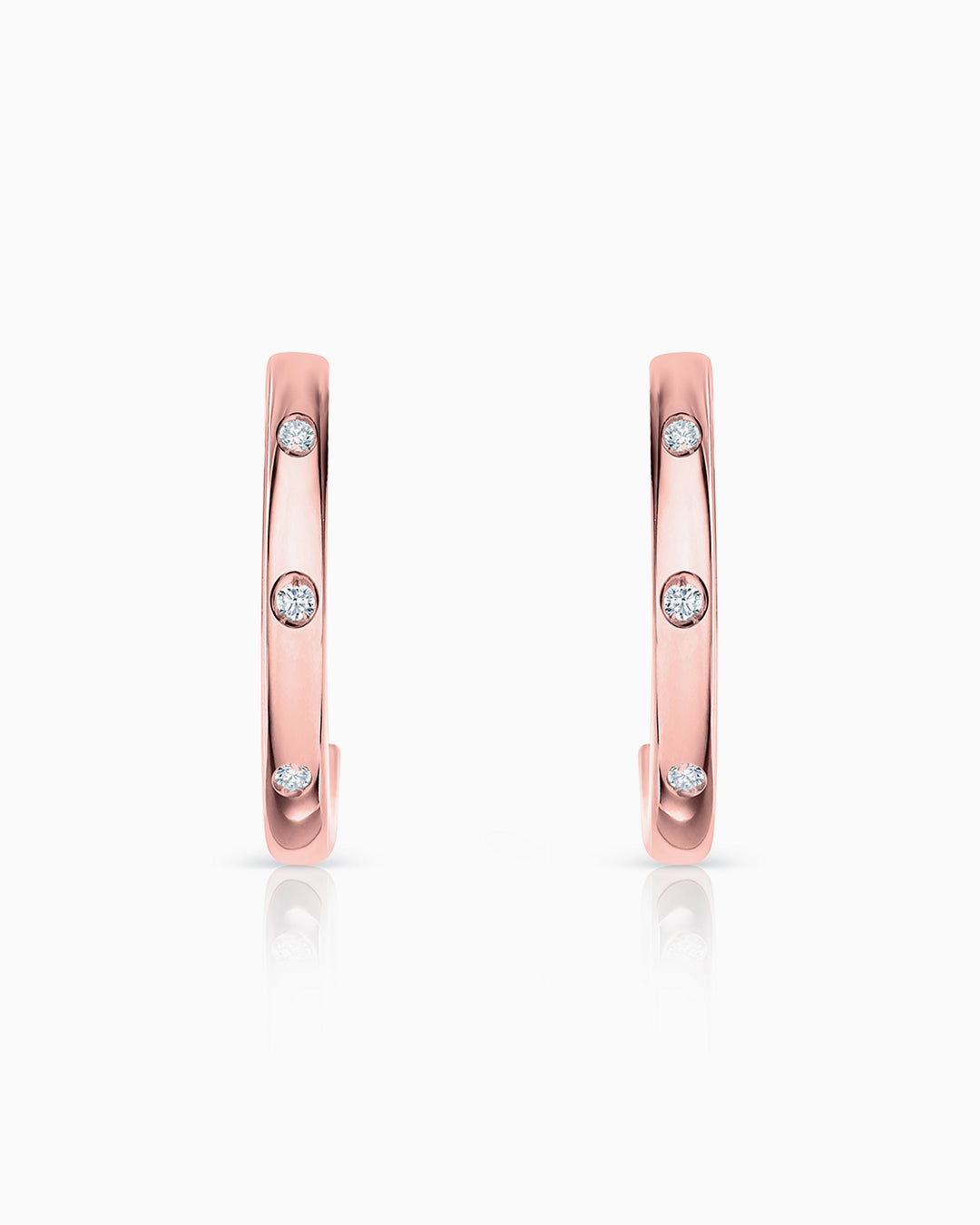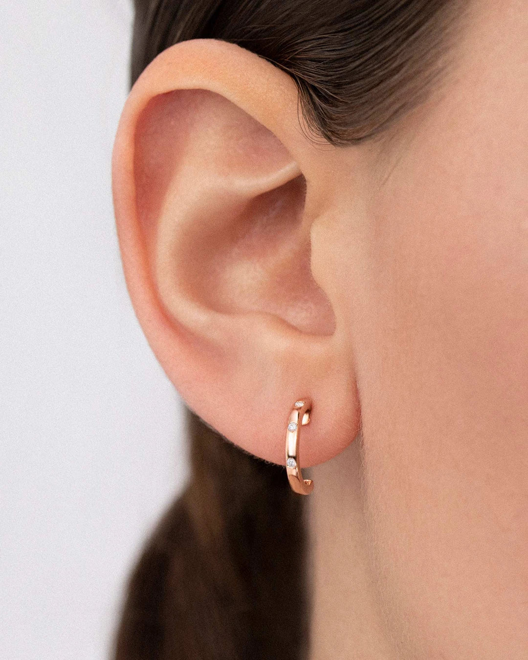 Allied diamond earrings crafted in 18k rose gold. Destined to live exciting adventures, designed for everyday life. Allied earrings are not the typical huggie earring, three delicate diamonds trace their curved shape giving them a touch of originality that will captivate you. Inspired by the tenderness and contemporary aesthetic of the collection, the Allied huggie earrings are the perfect complement to one of our most iconic rings. They have a press fit closure or butterfly earring back that provides security and comfort. Ideal to enhance any hairstyle, a trio of diamonds for your ear.The Allied earrings are available in three versions, 18k rose, yellow and white gold.
