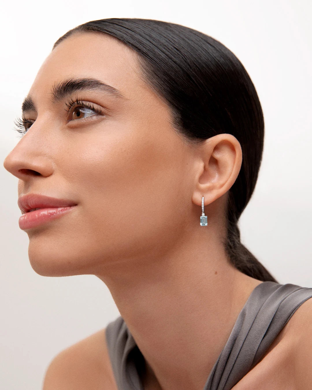 The enchanting Amelie earrings stand out for their clean lines and the subtle contrast between a brilliant-cut natural diamond and a captivating emerald-cut aquamarine. Their minimalist design creates a refined yet unexpected character, brought to life by the gemstone’s shimmering blue hue. Timeless and versatile, these distinctive earrings are perfect for both everyday wear and special occasions. Pair them with other Amelie pieces for an effortlessly elegant take on gemstone jewelry.