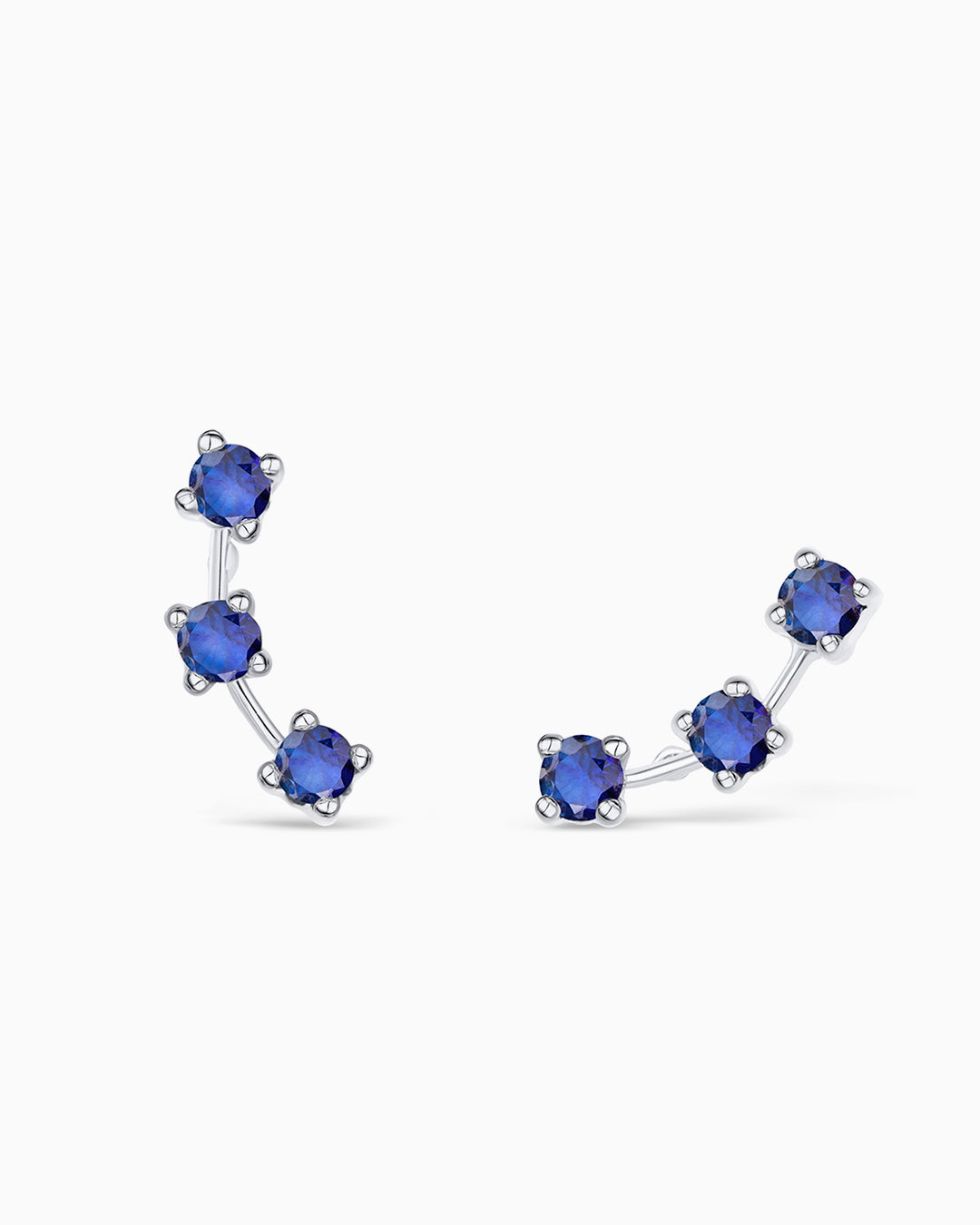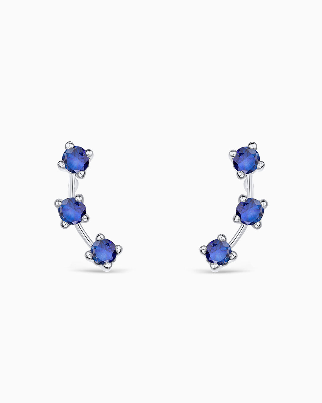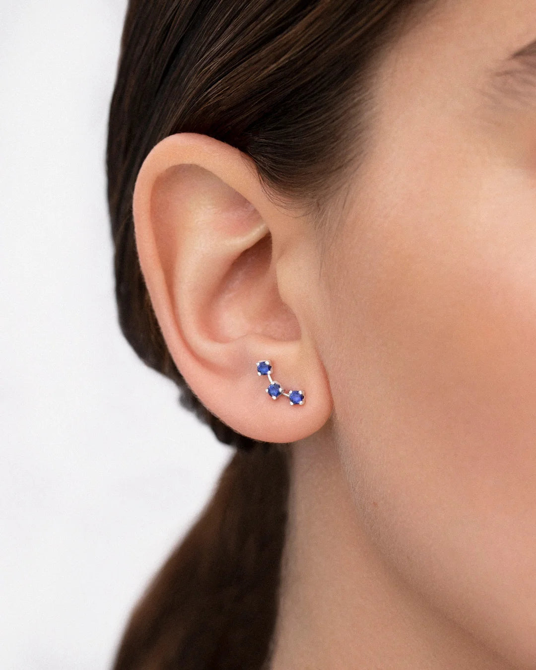 Sapphire Earrings set in 18k white gold. The Essentials in Colours collection has been expanded with a new design in which colour becomes the protagonist of three essential and contemporary pieces of jewelry. The minimalist essence in combination with the contemporary touch that marks the style of the entire collection is also reflected in these three models of Ear Cuff. They feature a delicate curved shape traced by three brilliant-cut sapphires following the shape of the lobe. They incorporate a press fit closure or butterfly earring back in the centre of each of the earrings, contributing to comfort and fit.The Essentials in Colours Earrings are available in three versions with emerald, ruby or sapphire set in 18k yellow gold.