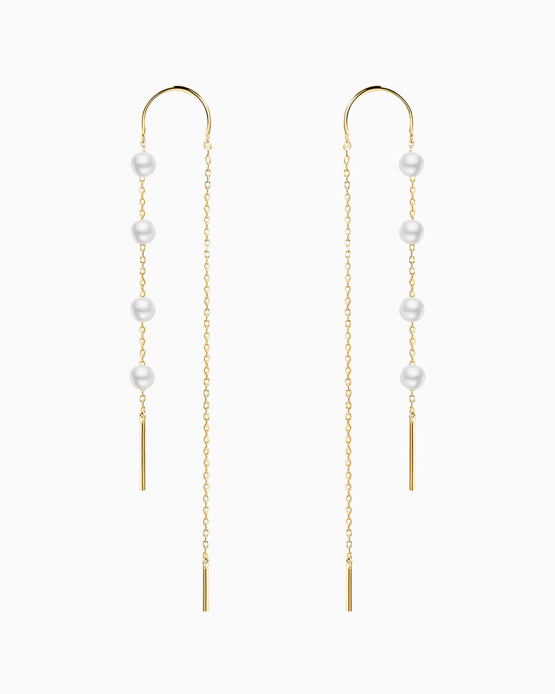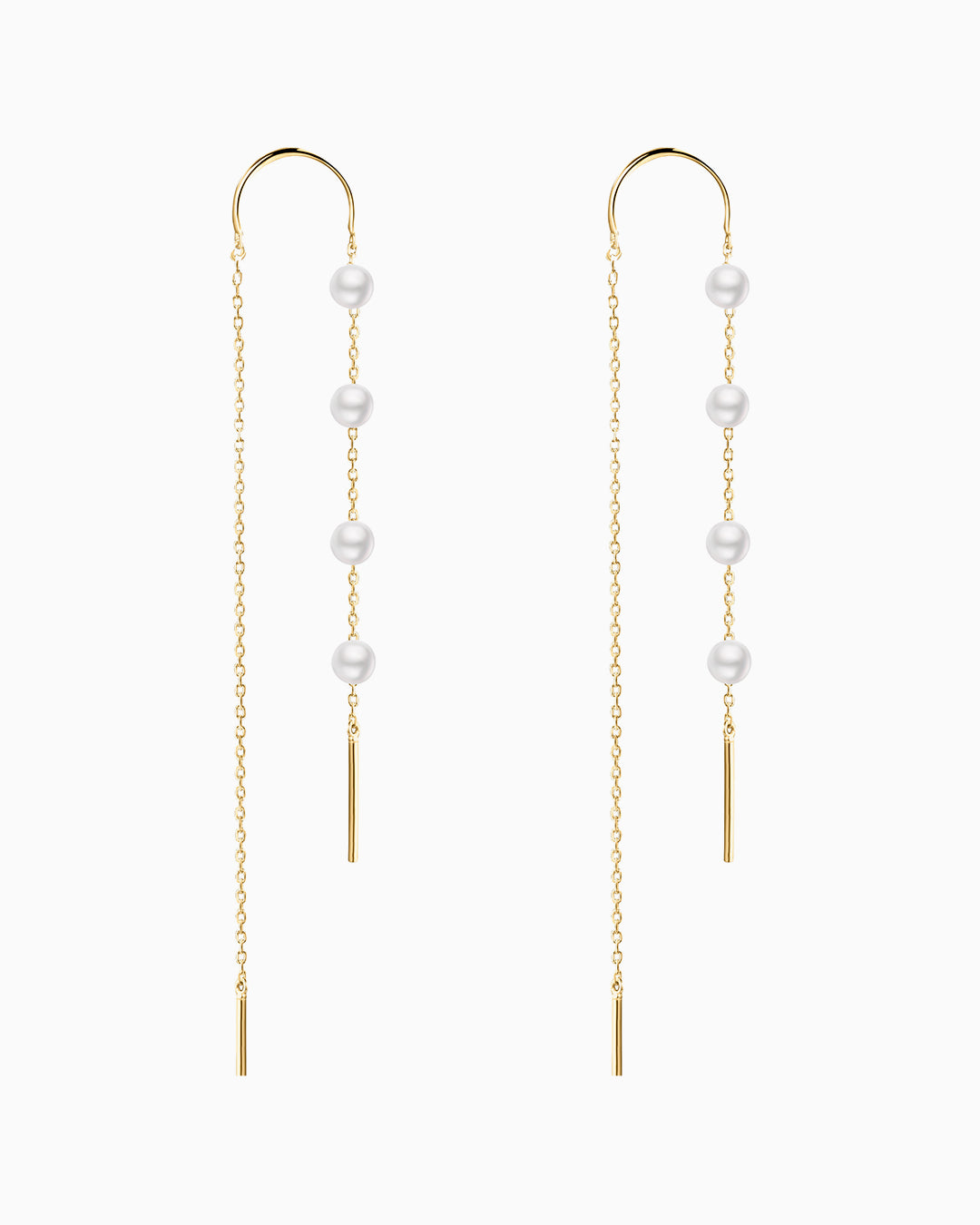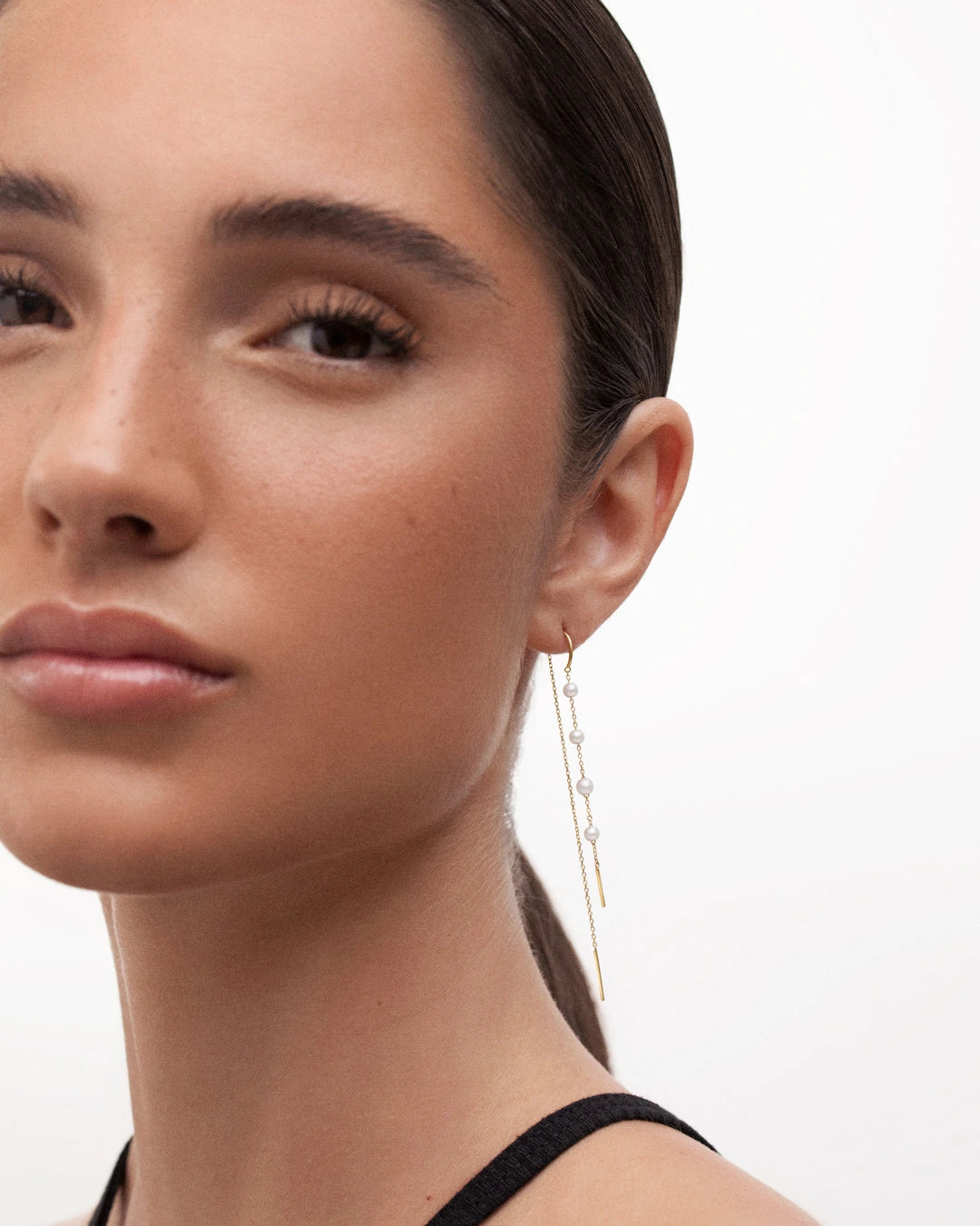 Mabi Blet Pendulum drop earrings strung with natural pearls and crafted from 18k yellow gold. Natural pearls, a traditional symbol of purity and truthfulness, are the ultimate jewelry box staple. Our sophisticated Mabi Blet Pendulum threader earrings are designed to enhance the ethereal beauty of pearls through thin chains for added lightness and movement, so the delicate spheres will glisten from every angle. The perfect balance between minimalism and innovation that defines these captivating drop earrings results in a striking style statement. Wear them to elevate everyday outfits or as a special piece of bridal jewelry for your big day.