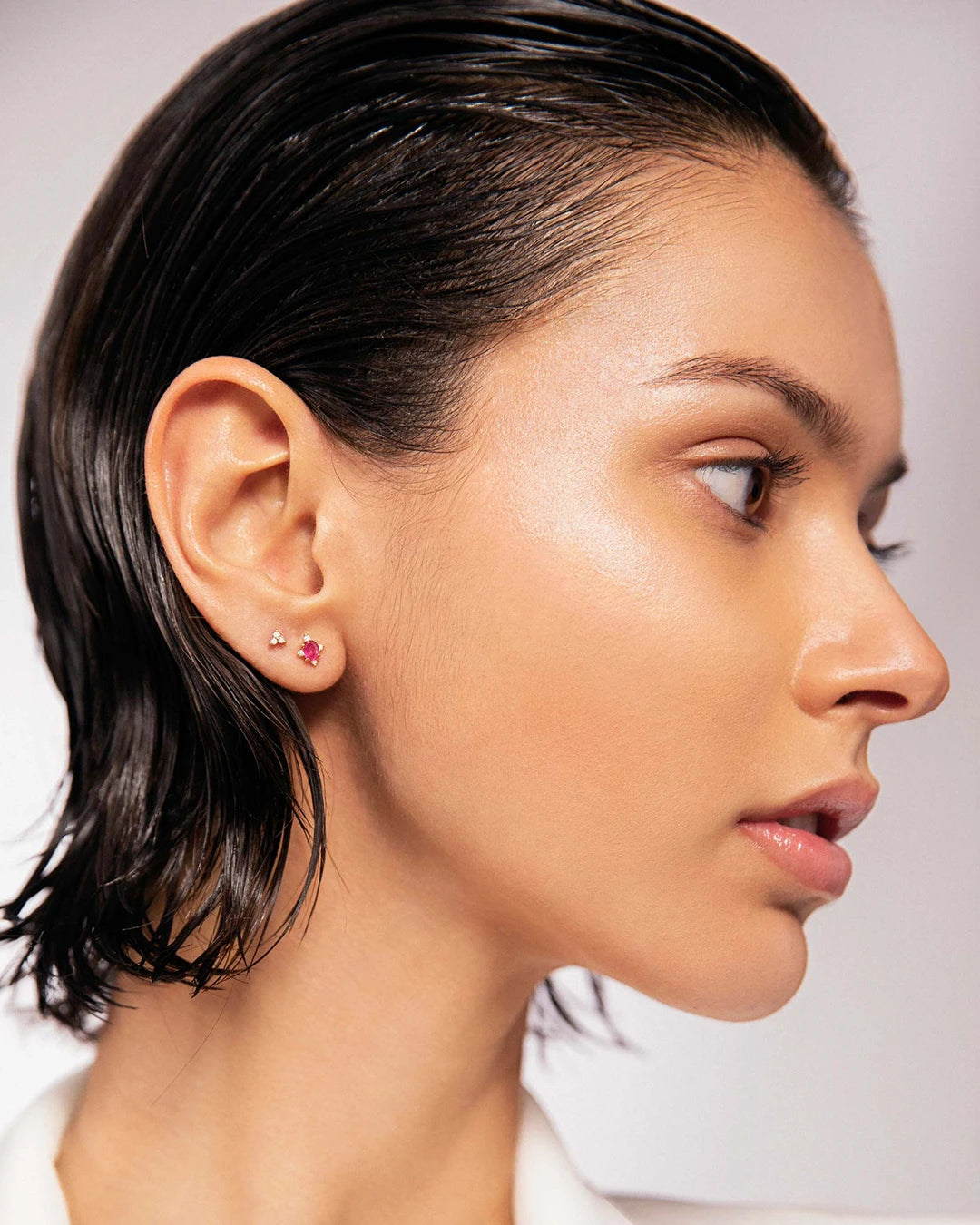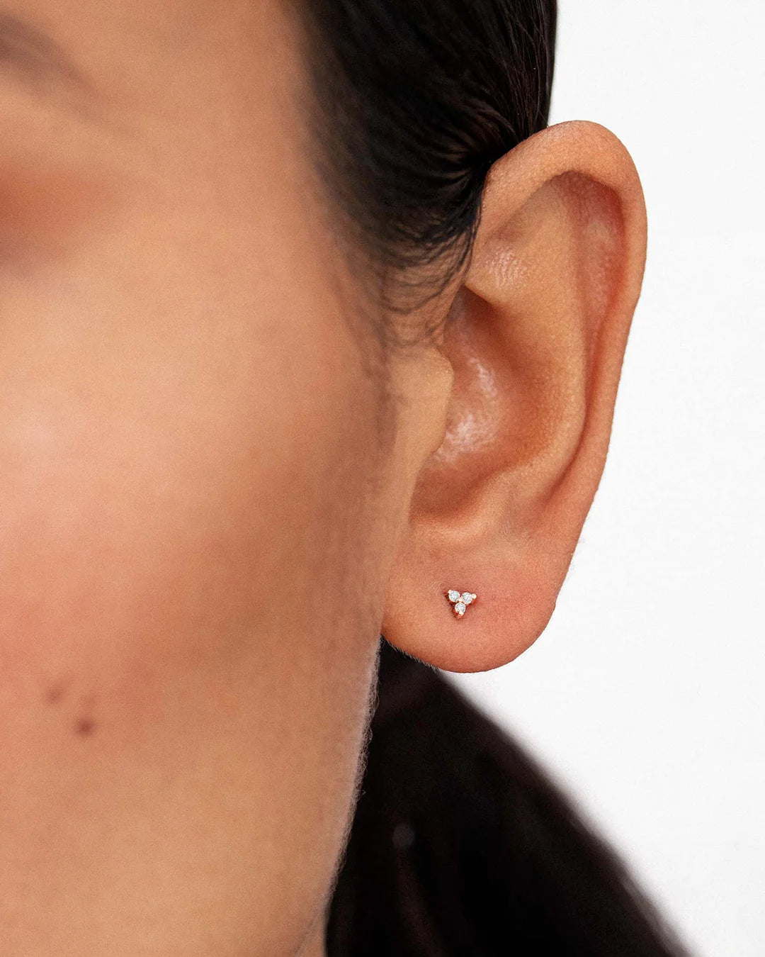 Mini Clover diamond earrings in 18k rose gold. These earrings are a delicate declaration of love and style that you can always carry with you. Available in 18k yellow, rose and white gold with either diamonds, sapphires or emeralds. Stunning gemstones come together to create this three-leaf clover, creating a wonderful amulet from jewels. A striking display of light embodied in a design that combines originality and elegance. These delicate earrings complete the Clover collection, providing a subtle touch of light and sophistication. They have a press fit or butterfly earring back, making them easy to adjust to any angle of the ear.