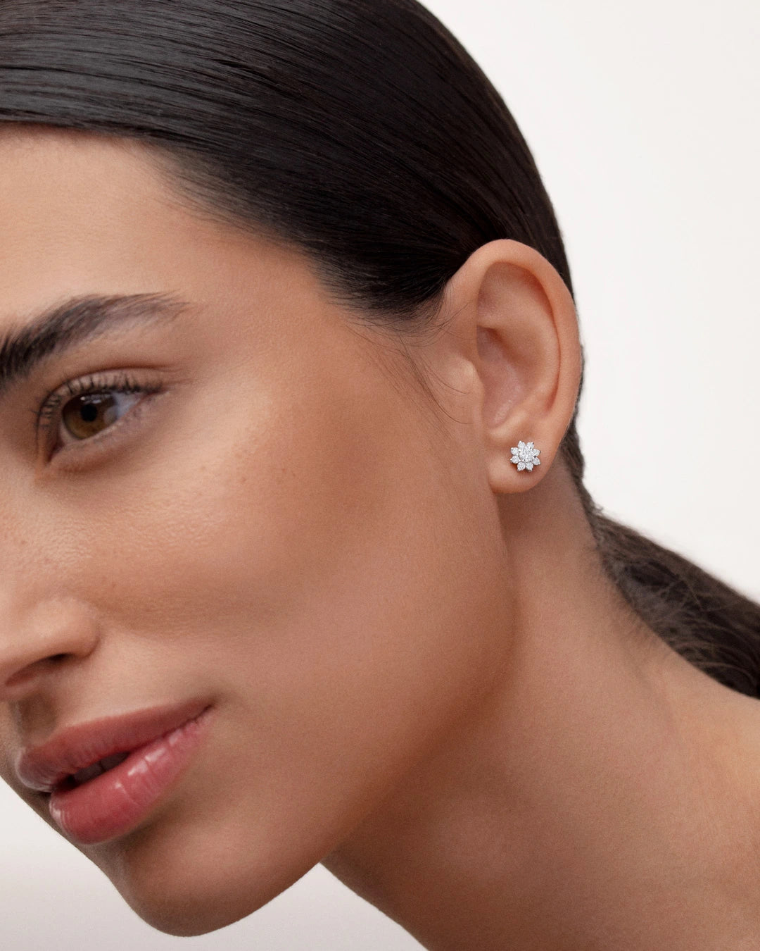 The Rosette solitaire diamond earrings are the main focus of one of our most special collections. Inspired by the reflection of morning light over a rose garden and the delicate drops of water on their petals, this collection is a celebration of the beauty of nature. Both elegant and original, these earrings feature a rosette design with a 0.15 carat solitaire diamond surrounded by glistening diamond petals. A fine jewelry piece with a unique twist, they are perfect for any occasion. Wear them with the other Rosette pieces and elevate your outfits with Mumit's natural diamonds.