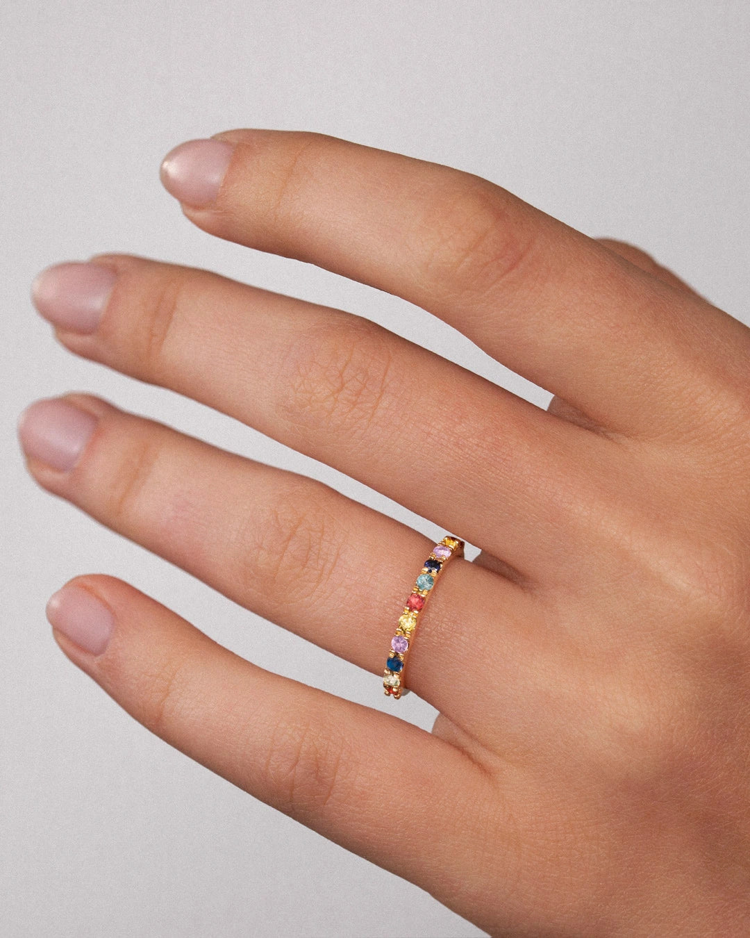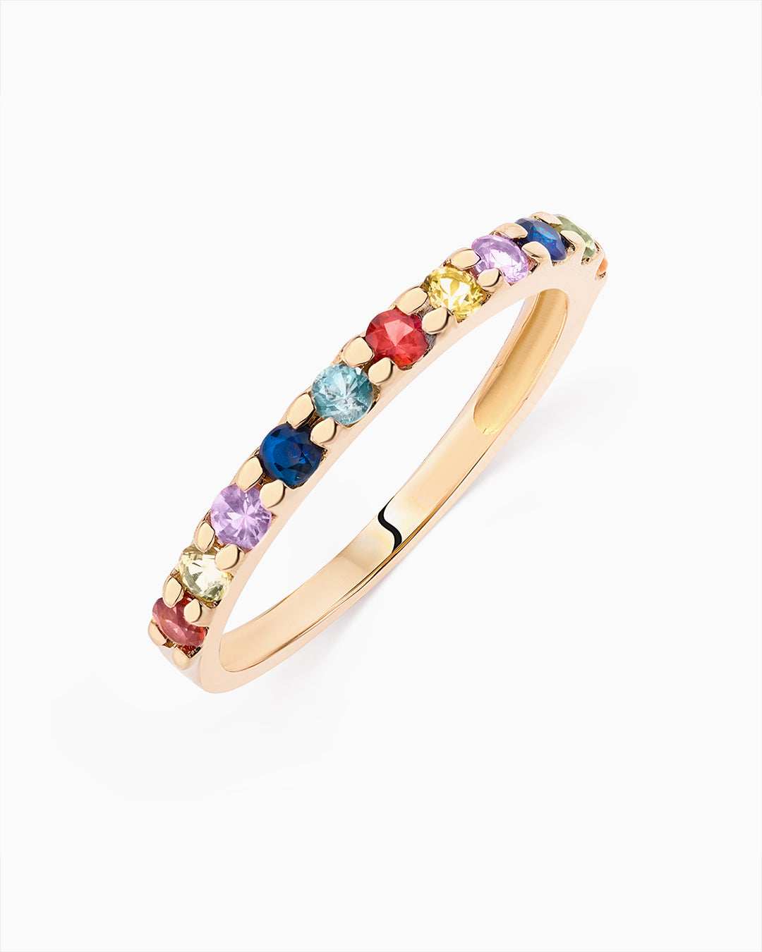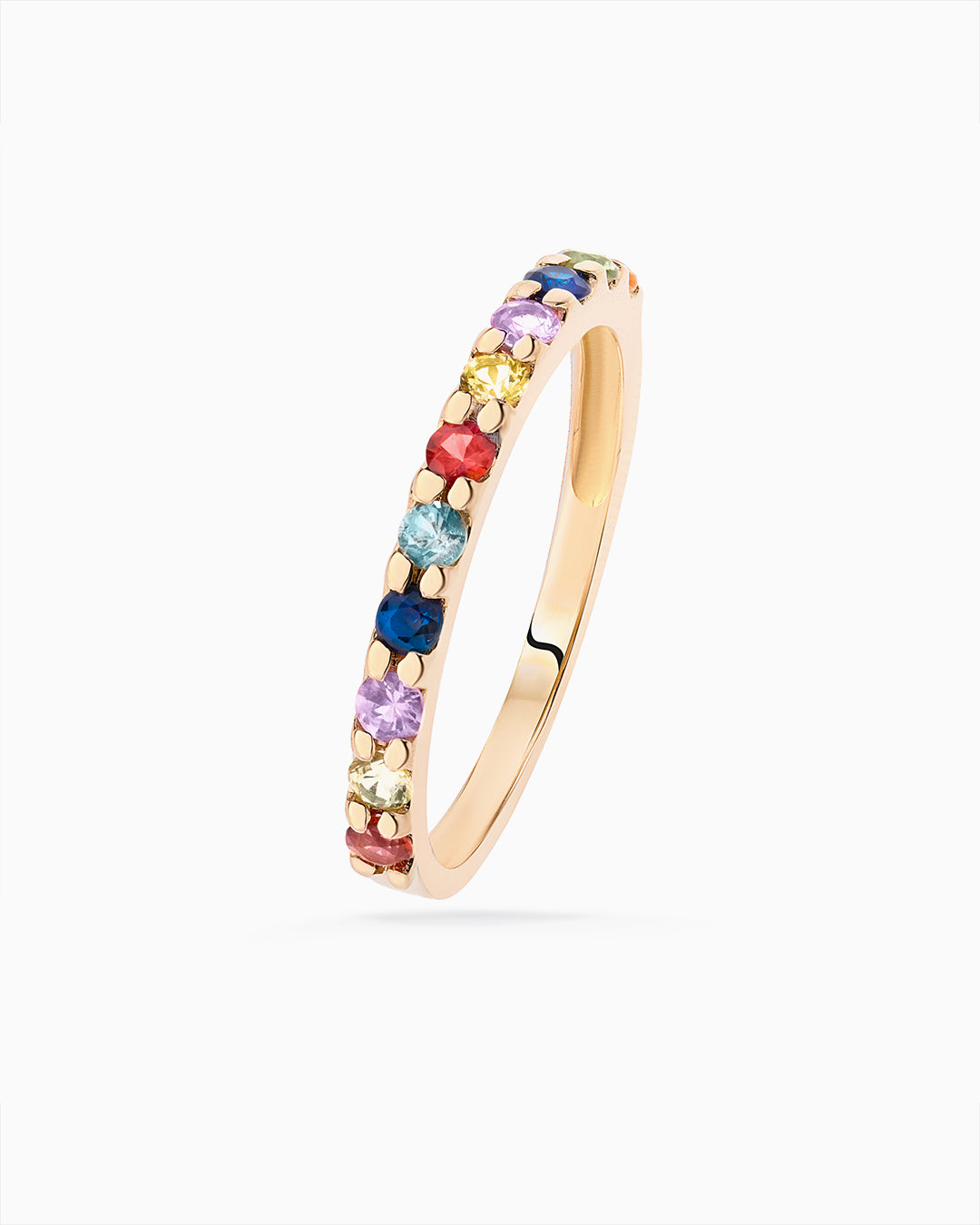 Minzi half eternity ring with multicolour sapphires set in 18k yellow gold. A perfect ring to giv...