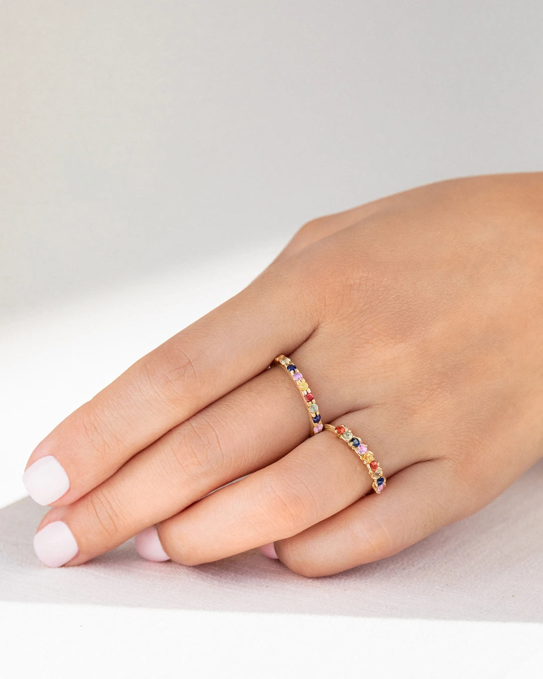 Minzi half eternity ring with multicolour sapphires set in 18k yellow gold. A perfect ring to give on a special occasion, and one that will become a daily essential. It is characterised by its original colours and claw setting design that evokes a delicate coloured diadem. The combination of green, blue, red and lilac tones make this ring a magical piece of jewelry. Perfect to wear alone or to combine with the other Minzi eternity rings in 18k white gold or yellow gold, the result will be incredible. A very special gift that will never be forgotten.