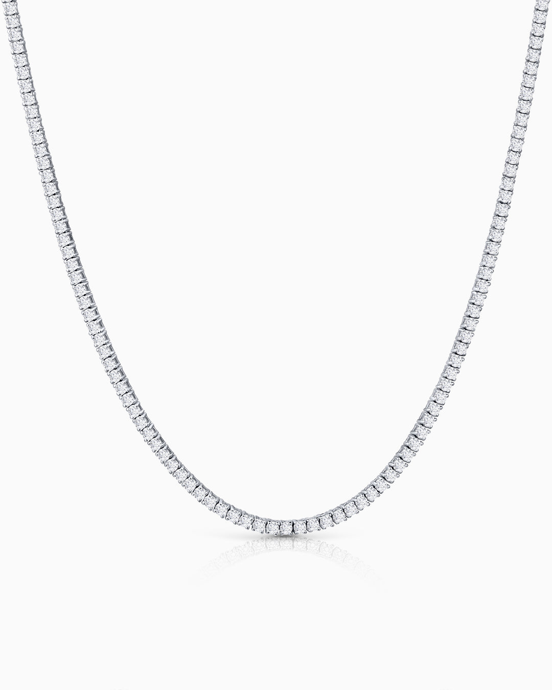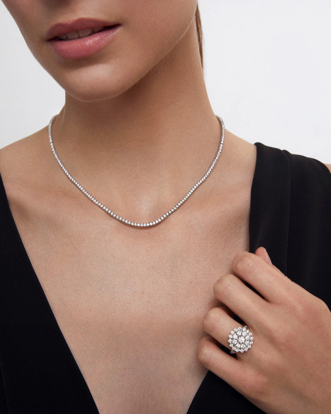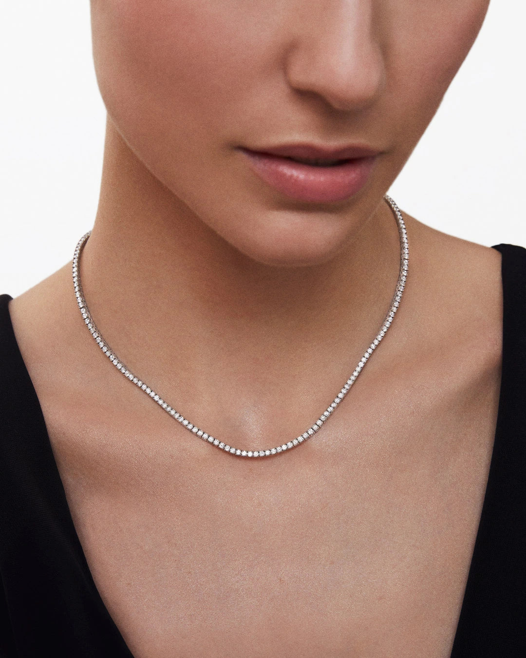 The Alessia necklace is a beautifully crafted rivière featuring a total of 6.55 carats of brilliant-cut diamonds, prized for their clarity and consistency. Creating a piece of this calibre demands expert craftsmanship, ensuring its signature fluidity and refined elegance. Each diamond is meticulously hand-set and linked through a delicate stitching technique, allowing exceptional flexibility. These masterful artisanal skills ensure the necklace sits gracefully around the neck, providing unmatched comfort and a light, effortless feel. More than just a piece of jewelry, the Alessia necklace is an investment that outlasts trends, shining bright during life’s most memorable moments.
