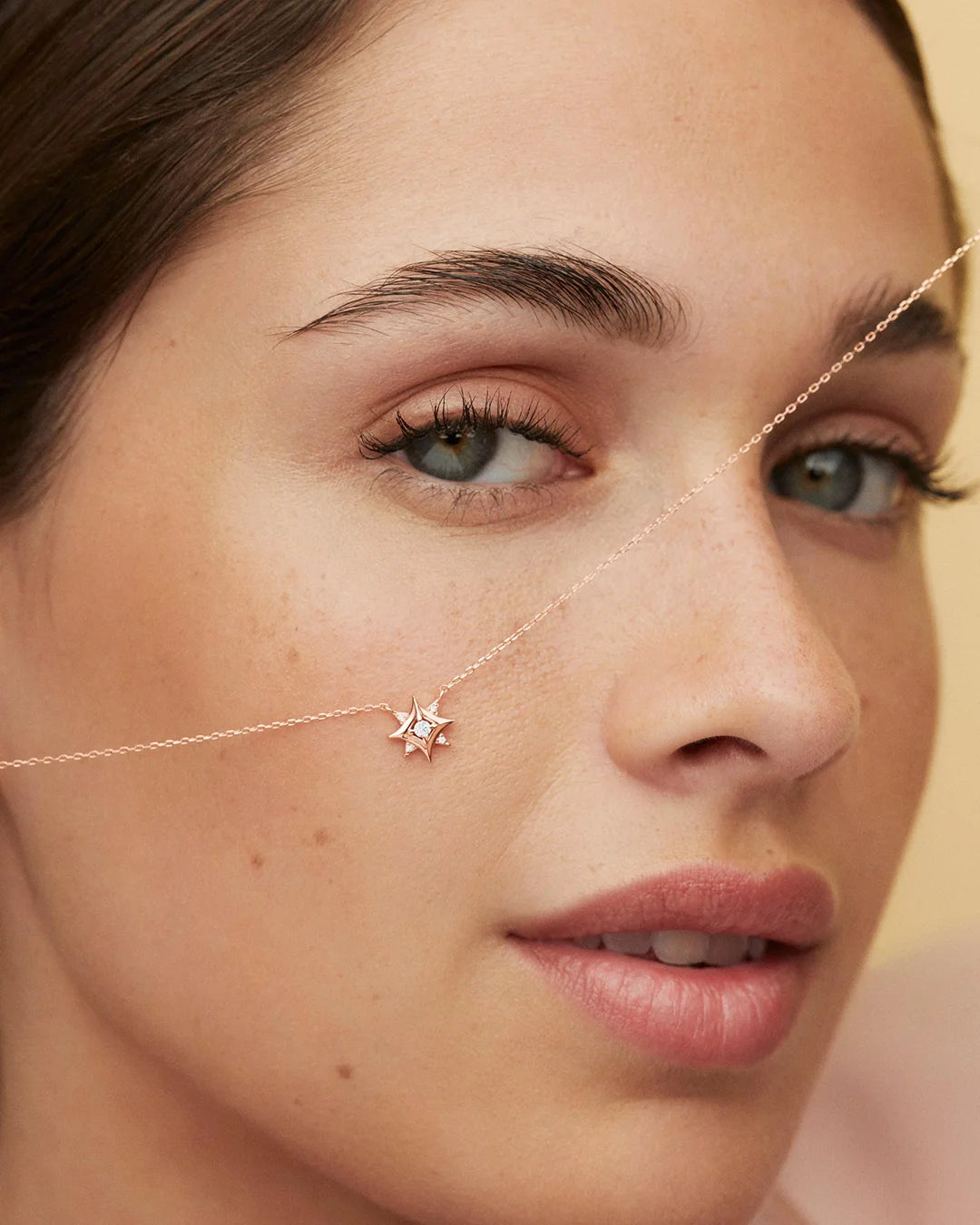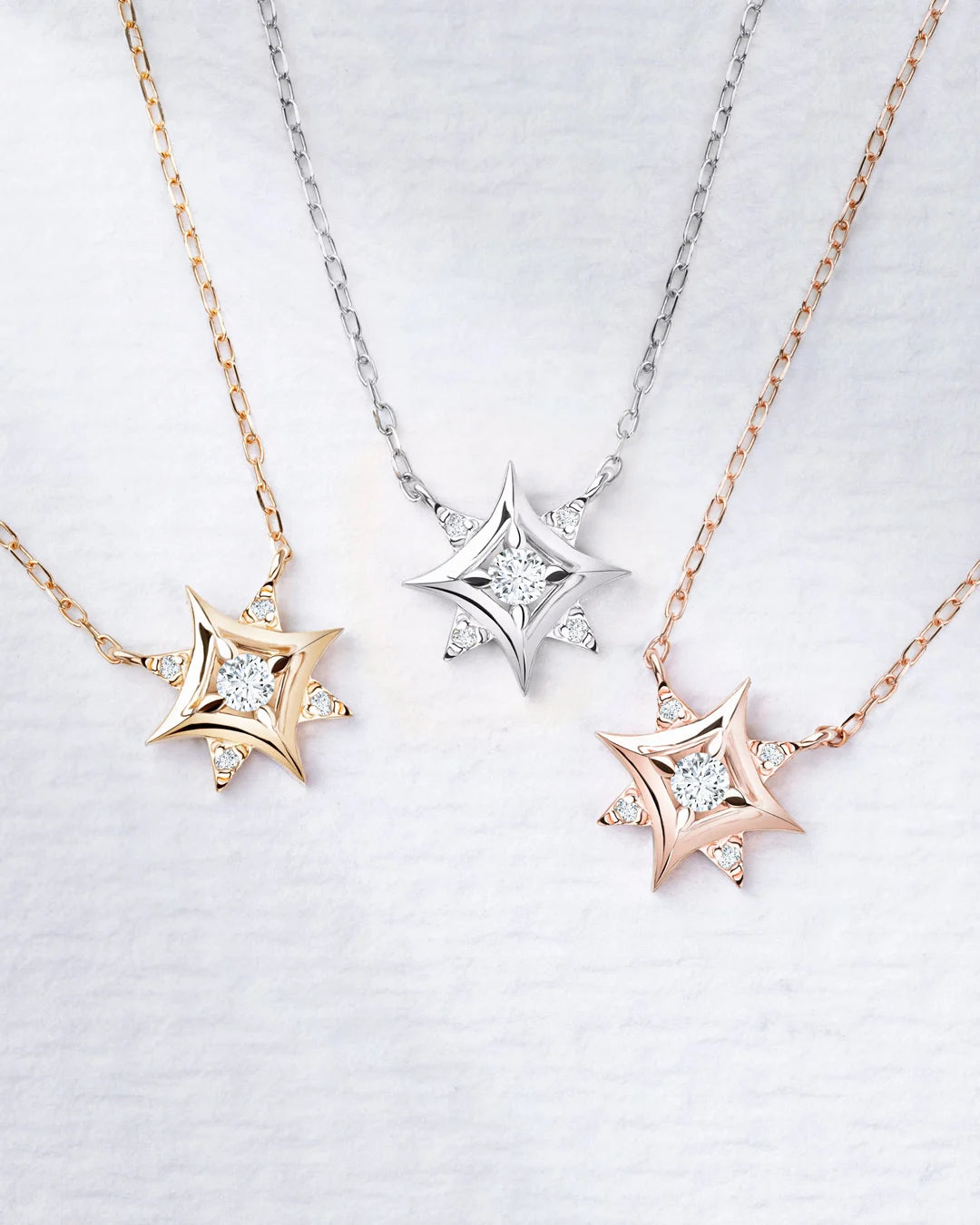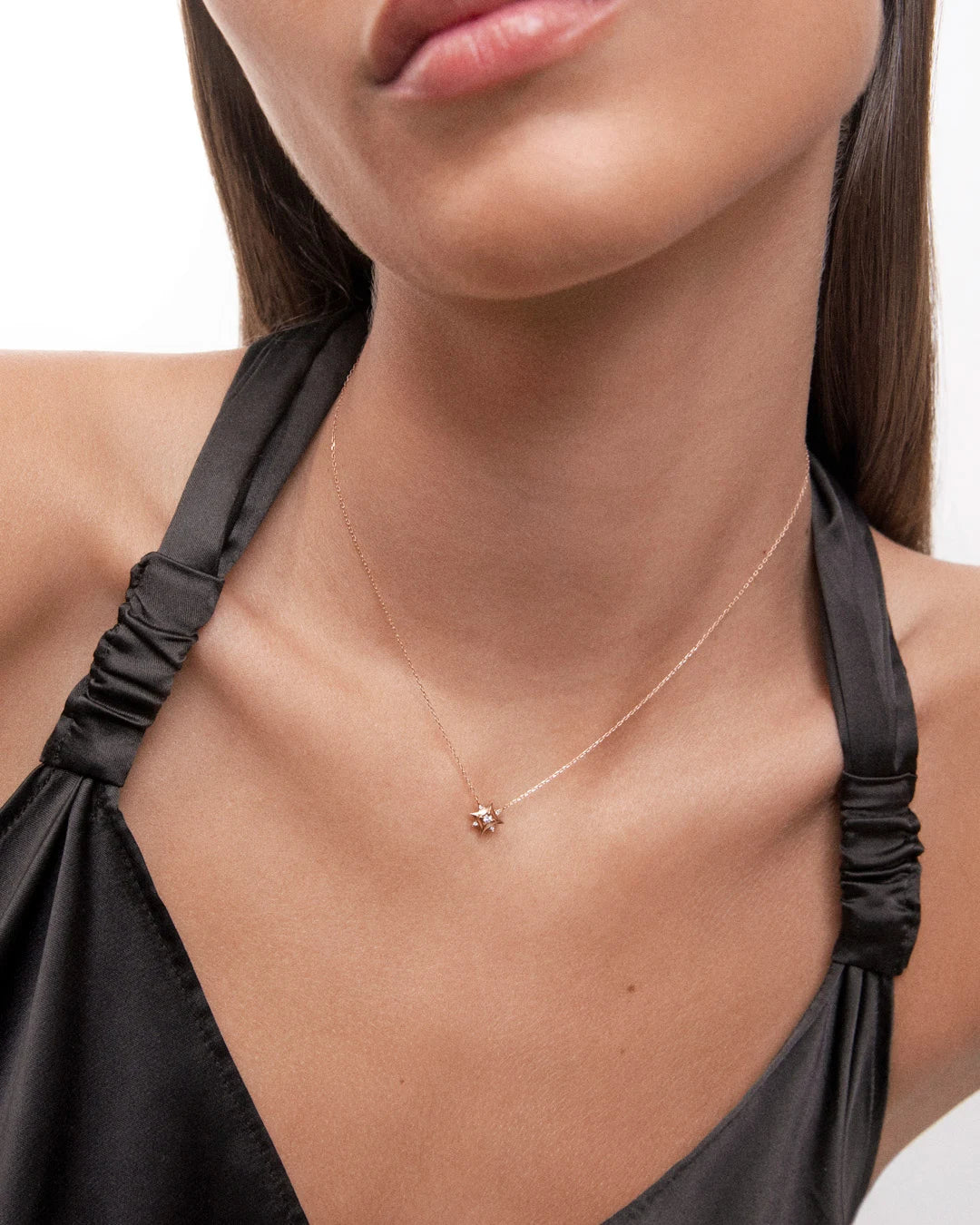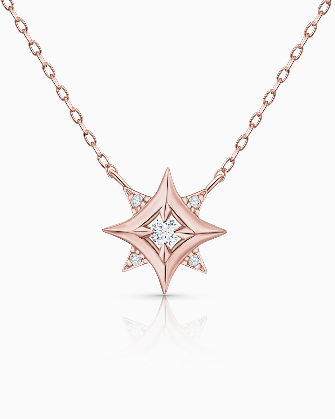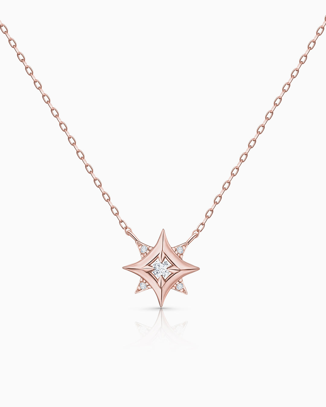 Mimosa Wind Rose necklace made from 18k rose gold with diamonds. Our Mimosa collection is inspired by the eternal light of the stars, shining through the darkest night. Its main motif is a fleur-de-lys inspired star detailed with the four cardinal points of the wind rose. Each point is indicated with a diamond, which also appears at the core of the piece representing the person who wears it. Its original design symbolizes the beginning of a journey, becoming an essential guide so you can always find the way home. This charming necklace is a perfect everyday and forever companion.Our Mimosa Wind Rose necklace is available in three different versions: 18k rose, yellow and white gold.
