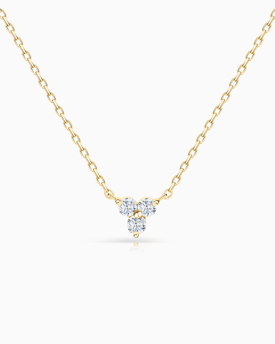 Mini Clover Diamond necklace in 18k yellow gold. This necklace is a beautiful declaration of love that you can always carry with you. Made from 18k yellow gold, its design features three diamonds that come together to create a three-leaf clover, which is said to imbue the wearer with good luck. It is finished with a special Mumit-designed clasp mechanism so that it can be adjusted to the desired length, allowing for easy layering. A captivating piece of jewelry that will ensure you stand out in the crowd with its refined design and contemporary aesthetic.The Mini Clover Diamond necklace is available in three versions, 18k white, rose and yellow gold.