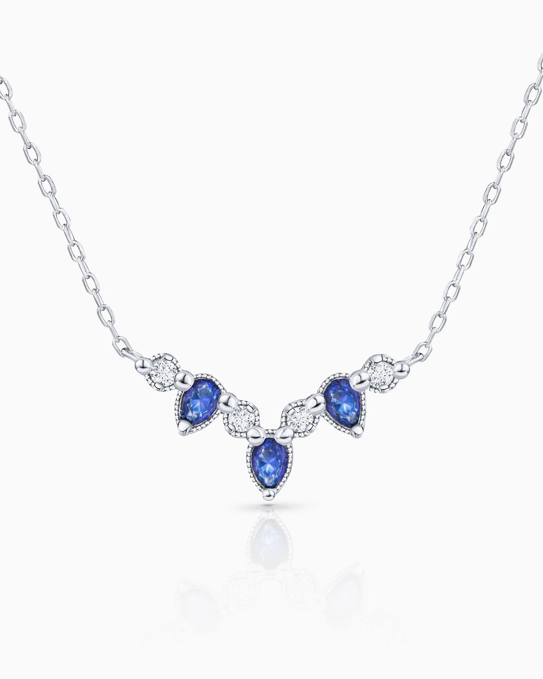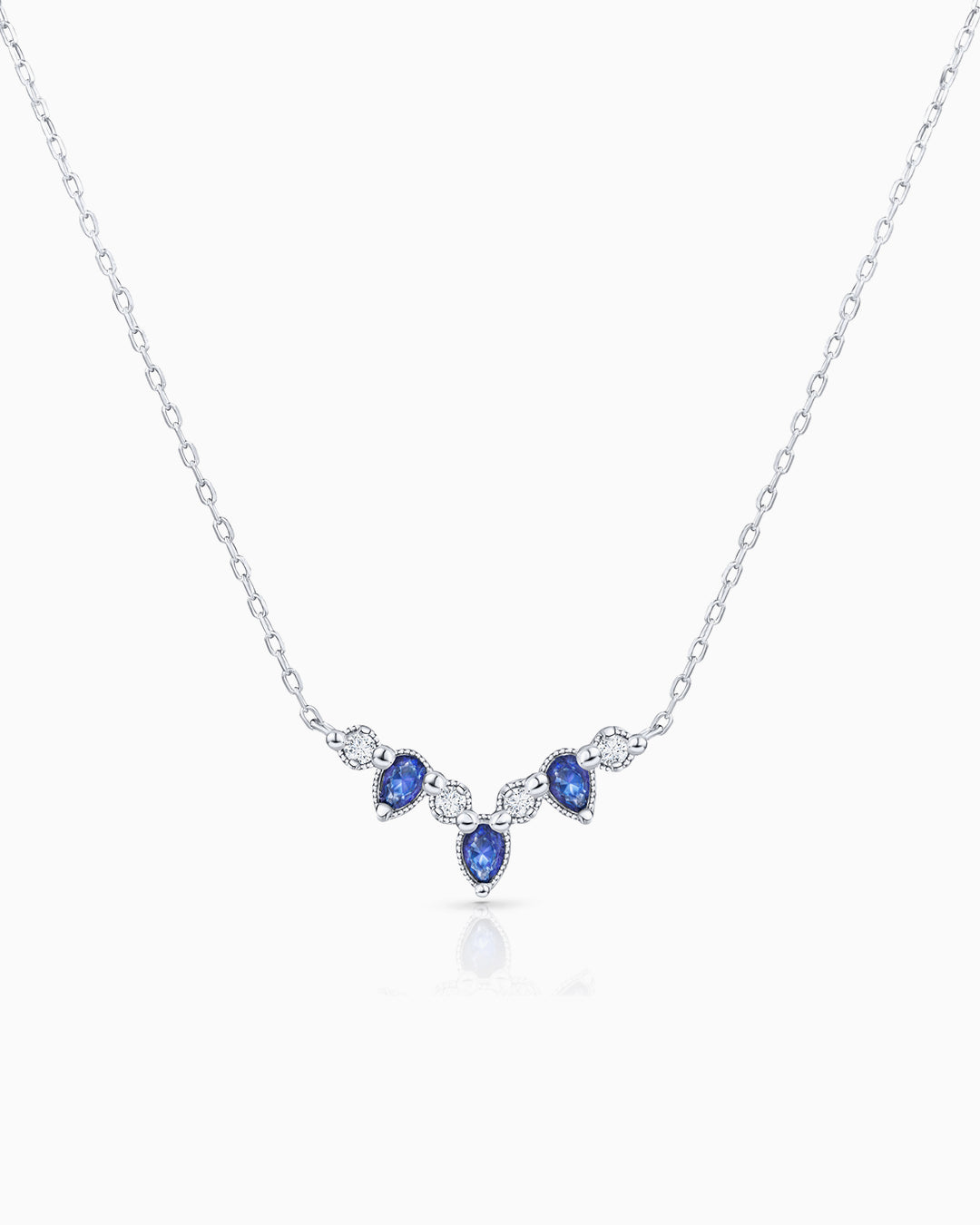 Ondine sapphire and diamond necklace crafted from 18k white gold. Our Ondine collection has a distinctly vintage feel which stems from intricate details such as the subtle and elegant milgrain finish that outlines the silhouette of its pieces. Magnificently nostalgic, the Ondine necklace features an exquisite selection of pear-cut sapphires, spotlighted by gleaming diamonds and framed by milgrain edges. Let Ondine's enigmatic and sophisticated essence shine through and style this unique necklace with the matching collection pieces to add an antique touch to any outfit.