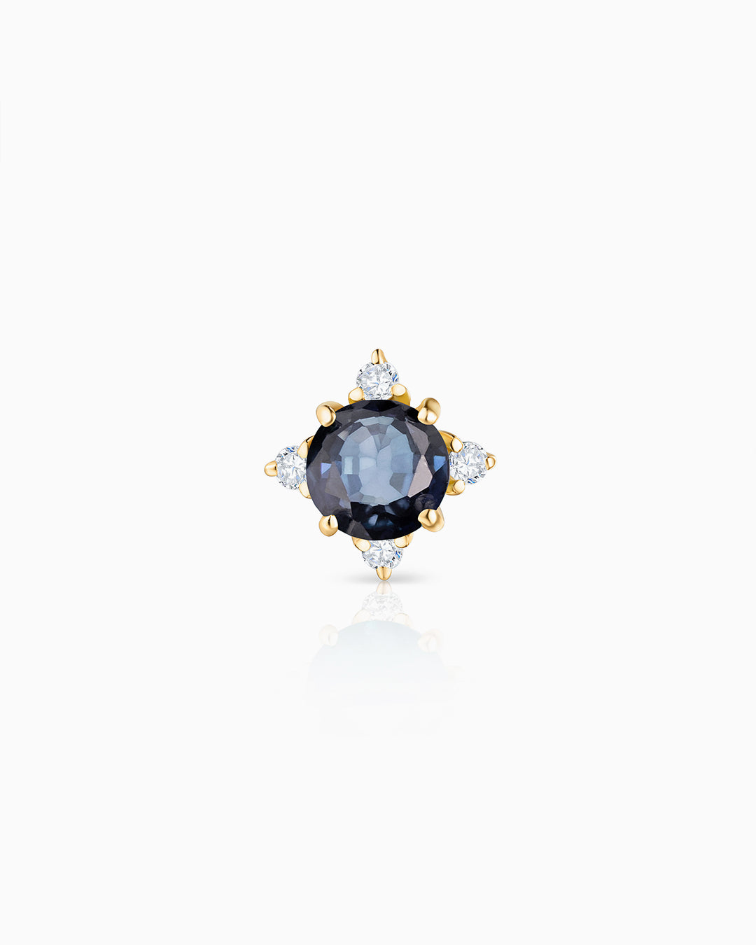 Crown Sapphire piercing earring set in 18k yellow gold. Inspired by the history of royalty that is kept alive through the brilliance of the most precious jewels, the royal crowns and tiaras. The pieces of the Crown collection are exquisite minimalist interpretations of the imposing gemstones that gave life to the Spanish Crown Jewels. A piece of jewelry full of colour and brilliance, the perfect fusion of elegance and modernity featuring a sparkling central brilliant-cut sapphire framed by four brilliant-cut diamonds.Each piercing earring in the Crown collection has been designed taking into account the angles of the ear and its position, making this a perfect piece of jewelry for helix, cartilage and forward helix.The Crown Collection piercing earrings are available in 18k yellow gold and in various versions. The central gemstone can be ruby, emerald or sapphire and the cut can be brilliant, marquise, pear or oval.