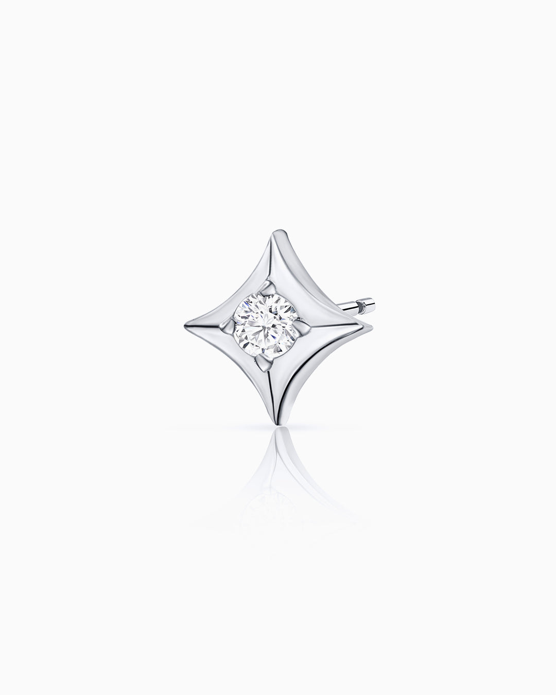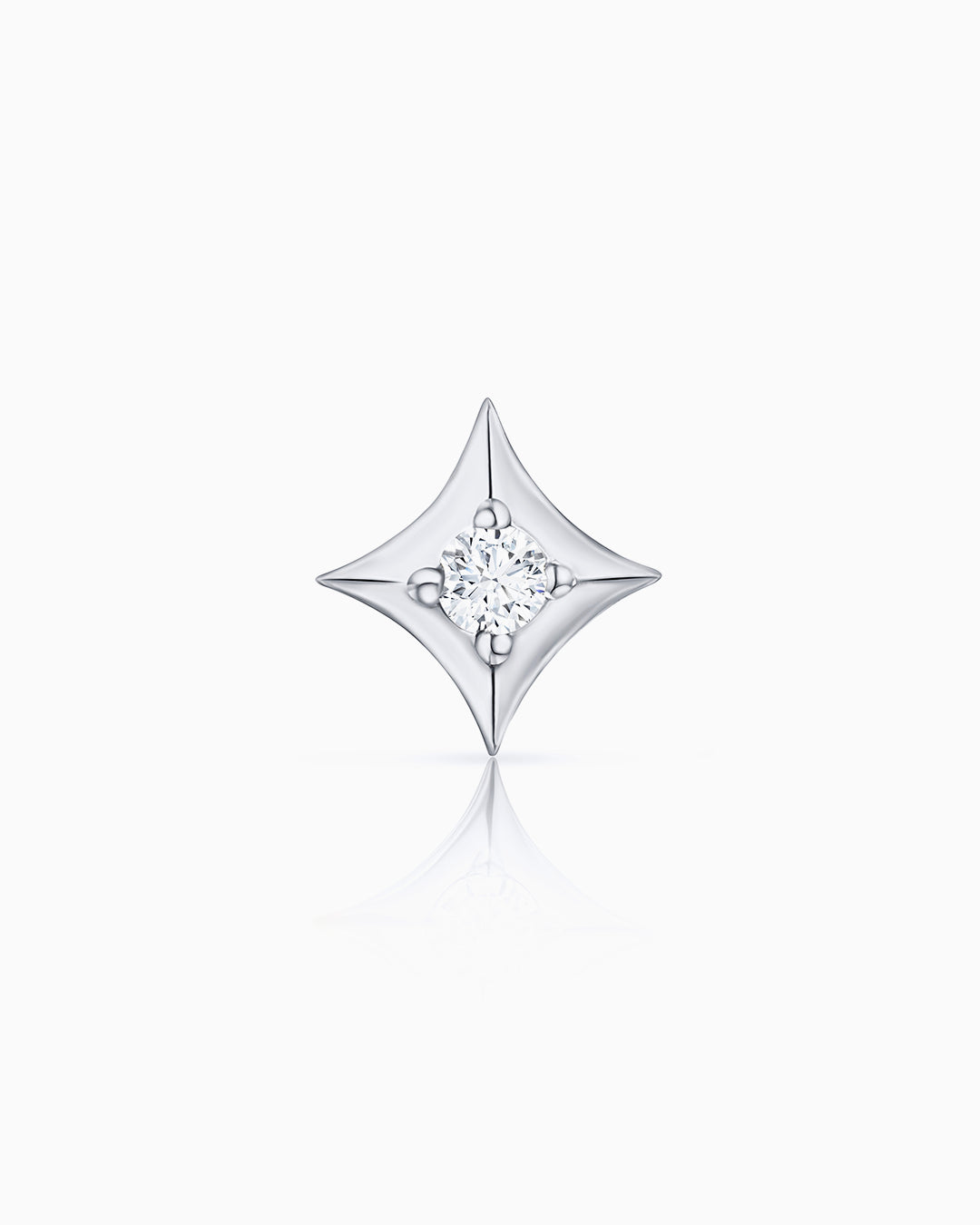 Hadar Wind Rose piercing earring crafted from 18k white gold and set with a central diamond. Hadar collection is inspired by the essence of stars and the light they shine, which has guided sailors and explorers through history. This piece of jewelry is as special as the stars in the night sky, whose light is echoed by a beautiful central diamond. The main motif is a fleur-de-lys inspired star detailed with the four cardinal points of the wind rose. This refined design symbolizes the beginning of a journey, becoming an essential guide so you can always find the way home. Finished with a butterfly closure for added safety and comfort, it is perfect for stacking with other pieces from the collection. This unique piercing earring is an ideal everyday and forever companion.If you wish, you can order it with a special bullet earring safety back ideal for helix or cartilage. This can be ordered from the drop-down menu above (this option has an additional cost of €6). Additionally, you can order a special flat back earring post (this option has an additional cost of €25). Join the piercing party and style your ears with Mumit!