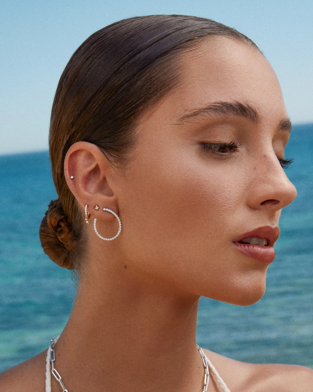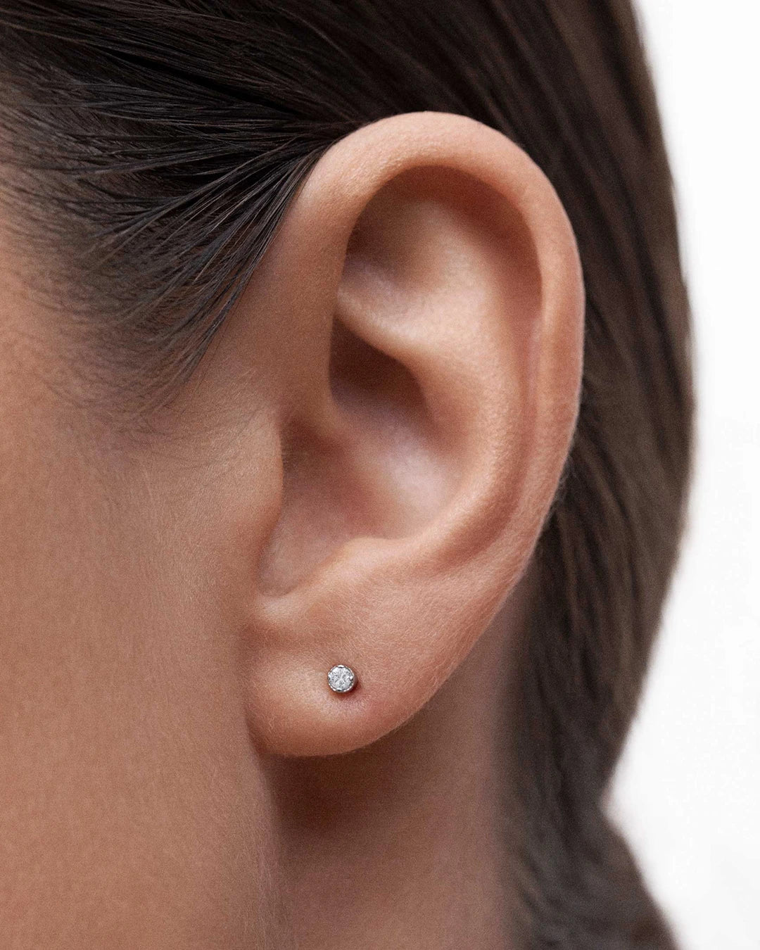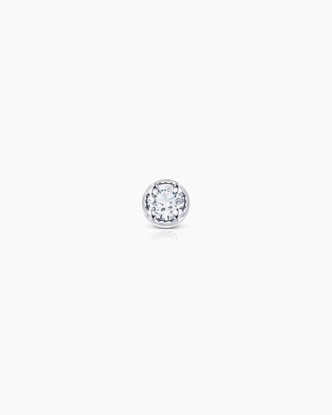 Petit Milgrain diamond piercing earring set in 18k white gold. Our Milgrain collection is defined by a minimalist vintage-inspired aesthetic, reflected in the subtle nod to the past of its milgrain setting. Cast in the shape of a dazzling solitaire stud, the unique Petit Milgrain earring is intricately carved with a milgrain pattern and designed to look like the glistening diamond is floating on your skin. Finished with a butterfly back for added safety and comfort, it is perfect for stacking with other pieces from the collection. You'll love wearing this subtly retro earring. The Petit Milgrain piercing earring is available in three different types of 18k gold: rose, yellow and white.If you wish, you can order it with a special bullet earring safety back ideal for helix or cartilage. This can be ordered from the drop-down menu above (this option has an additional cost of €6). Additionally, you can order a special flat back earring post (this option has an additional cost of €25). Join the piercing party and style your ears with Mumit!