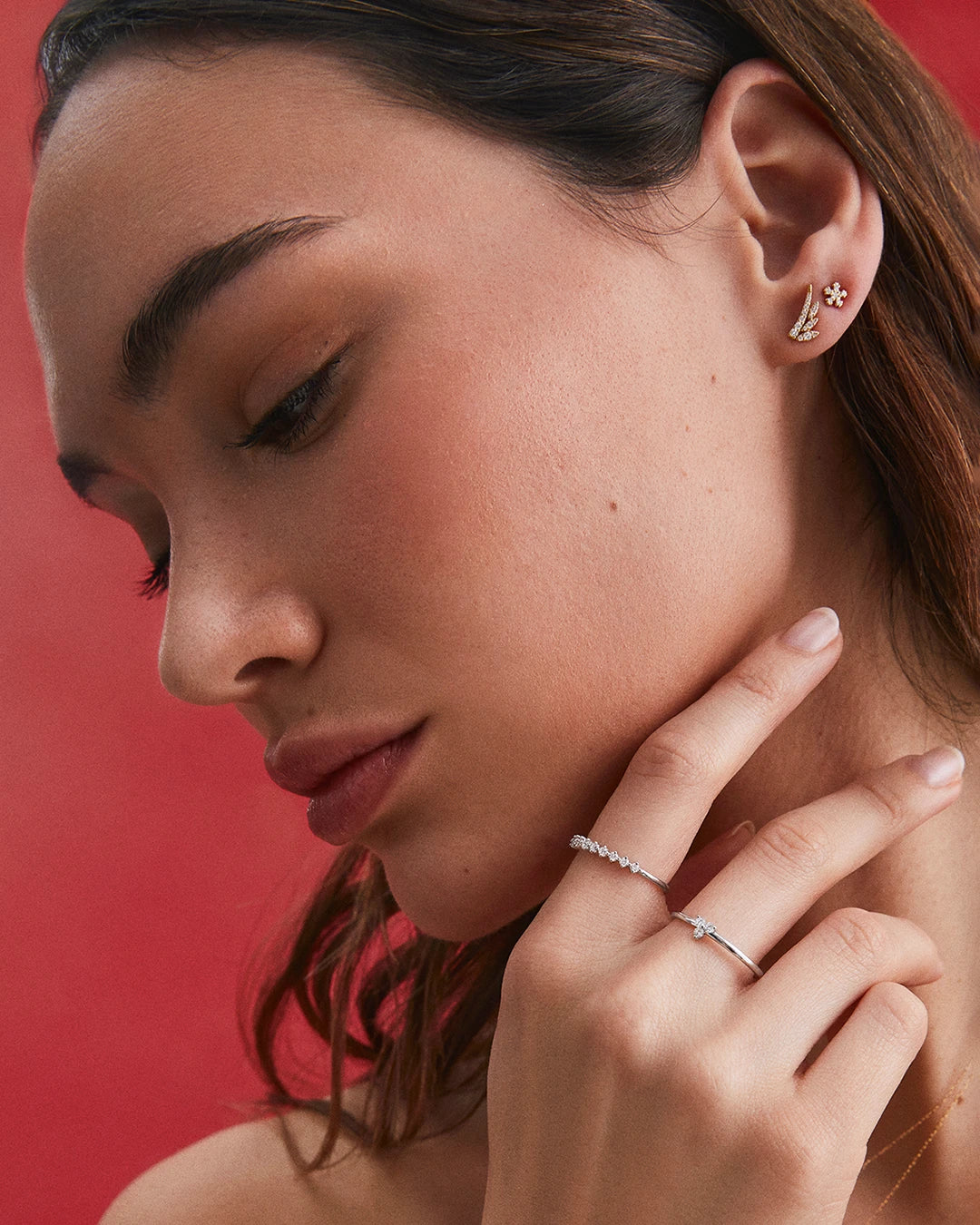 Star Petals piercing earring in 18k yellow gold with diamonds. Our Star Petals earring is inspired by the delicate petals of an enchanting flower and the stunningly natural simplicity of its silhouette. Its feminine essence radiates with pure beauty, adding a unique touch of light through the delicate diamonds that cover its surface. This charming earring can be mixed and matched with different studs and hoops to create unique ear stacks that are suitable for both everyday wear and special occasions. Discover the ultimate jewelry box staple for understated elegance. The Star Petals piercing earring is available in two different types of 18k gold: yellow and white. If you wish, you can order it with a special bullet earring safety back ideal for helix or cartilage. This can be ordered from the drop-down menu above (this option has an additional cost of €6). Additionally, you can order a special flat back earring post (this option has an additional cost of €25). Join the piercing party and style your ears with Mumit!
