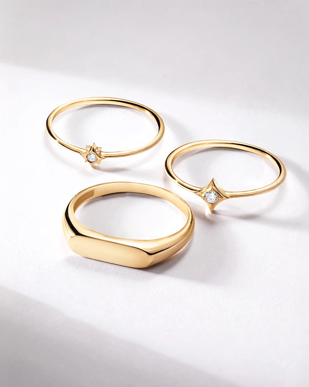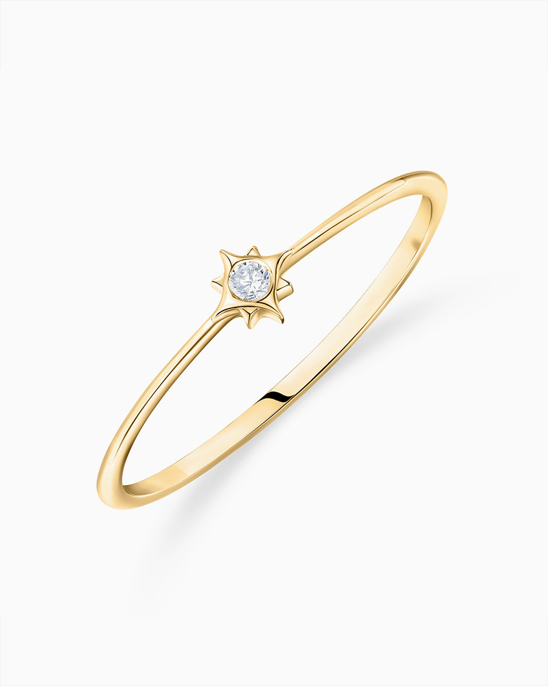 Petit Wind Rose ring with a central diamond cast from 18k yellow gold. Inspired by the navigation compass traditionally used by sailors, the mini version of our iconic Wind Rose collection symbolizes the beginning of a thrilling journey towards an undiscovered horizon. The main motif is a four-pointed star detailed with the four cardinal points of the wind rose and set with a central 0.015 carat diamond that will guide the wearer with its everlasting light. This unique ring is the perfect companion for your next adventure, wear it with the other Wind Rose pieces and create your own Mumit look. The Petit Wind Rose ring is available in three different types of 18k gold: rose, yellow and white.