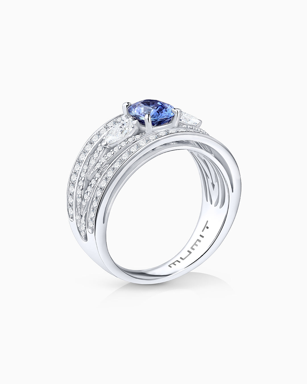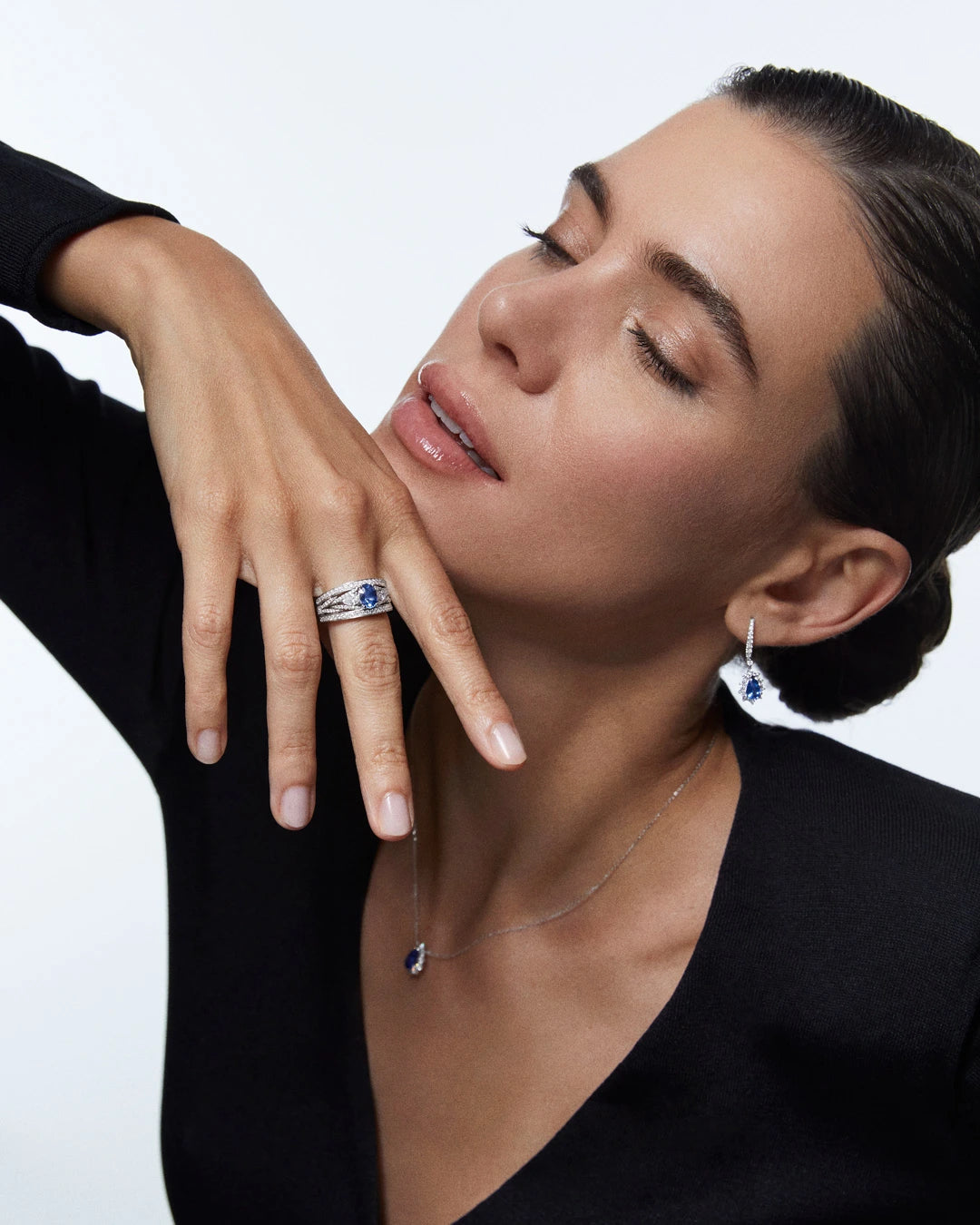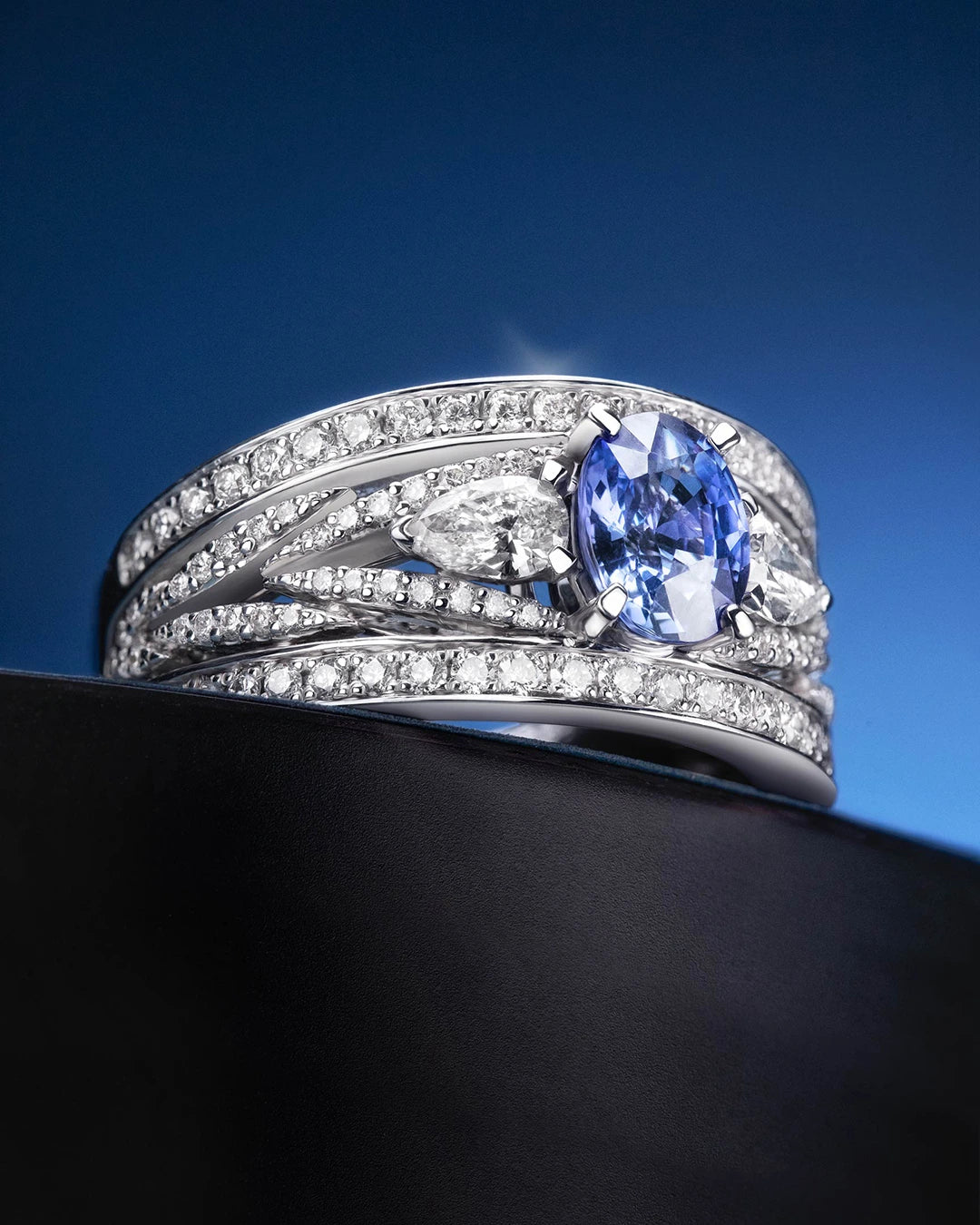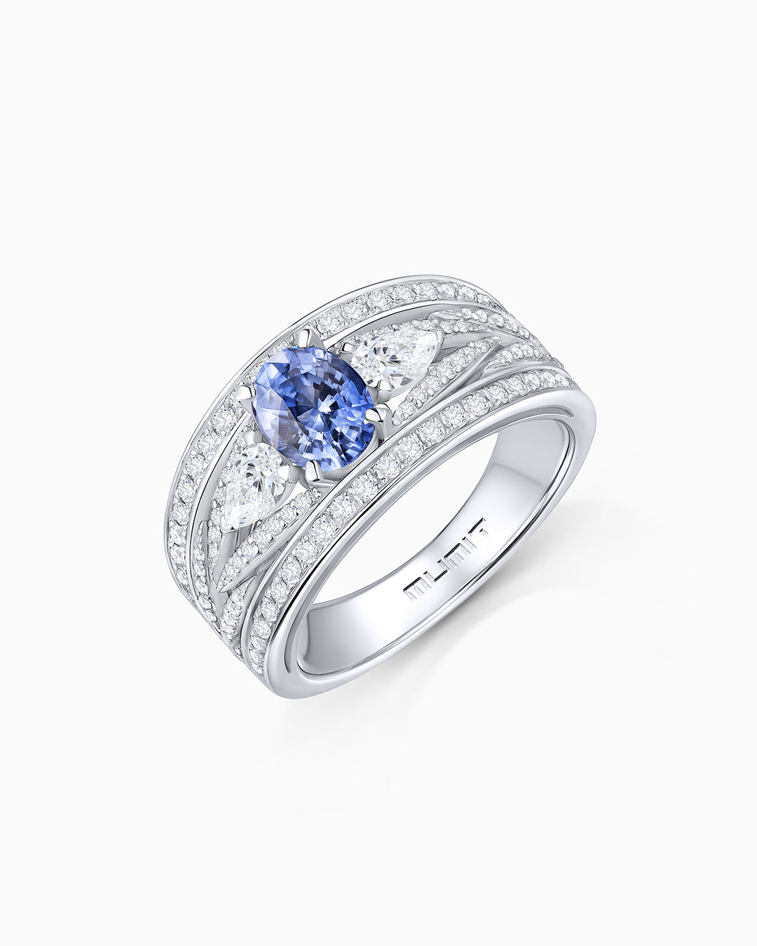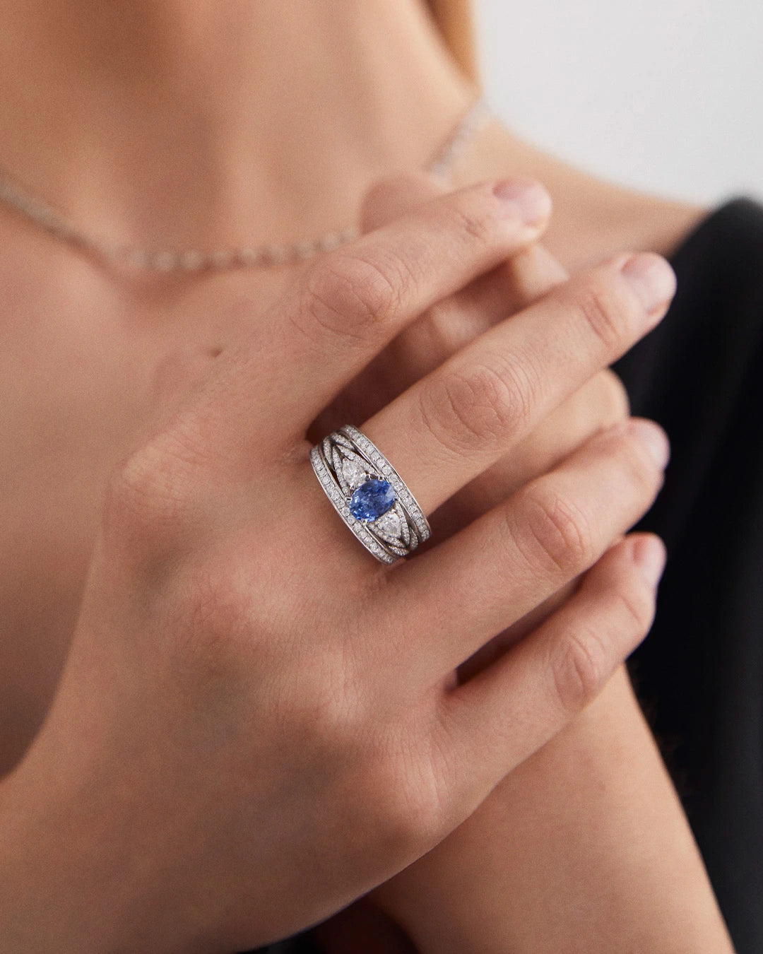 Taking inspiration from Sri Lanka’s legendary gemstone riches, the Ceylon collection pays tribute to Ratnapura, one of the world’s historic mineral centres. Renowned for their remarkable clarity and exceptionally rich colour, sapphires from this region are considered among the finest in the world. Within the collection, the Queen of Ceylon ring stands out for its sculptural silhouette and interwoven lines, evoking the elegance of a crown jewel. A Sri Lankan sapphire sits at its centre, flanked by two pear-cut natural diamonds. Their soft curves enhance the overall harmony of the design, drawing attention to the beauty of the sapphire. Likewise, the double band is set with a delicate diamond pavé that frames the central motif, amplifying its brilliance from every angle. A truly majestic jewel, reserved for those who recognise true rarity.