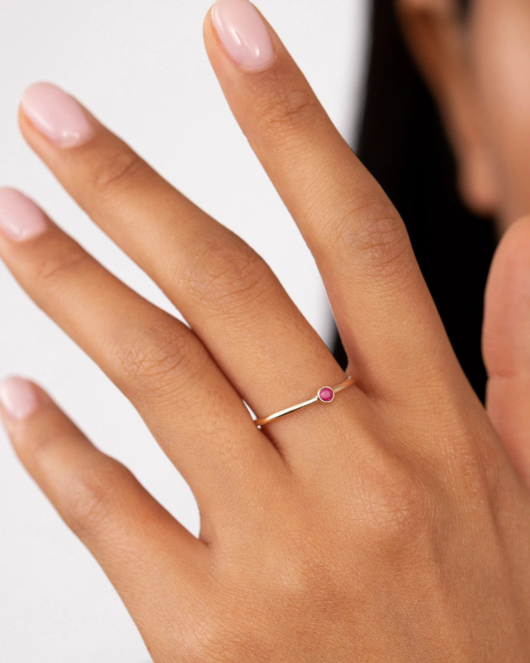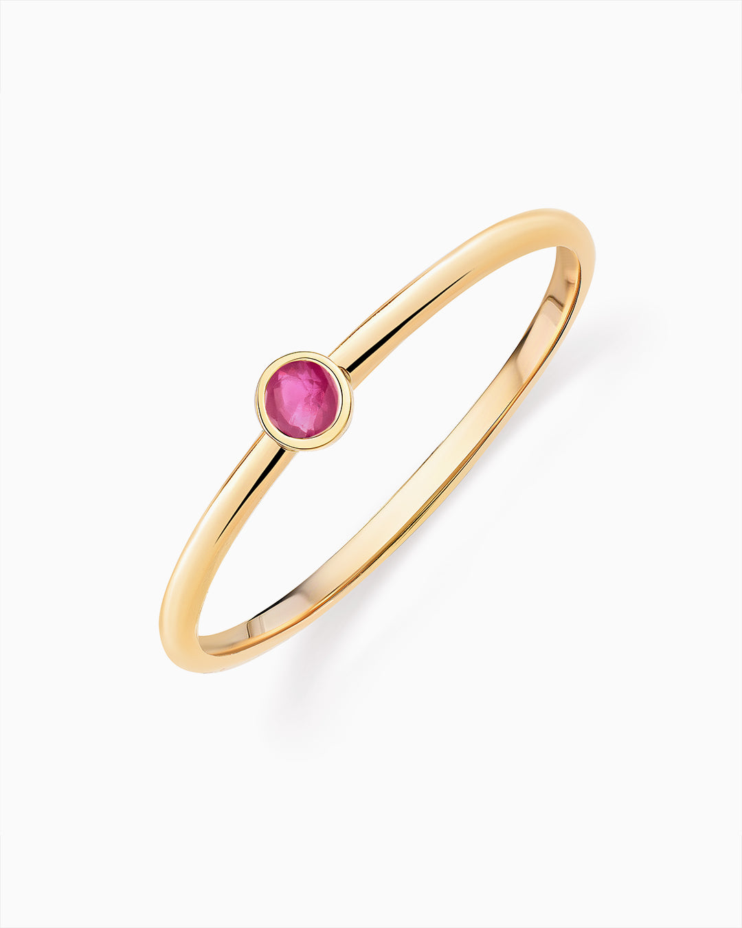Stud Colours ring with central ruby set in 18k yellow gold setting. Delicate and shimmering, this beautiful ring with its clean lines and contemporary aesthetic is the everyday touch of colour you’ve been looking for. This is a solitaire ring with a magical central bezel set ruby that provides that touch of originality that characterises each Mumit piece. A design with a touch of simplicity that makes it timeless. Its timeless aesthetic means that this ring can be worn alone or combined with others. The ring is of fine solid gold, which means it is comfortable enough to wear in your everyday adventures. The Stud Colours ring is available in three versions, with emerald, ruby, or sapphire in 18k yellow gold.