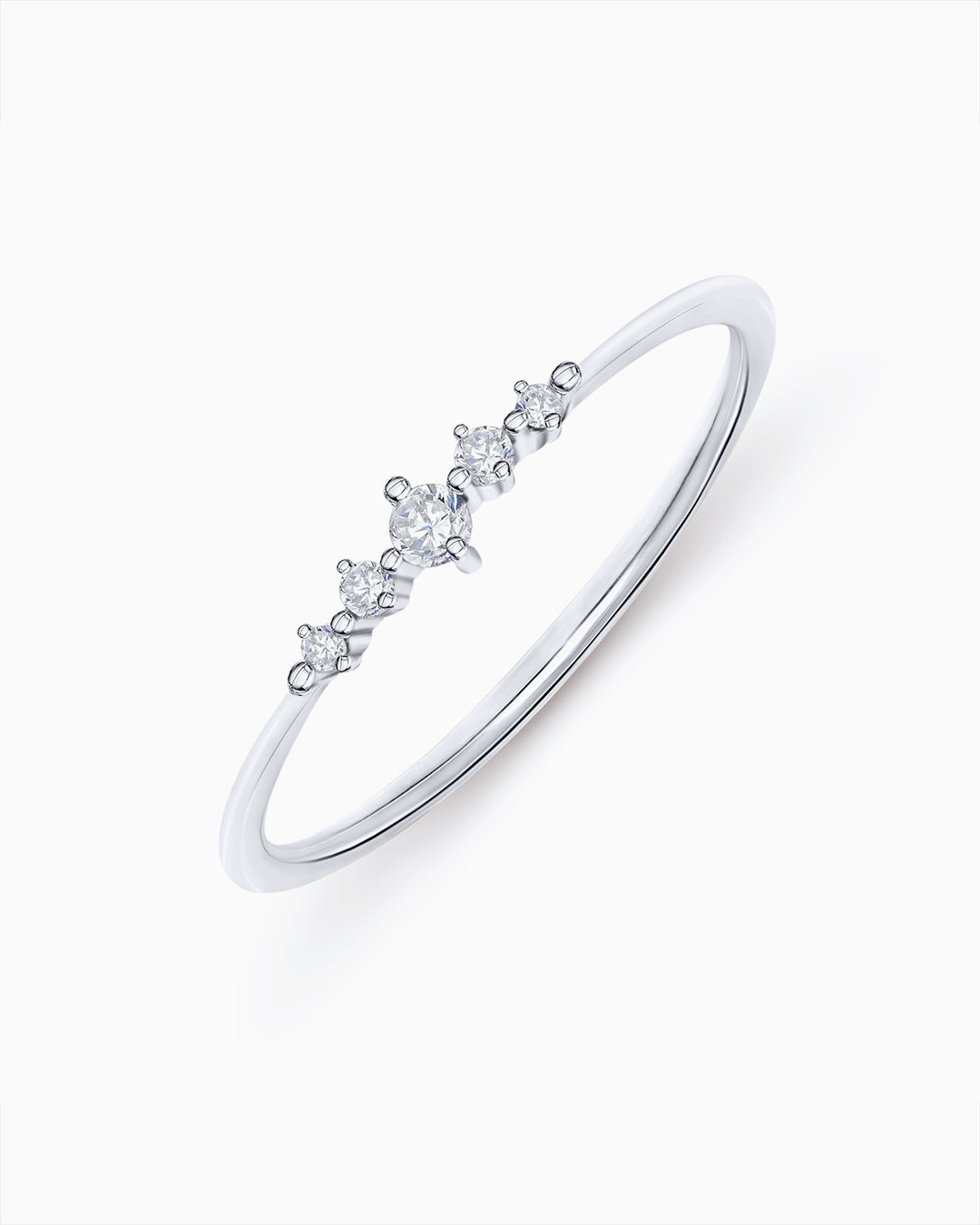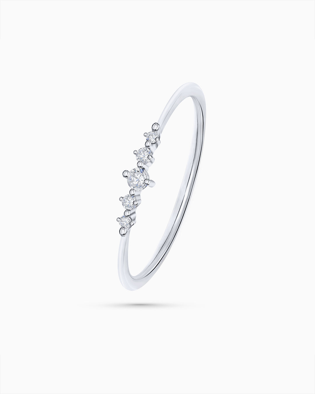 Valerie diamond ring in 18k white gold. Its design of brilliant-cut diamonds set in claws allows the maximum passage of light, achieving a unique piece of jewelry with an amazing brilliance and display of light. The Valerie Ring combines elegance and modernity. Combine it with the other rings in the collection to create a unique and personal play of colours. Available in 18k rose gold with ruby, yellow gold with emerald, and white gold with sapphire.