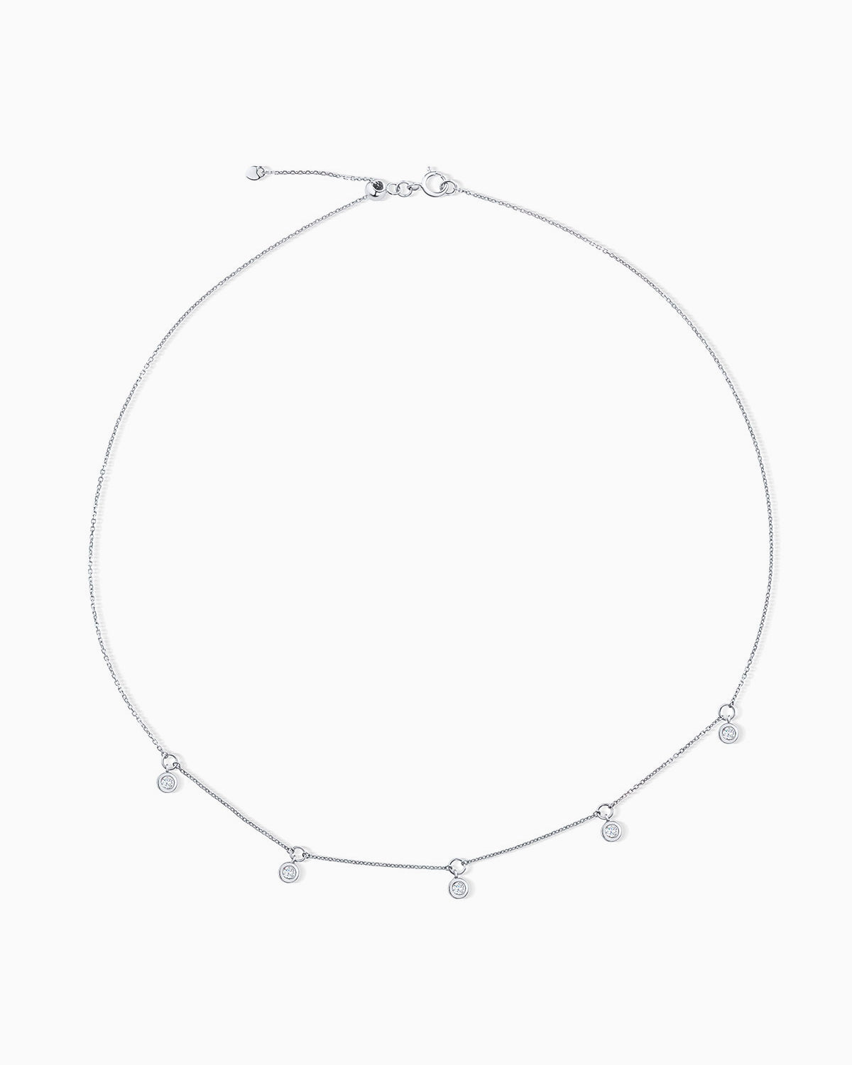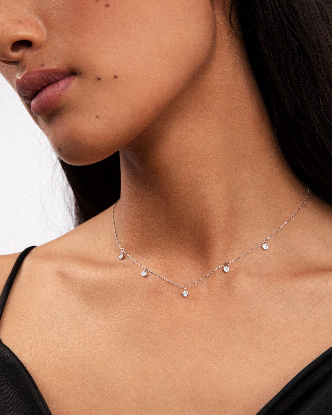 The Bezel Set Diamond choker in 18k white gold is one of our most anticipated pieces of jewelry. Its design is timeless and versatile. It is made up of five delicate bezel set diamonds that hang with grace and movement from this delicate necklace. This necklace incorporates a special spring or bolt ring clasp created by Mumit that allows you to adjust the length of the chain as desired. This feature means that the necklace can be worn as a choker at the neck or as a necklace on the collarbone. Perfect to wear alone or in combination with other necklaces, this is a special piece of jewelry that you're sure to fall in love with.