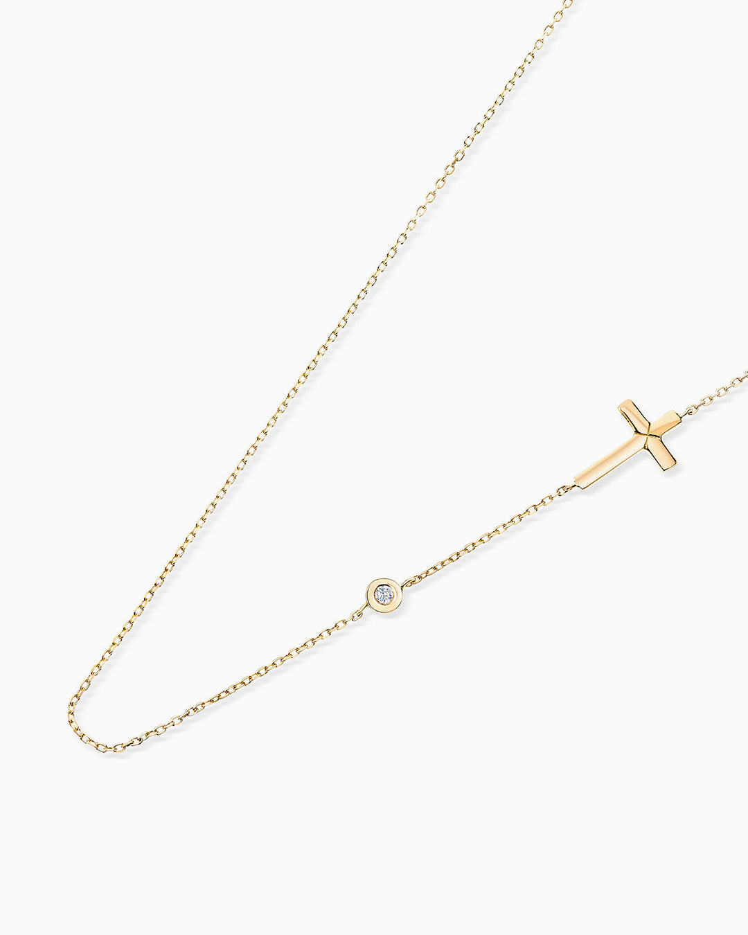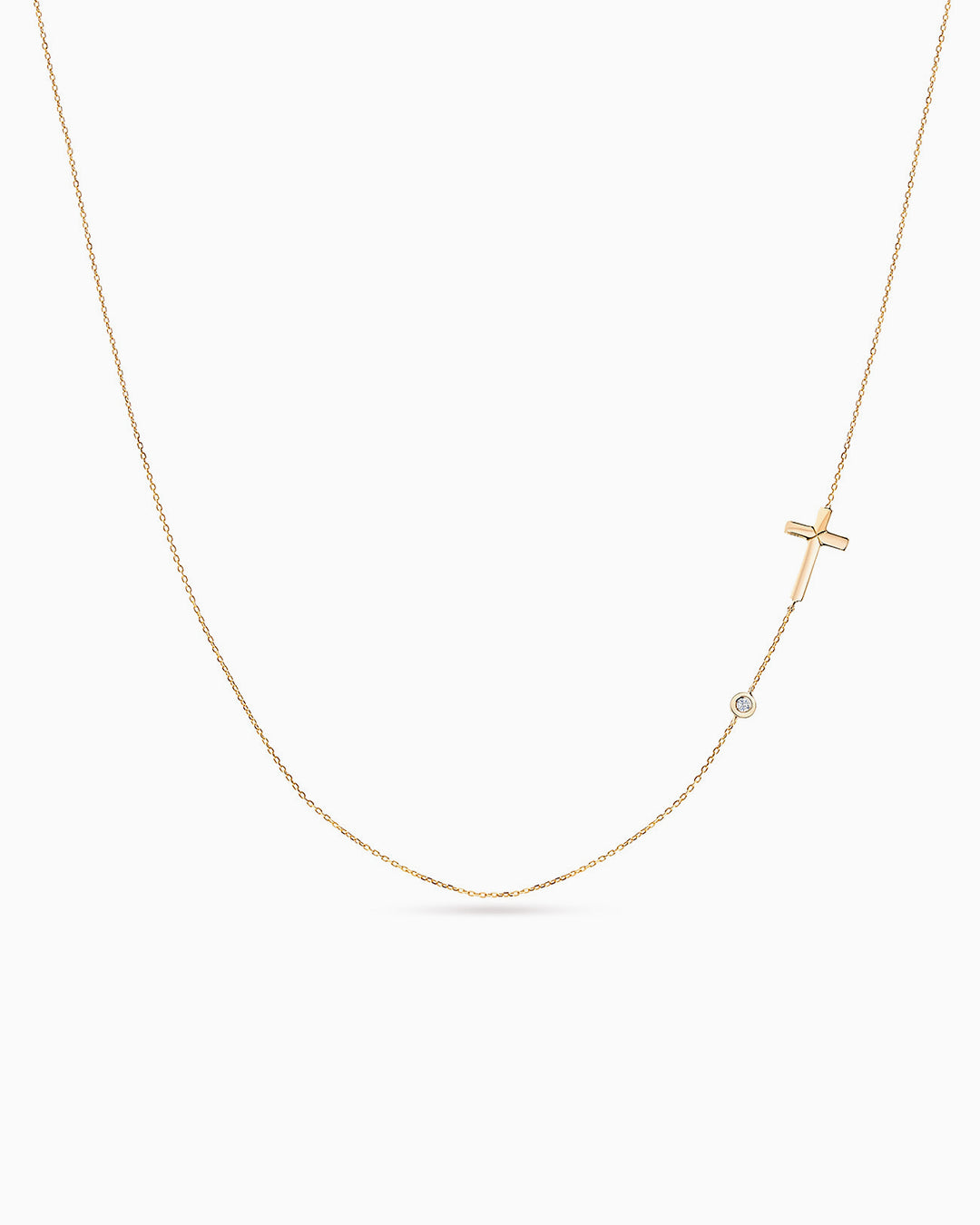 The Cross and Diamond necklace made of 18k yellow gold is not a typical cross necklace. Inspired by contemporary aesthetics, this design has transformed a timeless icon into a contemporary and elegant piece of jewelry. The delicate 0.01 carat bezel set diamond gives this necklace an unexpected touch that, together with the cross attached to the chain, makes this piece of jewelry a totally original design. A versatile necklace that you can combine with your most contemporary and elegant looks, this will become an everyday staple. It is also available in 18k white gold.