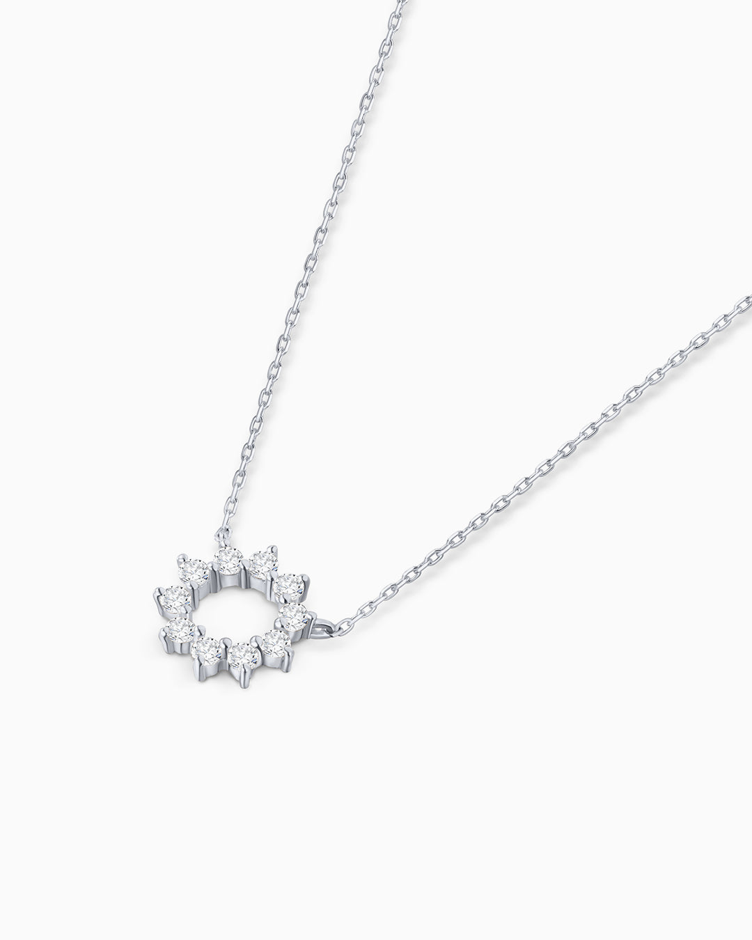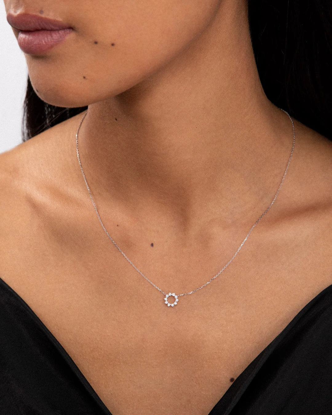 Diamond Soleil necklace in 18k white gold. The force of nature materialises in a piece of jewelry that is all light, the sun's rays become delicate diamonds that reflect a unique brilliance through their facets. The Soleil necklace, made up of ten brilliant-cut diamonds arranged in a circle, is an ode to the unique beauty of the sun and its rays. Perfect for creating a play of shapes and heights with the other Mumit necklaces, this necklace features a spring or bolt ring clasp made up of several rings, offering the option of adjusting the length to the desired height. This is a necklace with enough personality to be worn on its own, adding that certain touch of originality that characterises each of our designs.The Soleil necklace is available in three versions, in 18k yellow, rose and white gold with diamonds.
