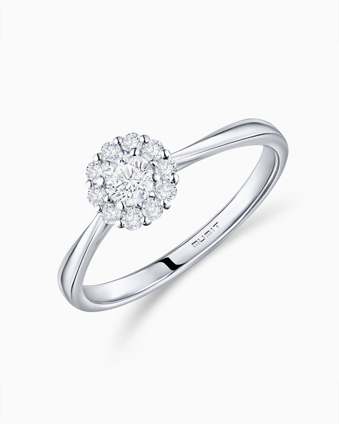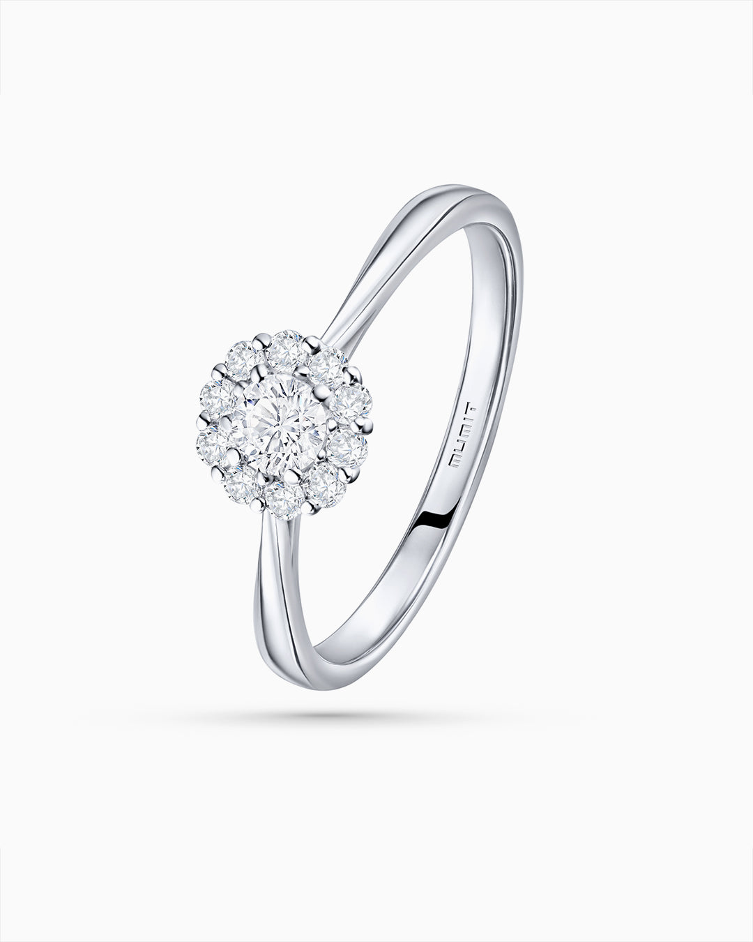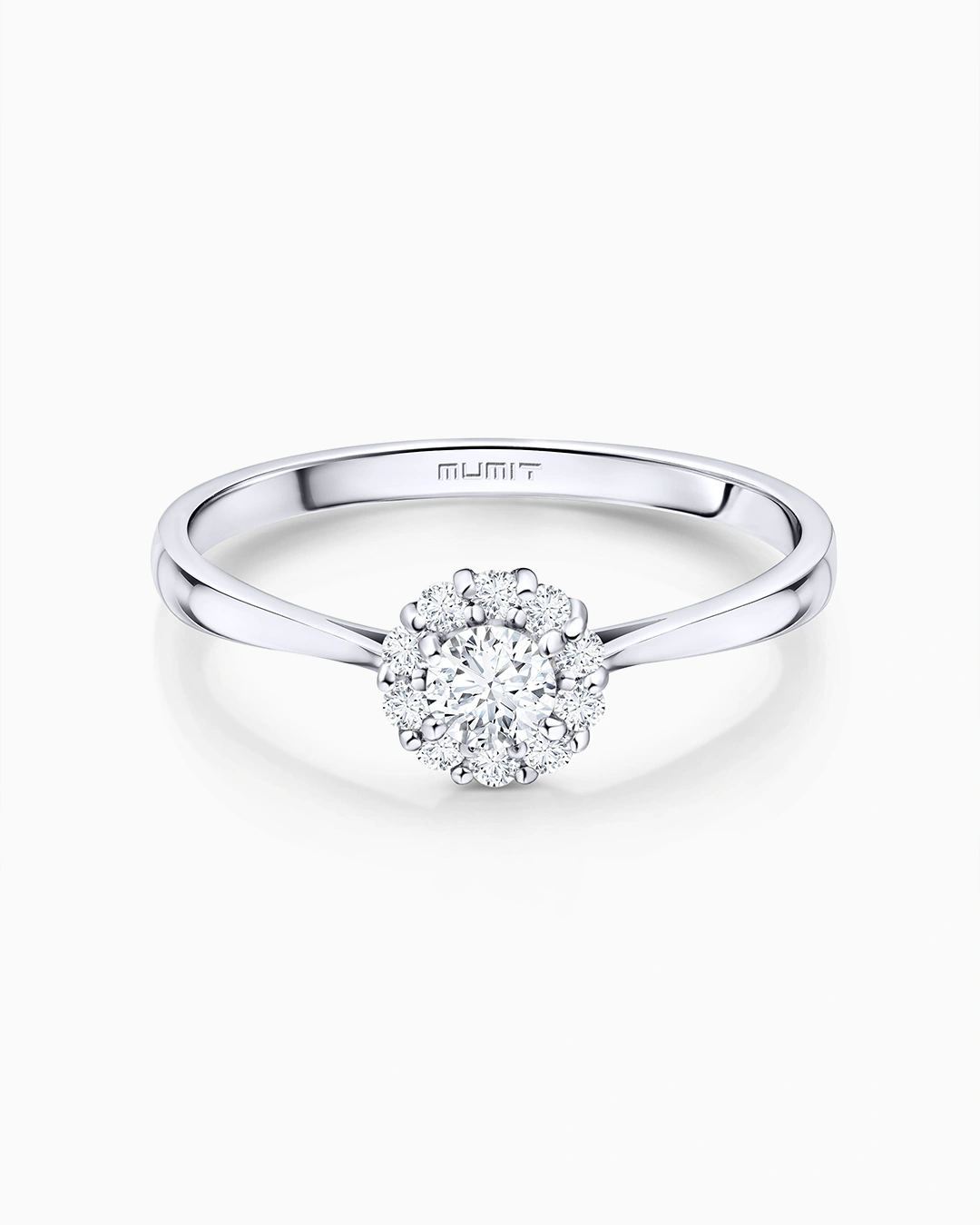 Rose solitaire diamond ring in 18k white gold. Mumit's Rose ring is designed to highlight the beauty of its diamonds. The setting of this unique piece of jewelry is an innovative take on the traditional solitaire diamond ring. Accordingly, the diamonds appear as though they're floating, spotlighting the stunning 0.20 carat brilliant-cut central stone. This alluring centerpiece is further embellished with a delicate halo that represents the blossoming of an eternal flower. Designed to reflect a love story as unique and radiant as its impressive display of light, the Rose ring is sure to become a cherished heirloom. The Rose solitaire diamond ring is available in four different carat weights: 0.35, 0.55, 0.65 and 0.75.