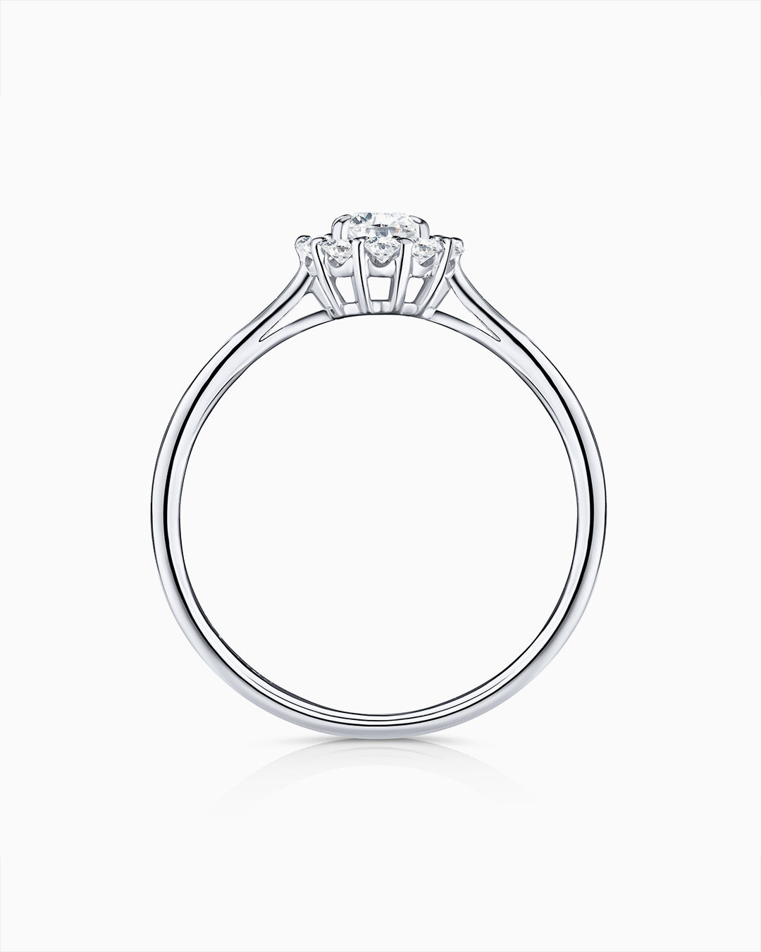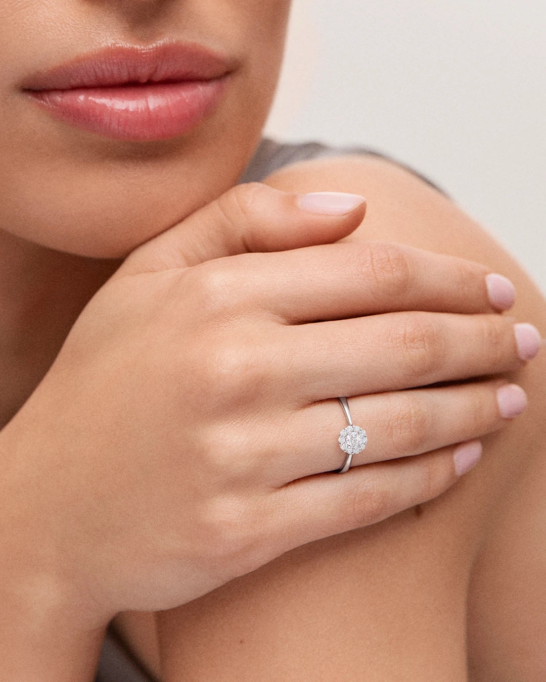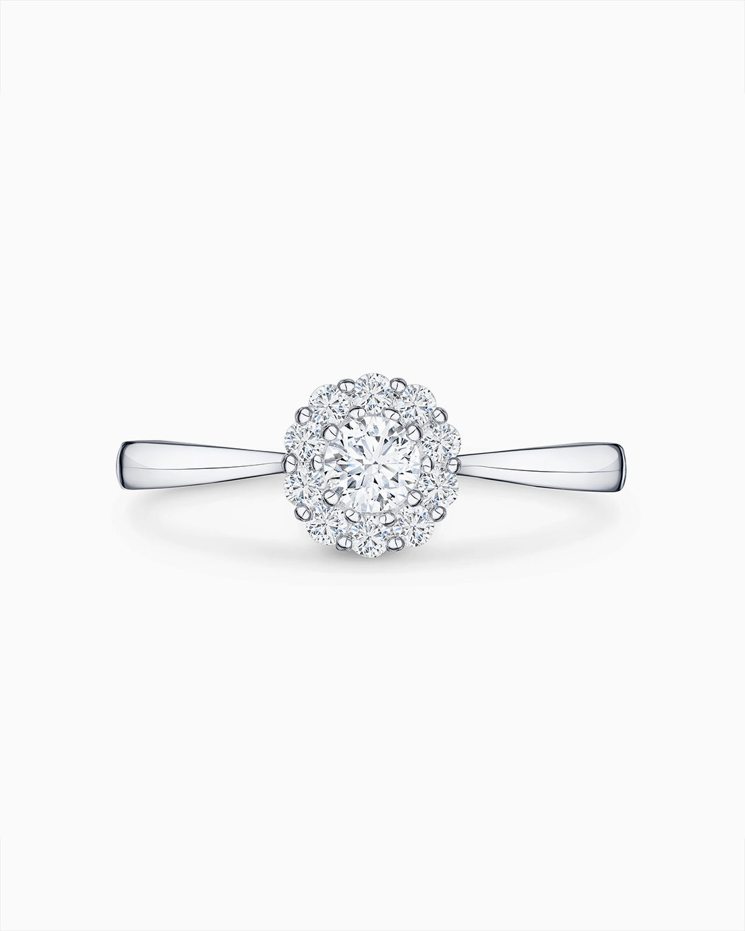 Rose solitaire diamond ring in 18k white gold. Mumit's Rose ring is designed to highlight the beauty of its diamonds. The setting of this unique piece of jewelry is an innovative take on the traditional solitaire diamond ring. Accordingly, the diamonds appear as though they're floating, spotlighting the stunning 0.20 carat brilliant-cut central stone. This alluring centerpiece is further embellished with a delicate halo that represents the blossoming of an eternal flower. Designed to reflect a love story as unique and radiant as its impressive display of light, the Rose ring is sure to become a cherished heirloom. The Rose solitaire diamond ring is available in four different carat weights: 0.35, 0.55, 0.65 and 0.75.