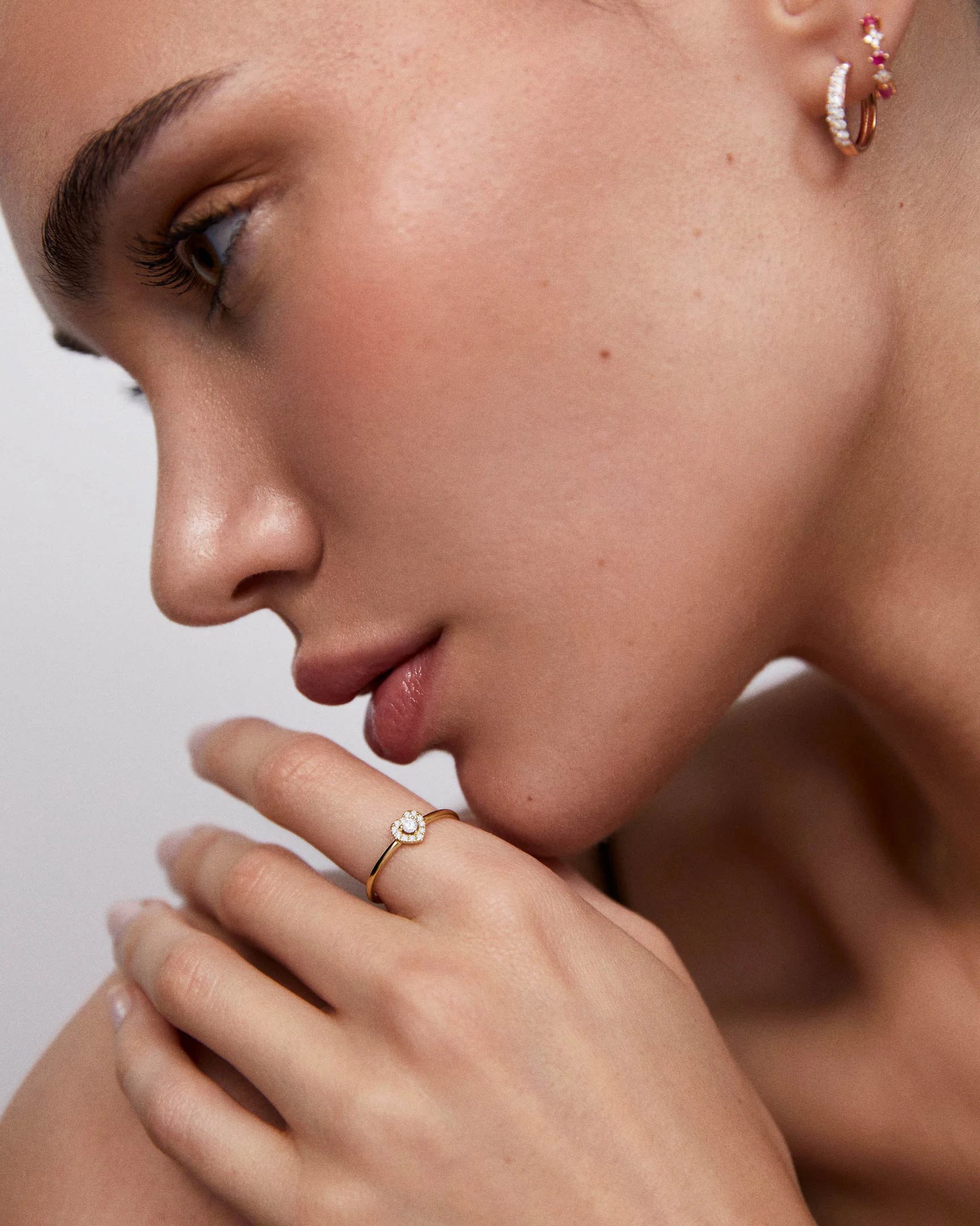 Inspired by the mysterious beauty of the night sky, the Ariadne ring fuses ancient symbolism with contemporary sophistication. Ariadne, princess of Crete, helped Theseus escape the labyrinth of the Minotaur with a luminous crown. According to legend, this symbol of love and bravery was later cast into the sky, forming the Corona Borealis constellation. The design of the ring reflects the splendour of this celestial tiara with an exquisite brilliant-cut solitaire, encircled by a heart-shaped halo. The space between the central diamond and the surrounding halo creates the optical illusion of a floating crown, tracing an ethereal silhouette. Crafted in 18k gold, the Ariadne ring celebrates the stories we create to explore the mysteries of the universe and their connection to our lives. A unique piece of jewelry that blends timeless elegance with eternal brilliance, perfect for revealing the poetry written in the stars.