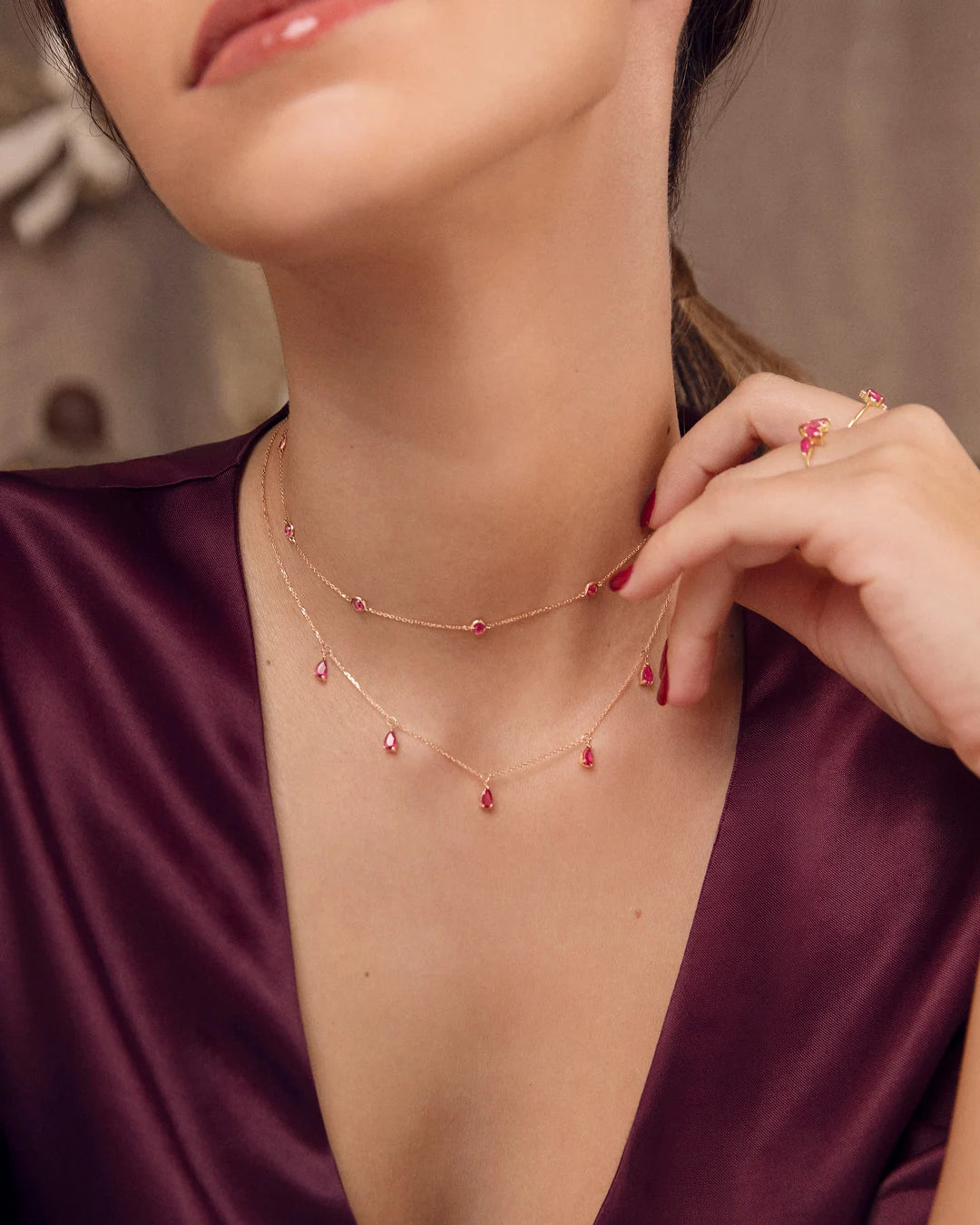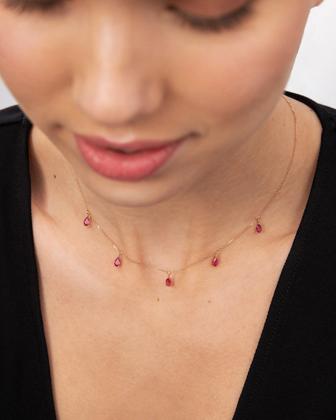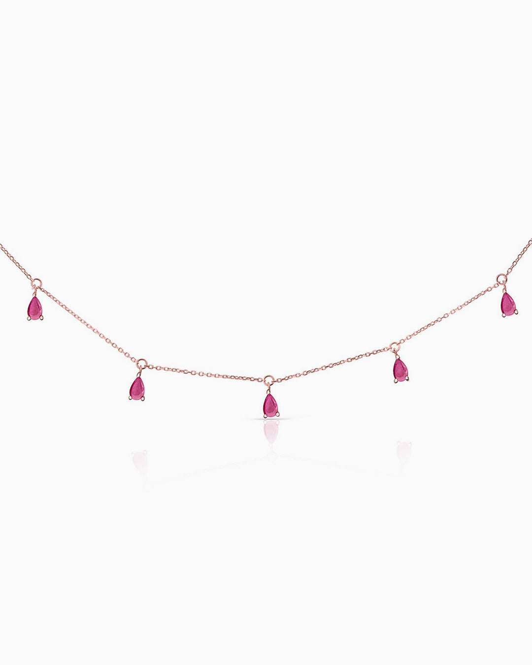 Eternity Colours ruby choker made of 18k rose gold. The power and magic of colours come to life through the new Eternity Colours choker necklace, designed in three colours full of vitality and strength. Made up of five spectacular pear-cut rubies that hang delicately from the chain, tracing its elegant and striking design. It features a special spring or bolt ring clasp created by Mumit, and finished in a delicate ruby, that allows the length of the chain to be adjusted as desired. This feature means that the necklace can be worn as a choker at the neck or as a necklace on the collarbone, allowing for endless possibilities. Perfect to wear alone or in combination with other necklaces from the collection.