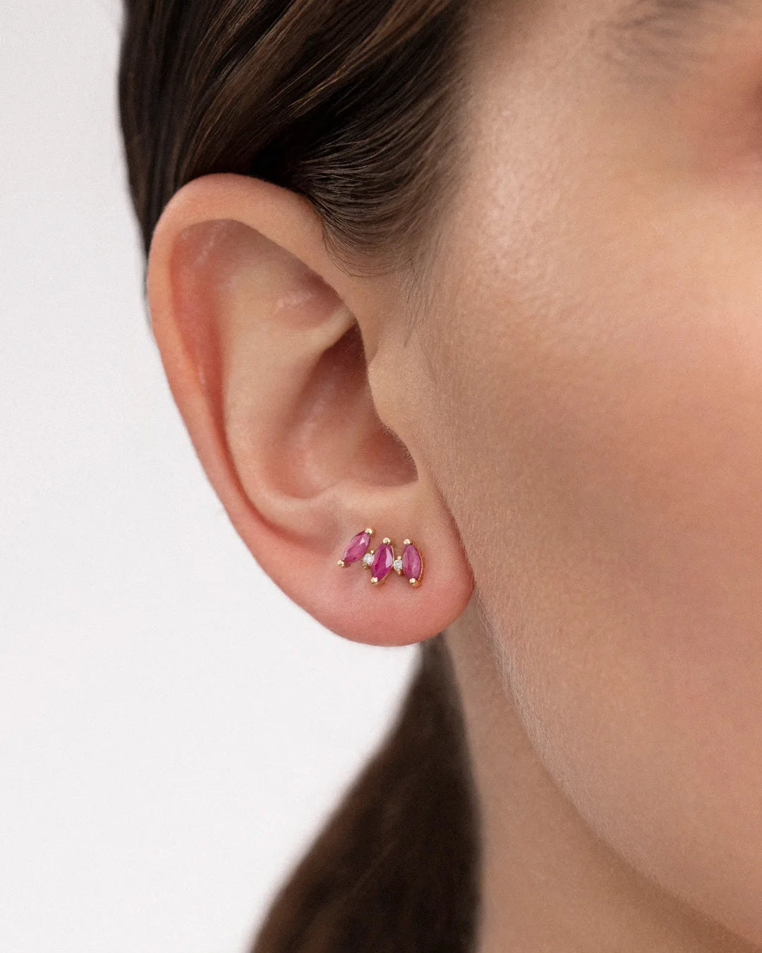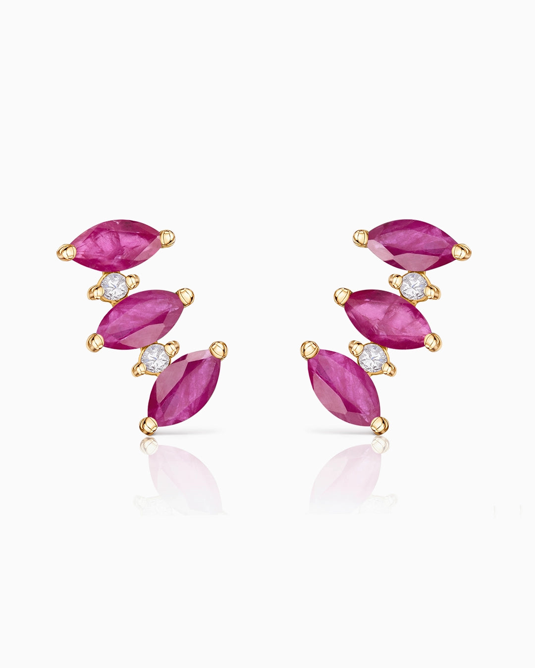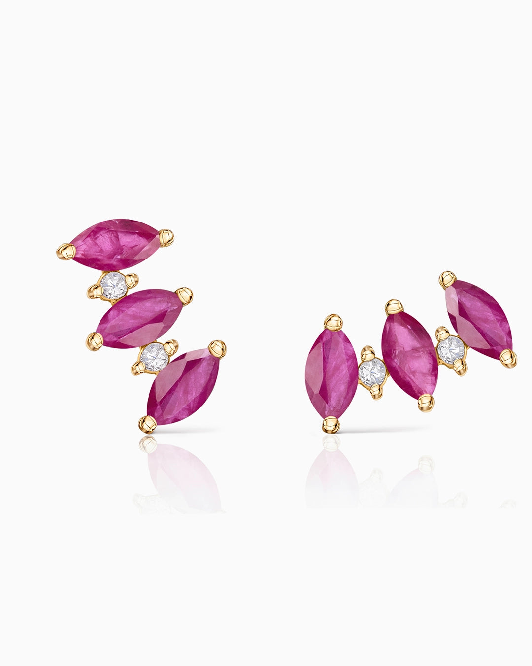 Tri-Marquise earrings with diamonds and marquise-cut rubies set in 18k yellow gold. Avant-garde, technique and colour. These earrings evoke natural beauty as infinite inspiration. Designed in three sublime colours, emerald, sapphire and ruby with two delicate diamonds that provide an incomparable touch of light. Each of these earrings features three marquise-cut rubies, which trace the shape of the lobe with elegant delicacy. Its characteristic design makes these earrings adapt perfectly to any angle of the ear. Create amazing colour combinations by mixing them with other pieces from the collection.The Tri-Marquise earrings are available in three versions with emeralds, rubies or sapphires and diamonds set in 18k yellow gold.