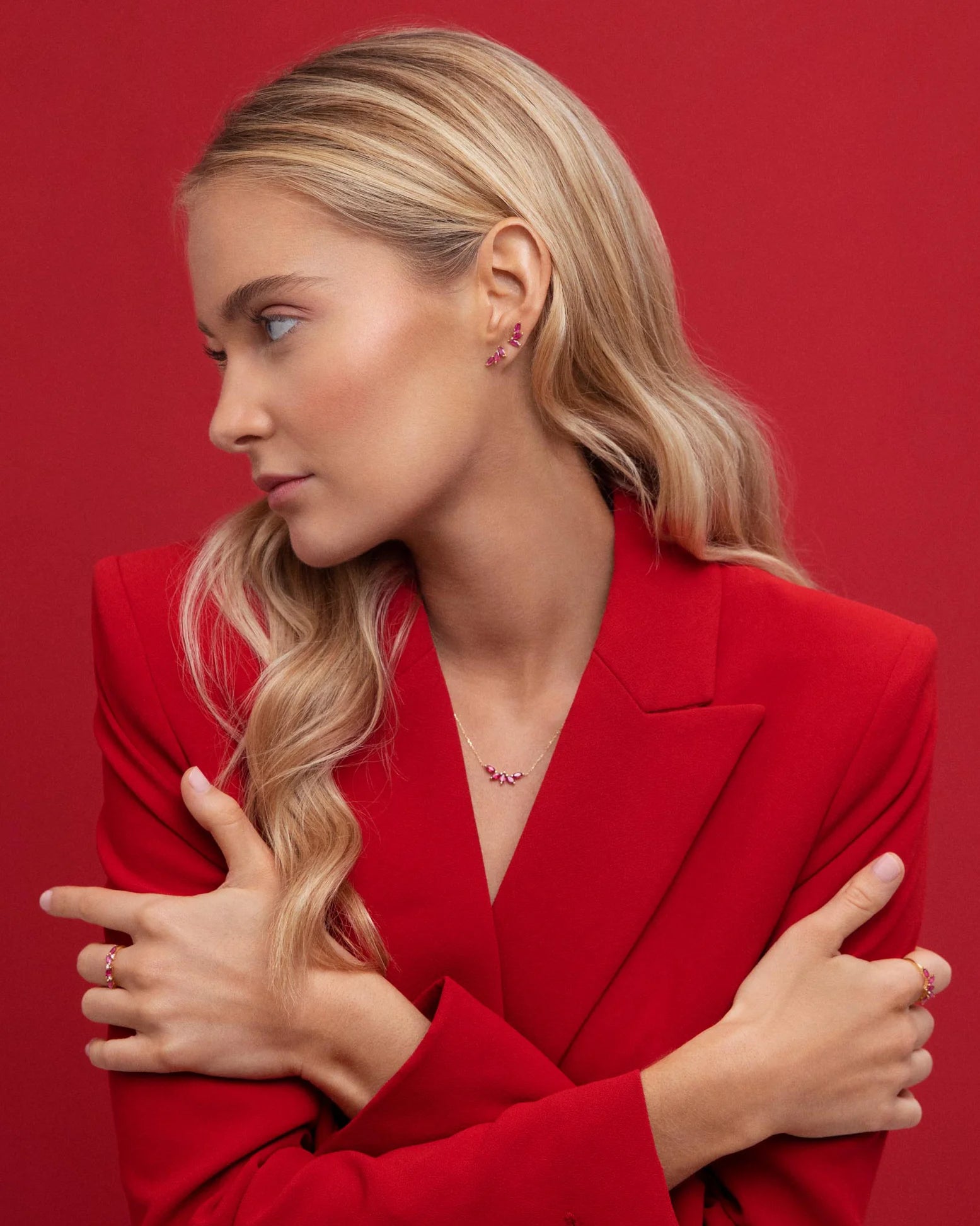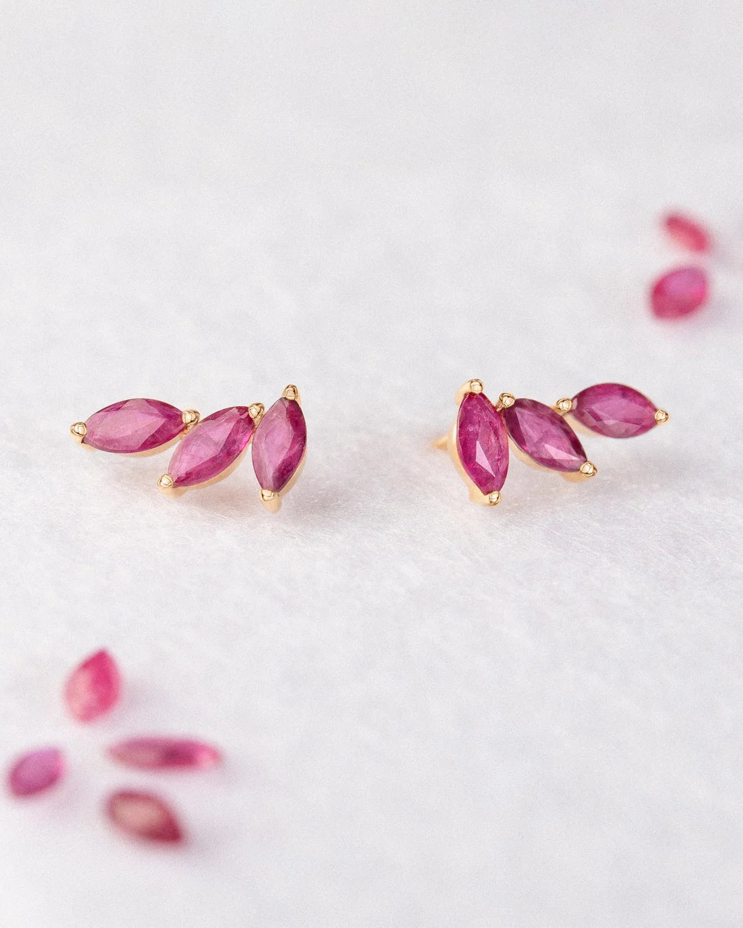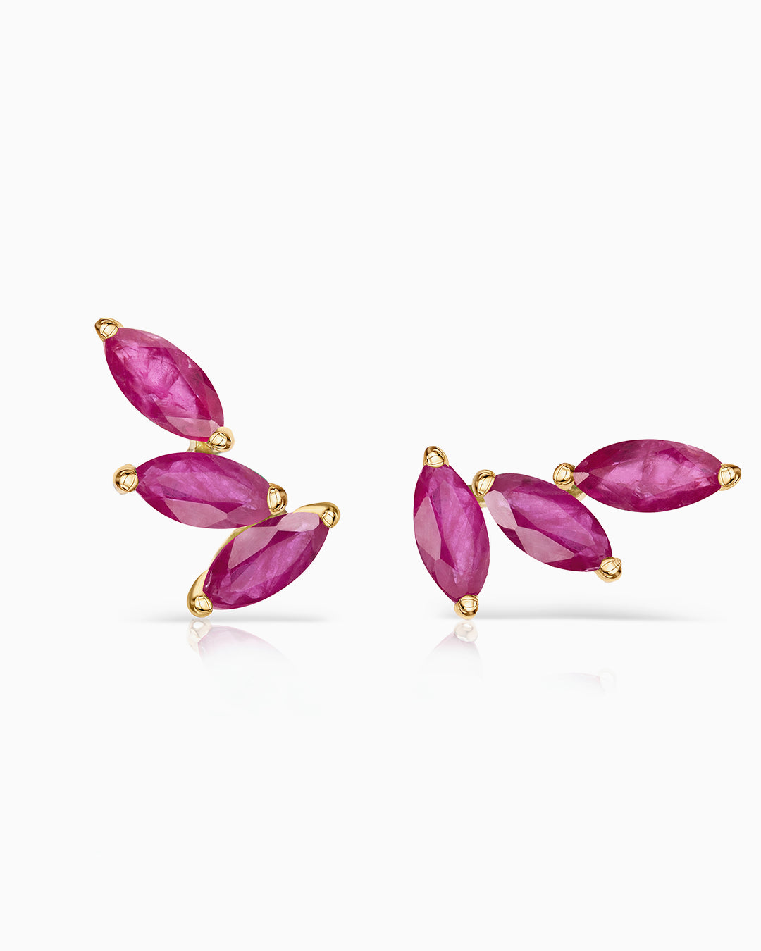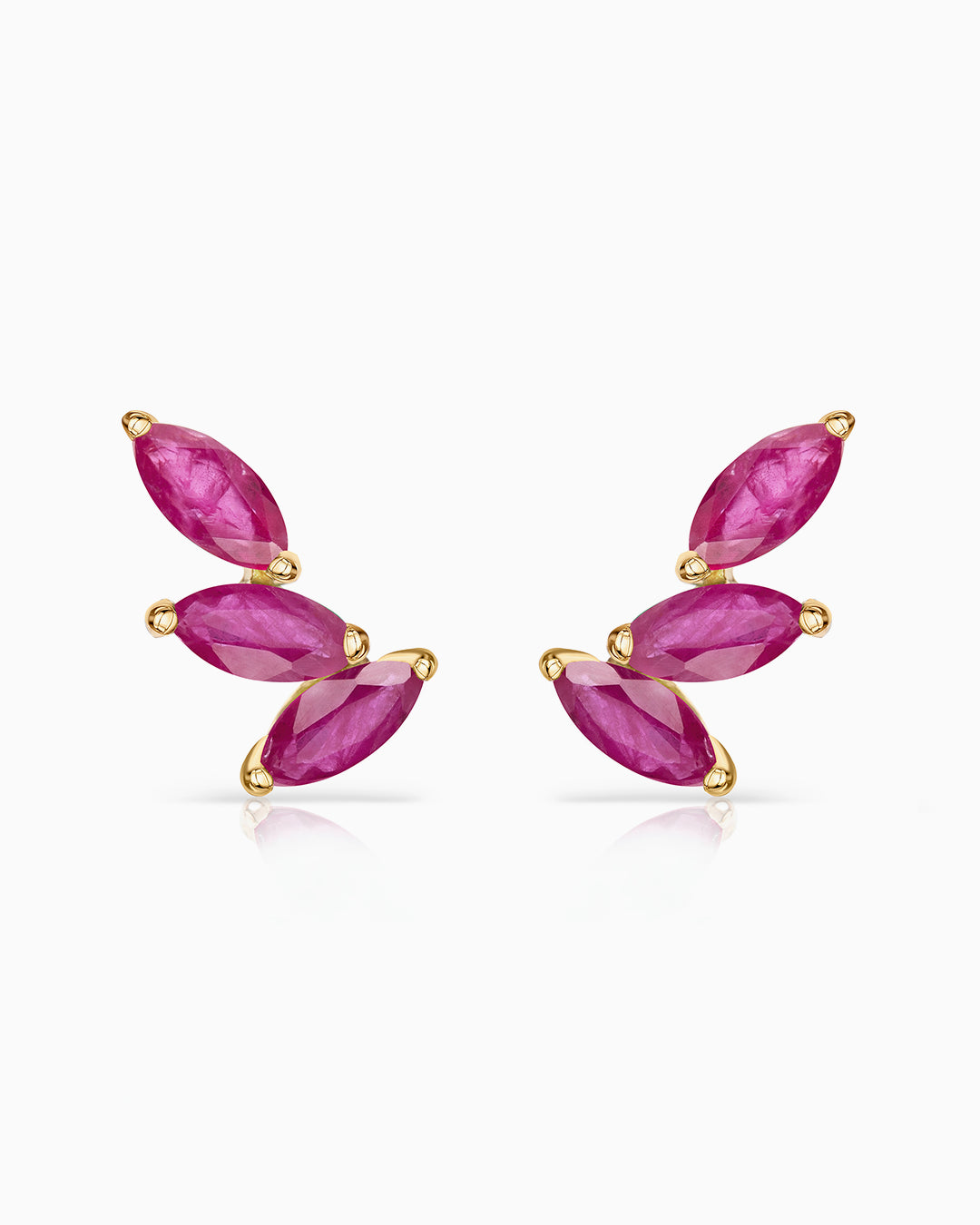 Earrings with marquise-cut rubies set in 18k yellow gold. Inspired by the shapes of nature and designed to make you shine on any occasion. This original and versatile earring is comprised of three marquise-cut rubies that together trace the delicate shape of the earlobe. Their characteristic shape allows them to be worn either in the lobe or in the helix, creating striking looks. They incorporate a press fit closure or butterfly earring back in the centre of the earring, contributing to its comfort and fit.The Tri-Marquise Earrings are available in three versions with emerald, ruby or sapphire set in 18k yellow gold.
