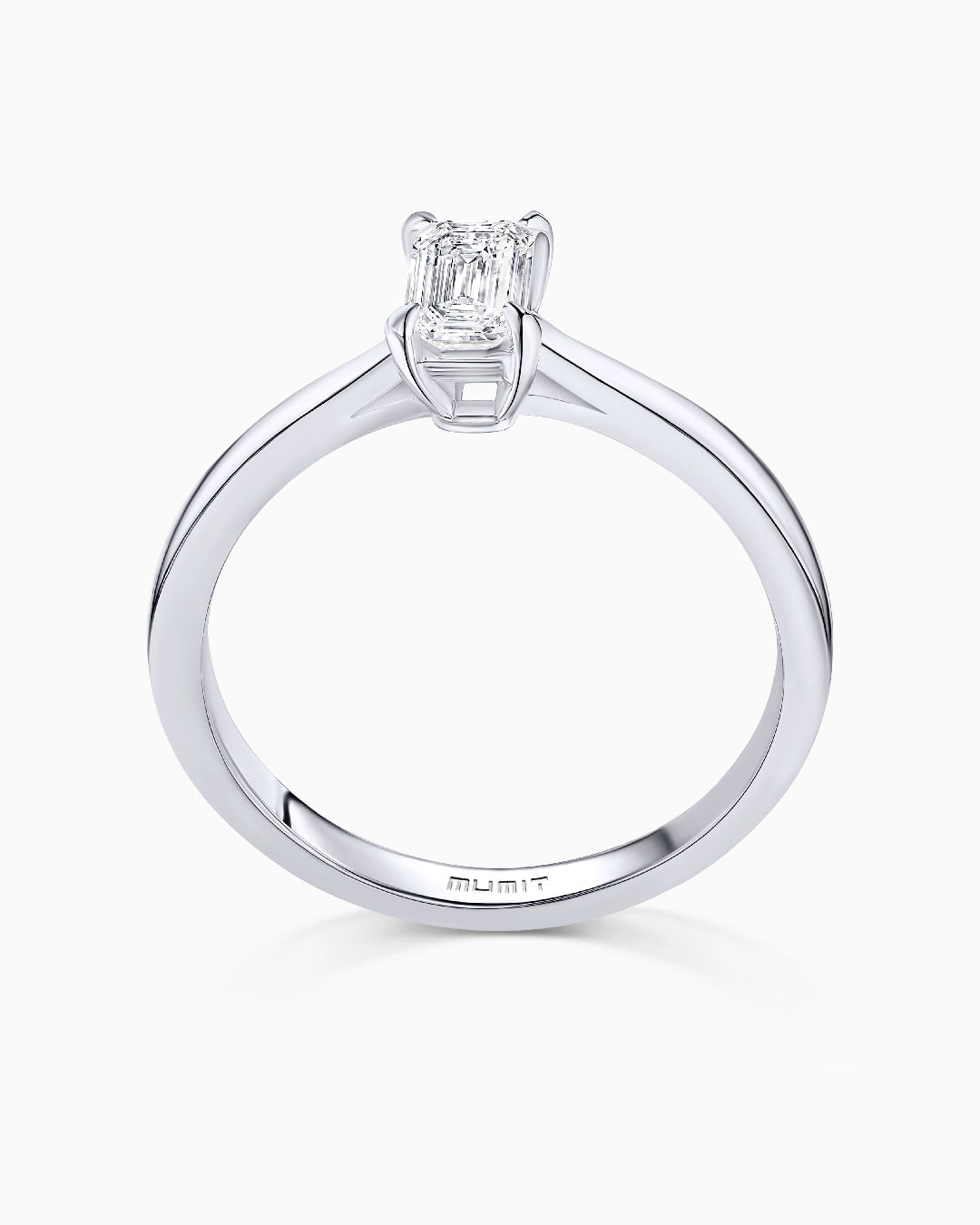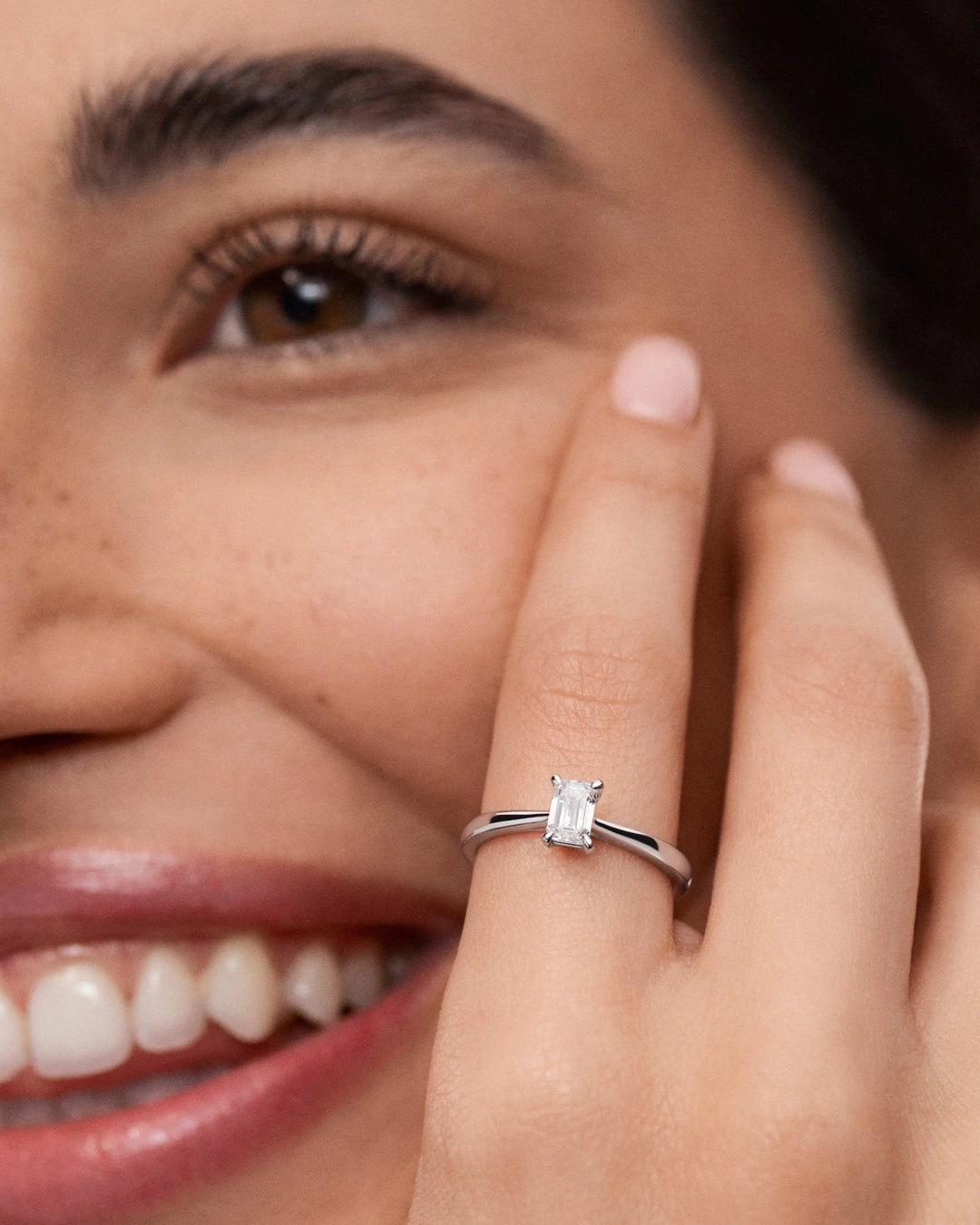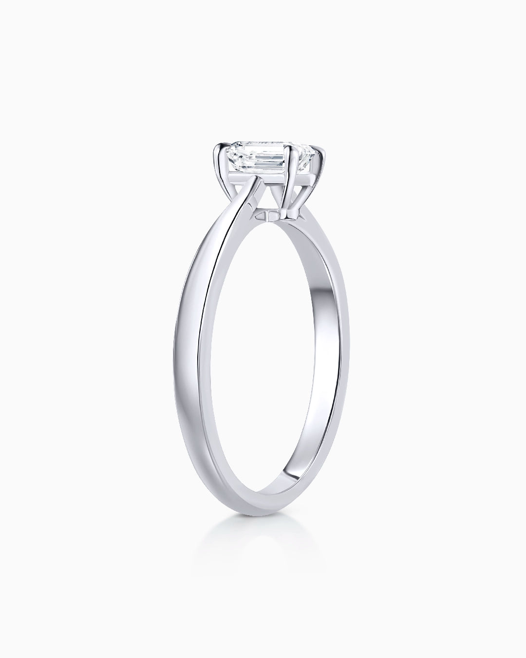 Deco Claire solitaire diamond ring made from 18k white gold. The band of this exclusive ring was thoughtfully designed to look proportionally thinner towards the center, highlighting the spectacular beauty of its 0.5 carat emerald-cut diamond and evoking the geometrical shapes of the Art Deco movement through its silhouette. The purity of its lines represents the delicate and tender nature of all the most precious memories of a love story. Likewise, its ingenious structure symbolizes the strength of an eternal promise because of the stability of its foundation, which also means it is a comfortable ring for everyday wear. The solitaire diamond ring of your dreams adapted to meet modern needs.