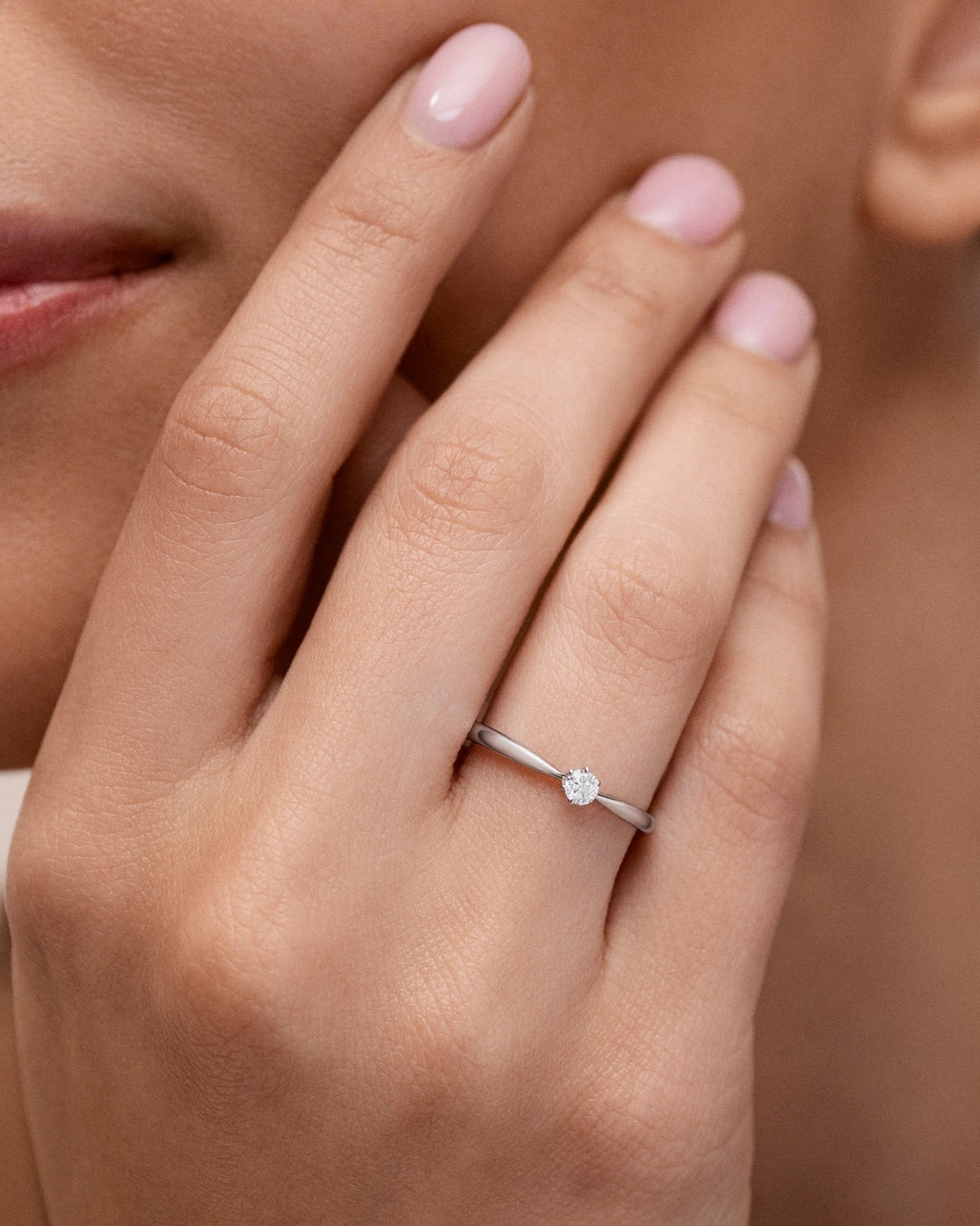 Love is the strongest feeling that exists. At the same time, it is as delicate as the sparkle of a diamond. Discover the most innovative and contemporary way of expressing everlastig love with our Always collection. The solid structure of this ring is finely crafted to showcase the magnificent 0.10 carat brilliant-cut diamond. Delicate and innovative, this modern take on the six-claw setting creates the illusion that the diamond is floating on your skin, achieving a stunning display of light. The Always ring is designed so you can effortlessly stack your wedding band beside it and celebrate your personal style. A romantic ring to say “Ever thine, ever mine, ever ours” - Beethoven. The Always six-prong solitaire diamond ring is available in two different carat weights: 0.10 and 0.20.