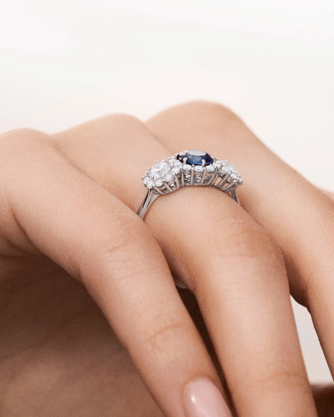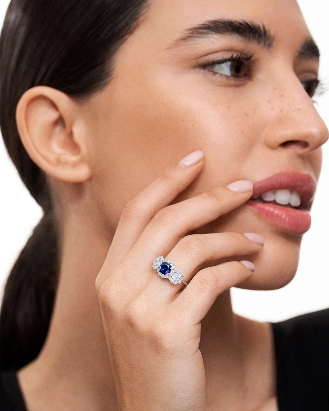 Nerissa Rose diamond and sapphire ring in 18k white gold. The Nerissa Rose ring is designed to amplify the vibrant hue of the central sapphire through prominent clusters of diamonds. Inspired by the water nymphs in Greek mythology, it symbolizes the beautiful and kind nature of the sea, since these revered creatures were known for helping sailors on their Mediterranean voyages. The stunning one carat sapphire represents the home of these lovely beings, surrounded by a brilliant-cut diamond halo that highlights its bold blue colour. The distinctive silhouette of this ring is achieved through the addition of a 0,30 carat solitaire diamond rose on each side of the sapphire, evoking a sparkling sea garden. A unique design with a feminine essence as dazzling as the light reflecting over the surface of the sea.