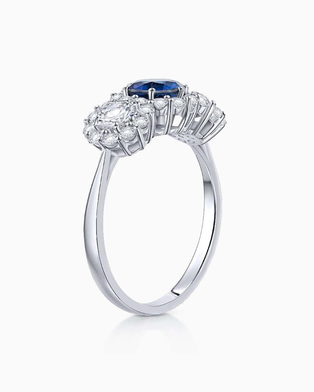 Nerissa Rose diamond and sapphire ring in 18k white gold. The Nerissa Rose ring is designed to am...