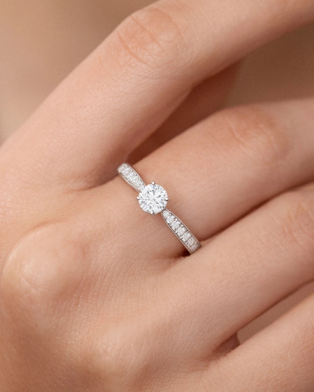 Love is the strongest feeling that exists. At the same time, it is as delicate as the sparkle of a diamond. Discover the most innovative and contemporary way of expressing everlastig love with our Always collection. The solid structure of this ring is finely crafted to showcase the magnificent 0.50 carat brilliant-cut diamond. Delicate and innovative, this modern take on the four-claw setting creates the illusion that the diamond is floating on your skin, achieving a stunning display of light. This version of one of our best known rings features a distinctive diamond-encrusted band for added sparkle. The Always ring is designed so you can effortlessly stack your wedding band beside it and celebrate your personal style. A romantic ring to say “Ever thine, ever mine, ever ours”, Beethoven. The Pavé Always solitaire diamond ring is available in six different carat weights: 0.35, 0.40, 0.45, 0.60, 0.68 and 0.86.