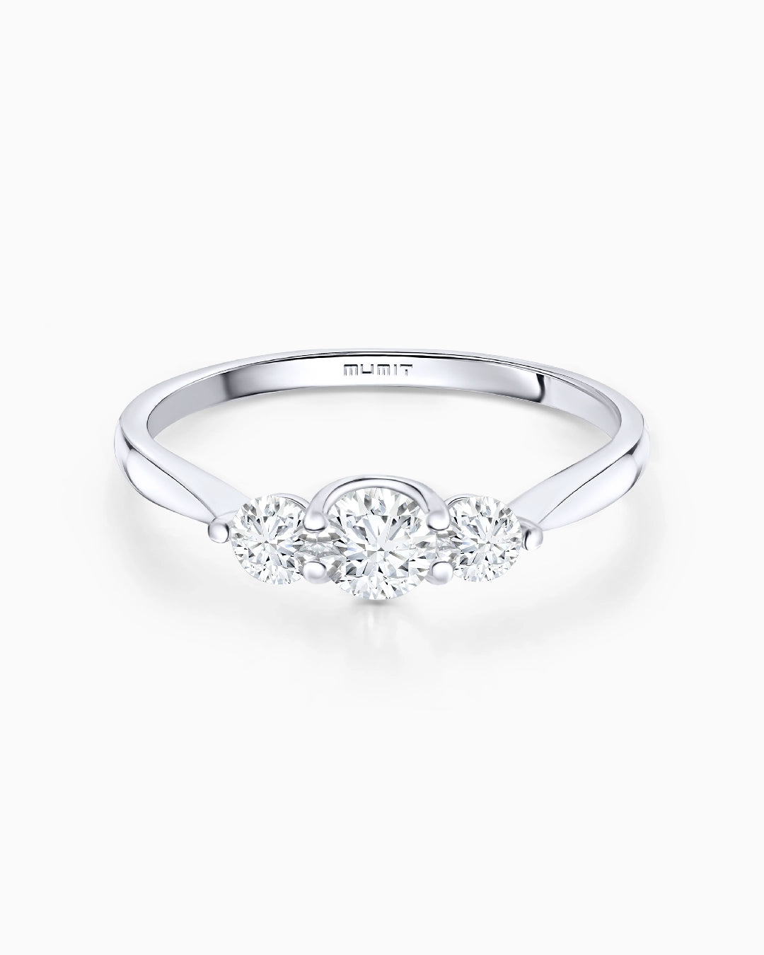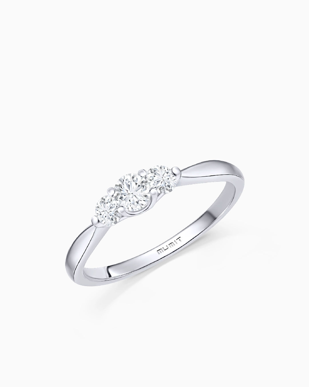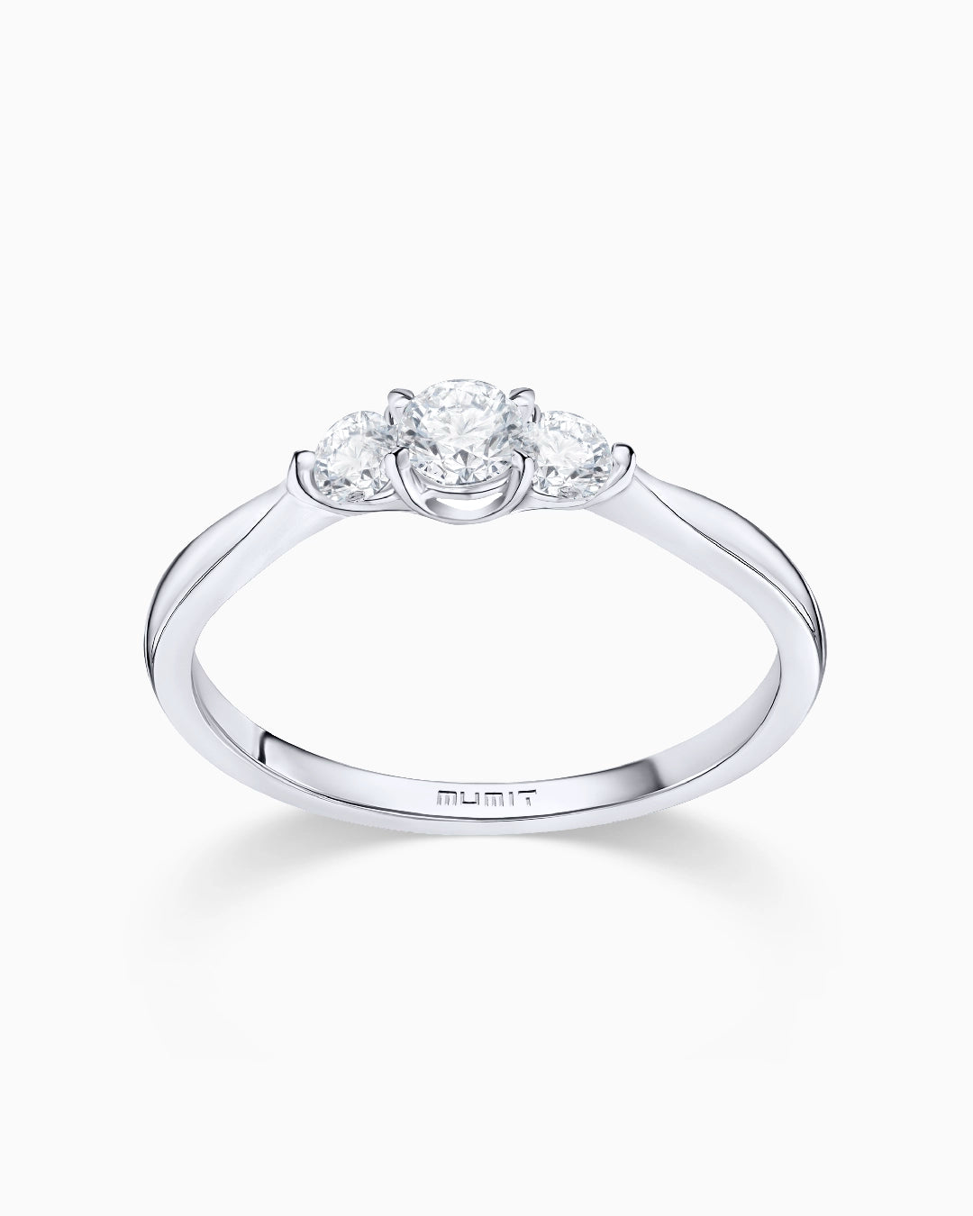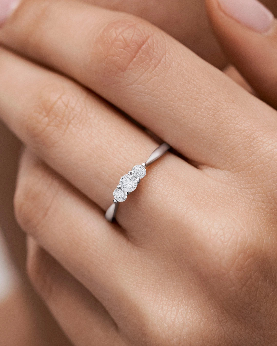 Tressa diamond ring in 18k white gold. Harmonious and delicate, Tressa's frame is highly symbolic. Its design is centered around a diamond trilogy that represents the past, the present and the future. The 0.15 carat central diamond symbolizes the current moment and its importance, receiving light from every angle through the adjacent past and future stones and telling the dazzling story of a neverending promise. This romantic piece of jewelry is a declaration of love that will reflect all the shared dreams and the most magical memories through its eternal gleam. The Tressa diamond ring is available in three different carat weights: 0.30, 0.40 and 0.80.