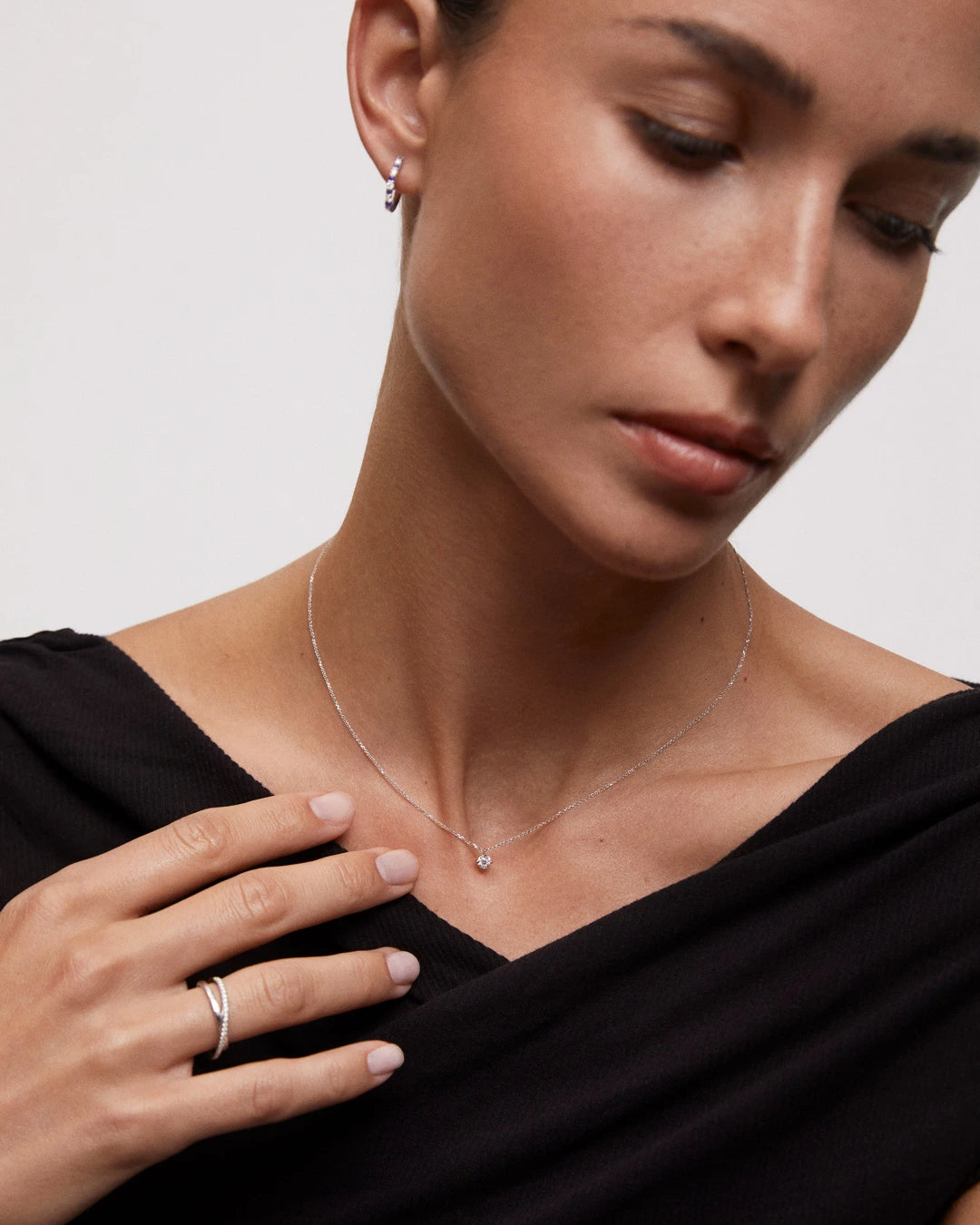 Timeless and versatile, the Jolie necklace celebrates the natural beauty of the diamond in its purest form. A 0.25 ct brilliant-cut solitaire sits at the centre, secured in an 18k white gold four-claw setting. The stone is held with delicacy, allowing light to flow through each facet and giving it an exceptional sense of lightness and radiance. The result is a minimalist piece with clean lines and timeless appeal, perfect for effortless layering or adding subtle radiance to every look.