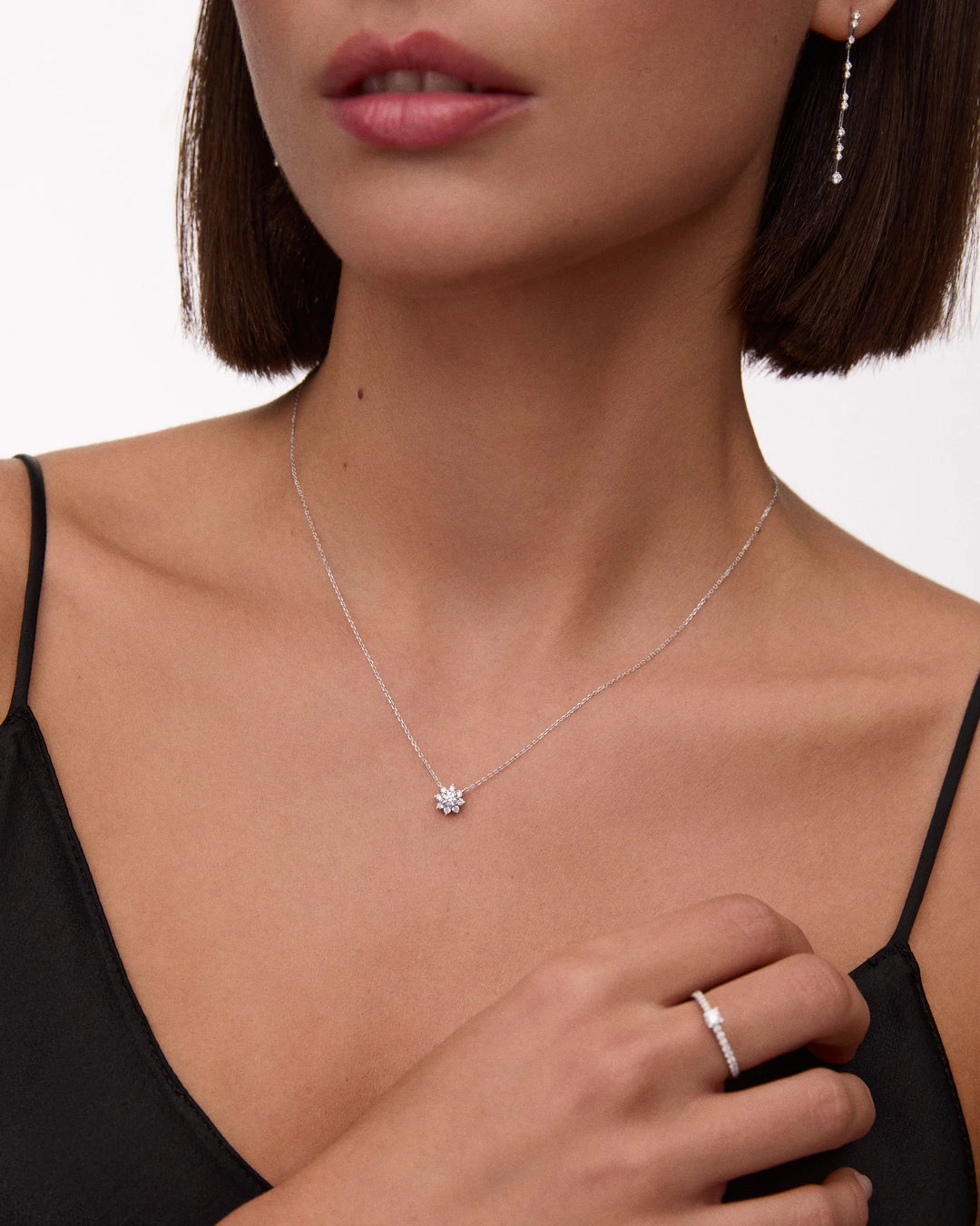 The Rosette Solitaire necklace is one of the signature pieces in our most refined collection. Inspired by the fleeting beauty of a rose garden at dawn, it mirrors the morning sun as it glistens on dewdrops that cling to the petals. The design, both fresh and elegant, is characterised by a central rosette with flawless symmetry and meticulous finishing. Set with nine natural diamonds totalling 0.34 carats, it sparkles with a soft brilliance that makes it a timeless choice for every occasion. Wear it alongside other Rosette pieces for a diamond look as delicate as the petals of a flower.