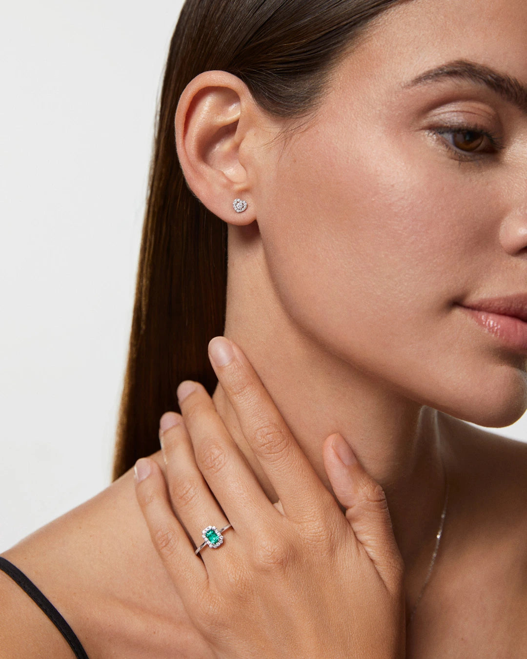 The Elizabeth ring by Mumit is inspired by the magnificent jewelry collection and the distinguished taste of the fabulous Elizabeth Taylor. As a gemstone connoisseur, the actress had a particular fondness for emeralds, a precious stone that enhanced many of her looks throughout her glamorous journey in Hollywood. For this reason, our gemologists have selected the highest quality Zambian emeralds to be the centrepiece of the Elizabeth ring. Each of these natural wonders has been cut in a rectangular shape to enhance its mesmerising color and create a dazzling play of light on its surface. A delicate diamond halo frames the design, accentuating the depth of the emerald and creating a stunning contrast. Joined with the lustrous glow of 18k white gold, it highlights the irresistible character of the piece, perfectly reflecting the timeless elegance of the collection's muse. An impressive jewel that will add a touch of distinction and allure to your personal collection.