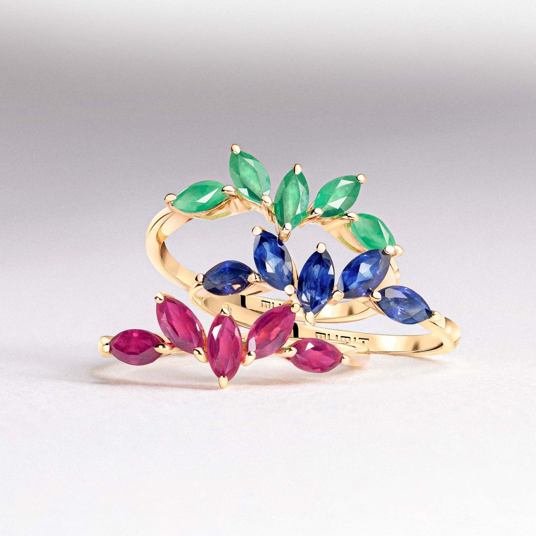 Rubíes, esmeraldas y zafiros de talla marquesa se unen trazando sorprendentes siluetas. Inspirados en la magia de la naturaleza, estos tres modelos han sido diseñados para celebrar la vida a todo color.