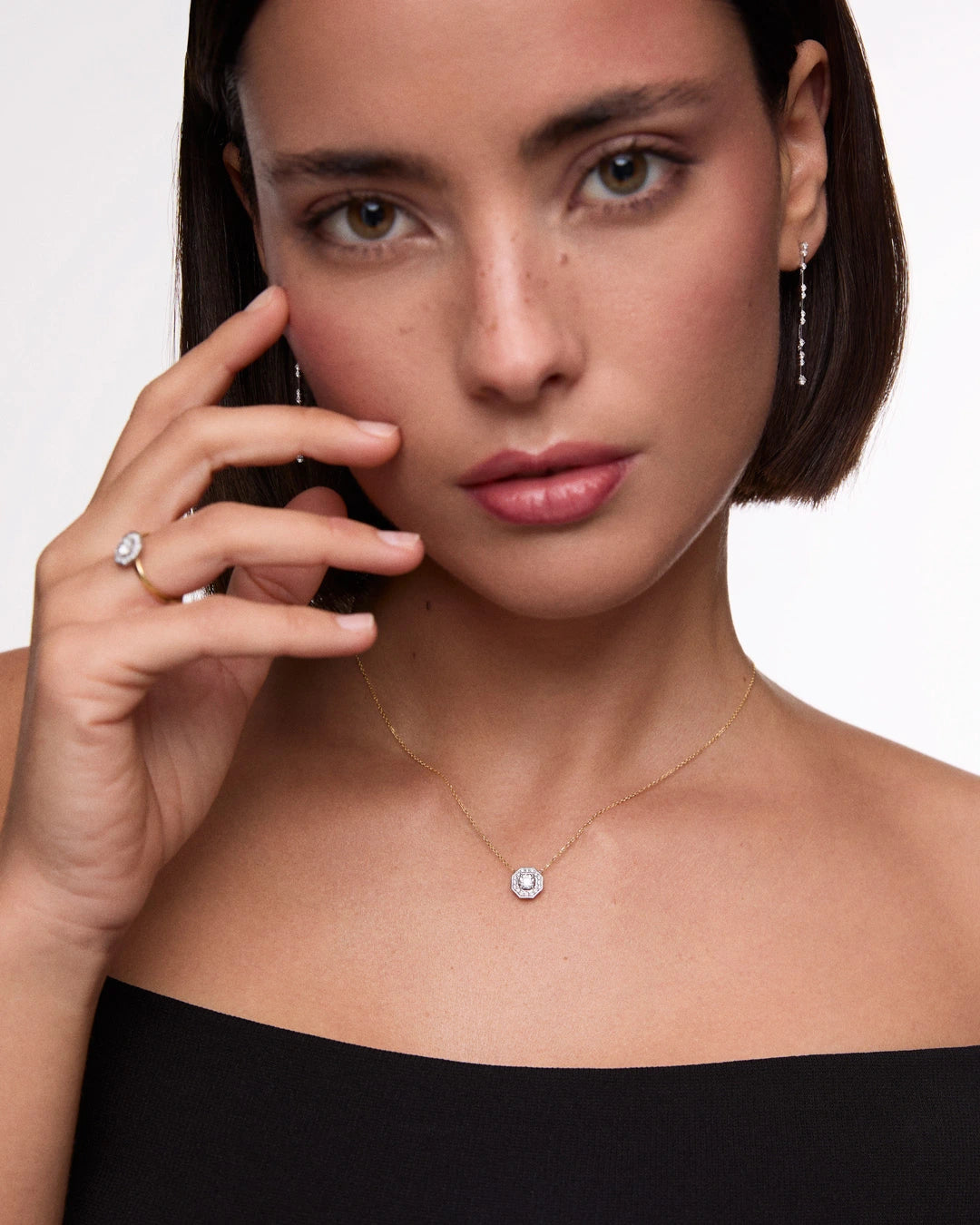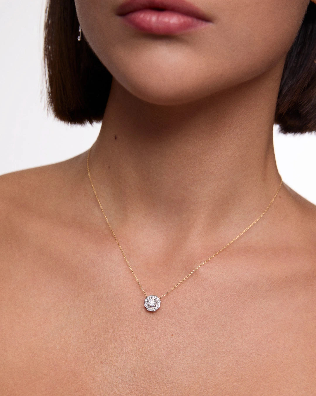 En Mumit, queremos celebrar el centenario del art déco con una colección de joyas inspirada en el espíritu vanguardista de los años 20 y diseñada para la mujer de hoy. La gargantilla Art Deco Belle apuesta por la armonía y la elegancia atemporal de las formas geométricas. Su nombre rinde homenaje a Belle Kogan, una de las mujeres que definieron los códigos del movimiento desde el ámbito del diseño industrial. El colgante presenta un exquisito diamante central de 0,30 quilates, certificado por la GIA y enmarcado en una orla octogonal que ensalza la simetría del conjunto. Elaborada en oro blanco y amarillo de 18 kt, la montura incorpora un brillo singular, evocando la preferencia por los contrastes del art déco. Una pieza sofisticada y actual que conecta el legado artístico de principios de siglo XX con el presente.