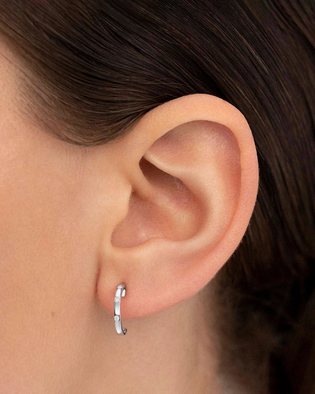 Pendientes de diamantes Allied elaborados en oro blanco de 18 Kt. Destinados a vivir emocionantes aventuras, diseñados para el día a día. Los pendientes Allied no son el típico pendiente de medio aro, tres delicados diamantes trazan su forma curva aportándoles un toque de originalidad que te cautivará. Inspirados en la ternura y la estética contemporánea de la colección, los pendientes de medio aro Allied son el complemento perfecto de una de nuestras sortijas más icónicas. Cuentan con un cierre de presión o tuerca de mariposa que les aporta seguridad y comodidad. Ideales para realzar cualquier peinado, un trío de diamantes para tu oreja.Los pendientes Allied están disponibles en tres versiones, oro rosa, amarillo y blanco de 18 Kt.