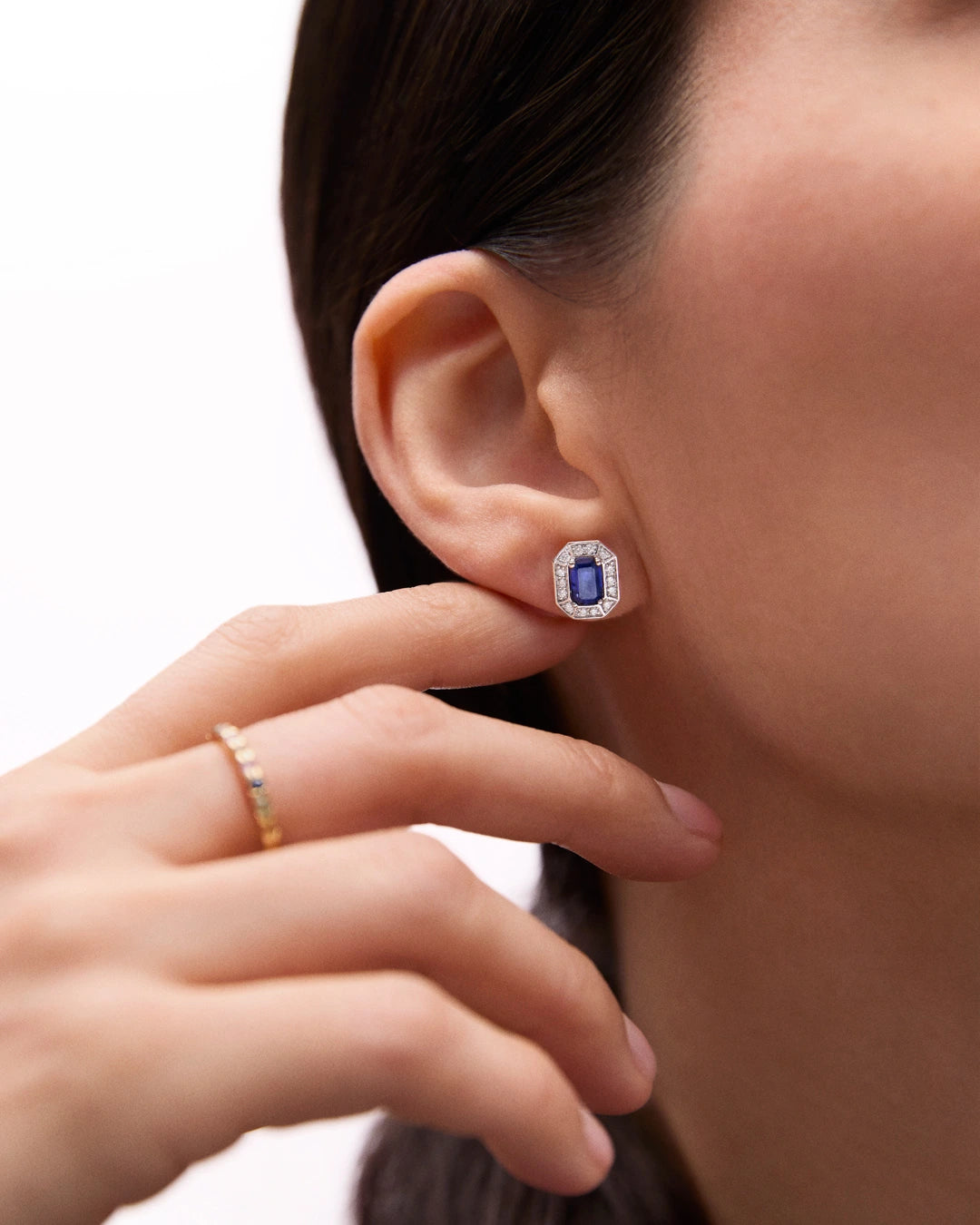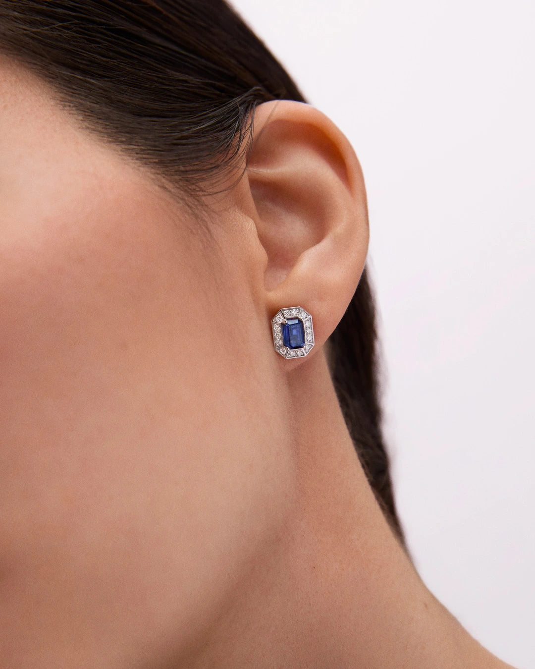 En Mumit, queremos celebrar el centenario del art déco con una colección de joyas inspirada en el espíritu vanguardista de los años 20 y diseñada para la mujer de hoy. Los pendientes Art Deco Helen destacan por una silueta octogonal de marcado carácter geométrico y un exquisito zafiro en talla esmeralda. Esta creación debe su nombre a Helen Dryden, una reconocida artista que revolucionó el mundo de la ilustración con su estilo sofisticado e innovador, consolidando los códigos visuales del art déco presentes en cada trazo del diseño. Elaborada en oro blanco de 18 kt, la pieza evoca la preferencia por los materiales nobles y los contrastes cromáticos del movimiento. Como toque final, la orla de diamantes naturales enmarca la gema central con un juego de luces sutil y expresivo, fiel a la esencia glamurosa de la década. El resultado es una composición única donde la geometría, el color y la luz se unen para reinterpretar un legado que nunca pasa de moda.