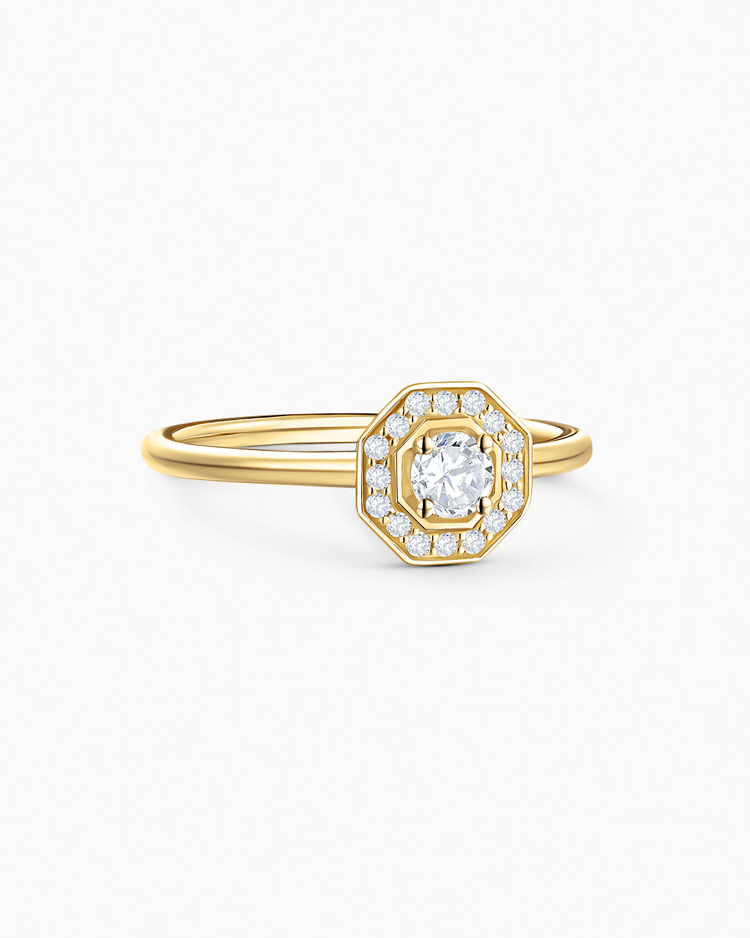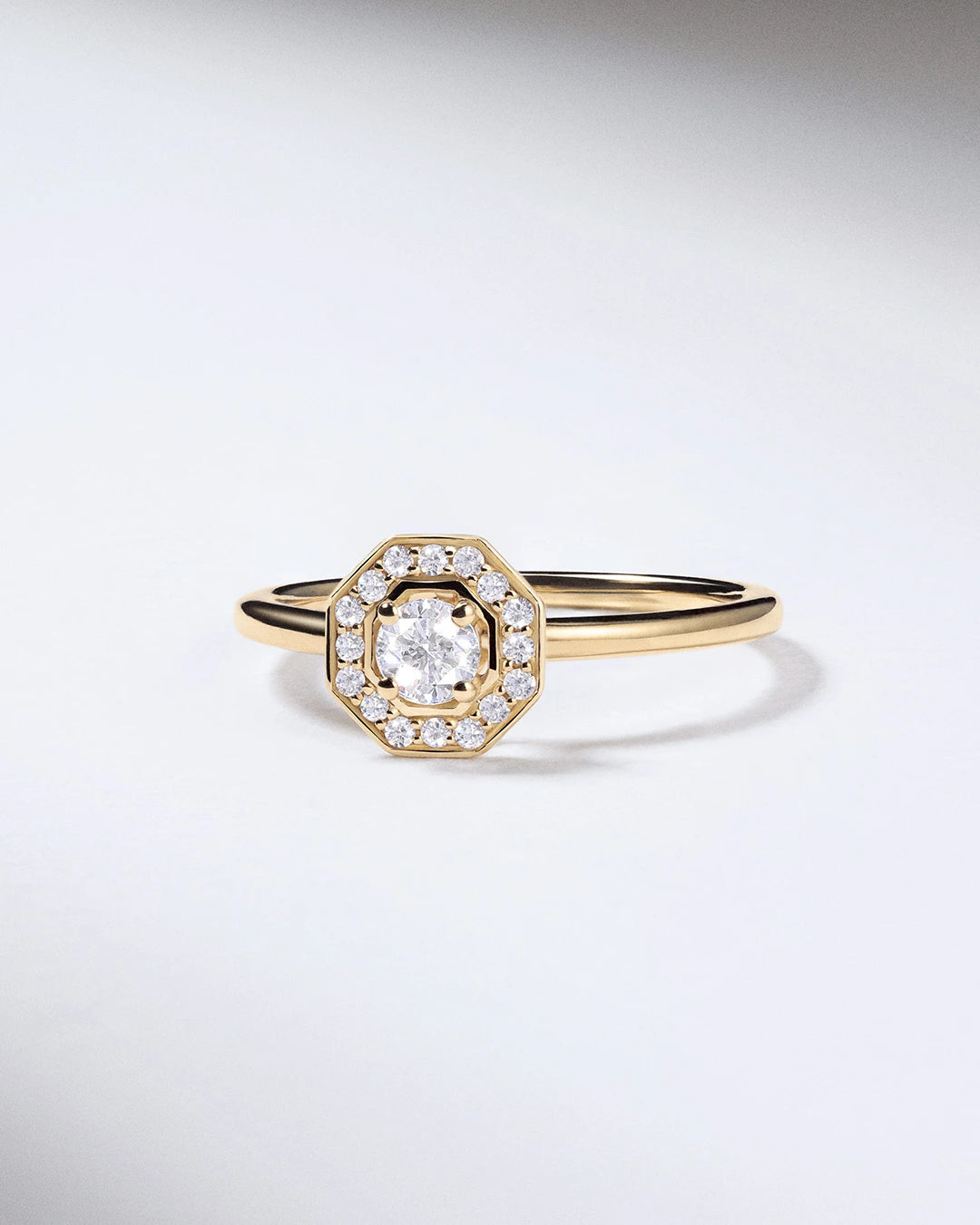 En Mumit, queremos celebrar el centenario del art déco con una colección de joyas inspirada en el espíritu vanguardista de los años 20 y diseñada para la mujer de hoy. La sortija Art Deco Belle apuesta por la armonía y la elegancia atemporal de las formas geométricas. Su nombre rinde homenaje a Belle Kogan, una de las mujeres que definieron los códigos del movimiento desde el ámbito del diseño industrial. Esta joya presenta un exquisito diamante central de 0,20 quilates, certificado por la GIA y enmarcado en una orla octogonal que ensalza la simetría del conjunto. Elaborada en oro amarillo de 18 kt, la montura incorpora un brillo cálido y envolvente, evocando la preferencia por los contrastes del art déco. Una pieza sofisticada y actual que conecta el legado artístico de principios de siglo XX con el presente.