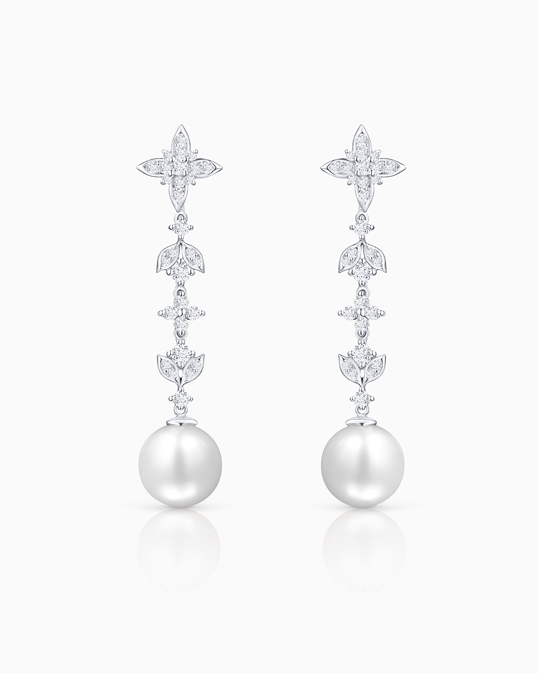 Brincos Aster de pérolas e diamantes em ouro branco 18K