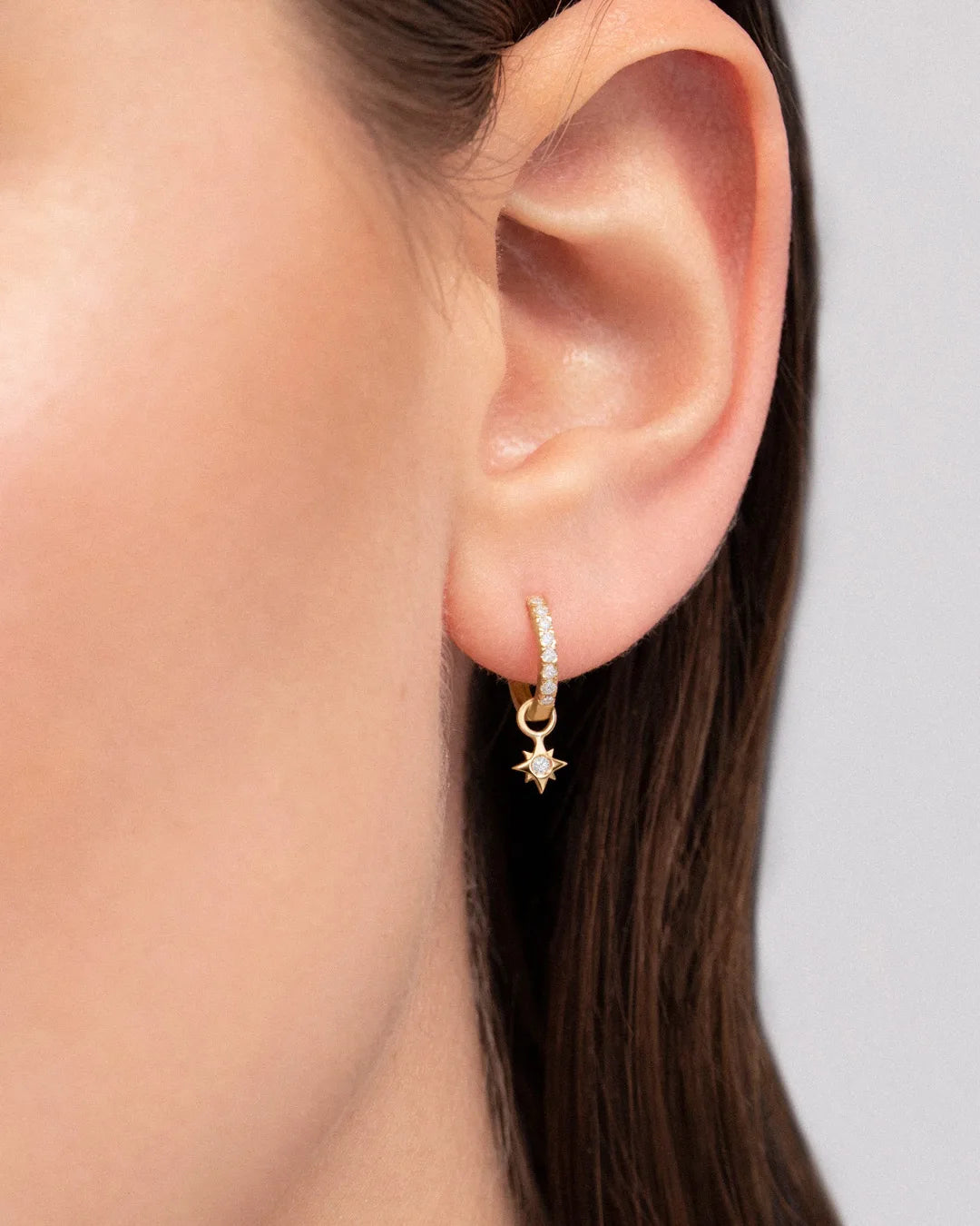 Charm espetacular Rosa dos ventos para brinco de argoladiamante em ouro amarelo 18 kt. Esta joia irá cativá-lo desde o primeiro momento em que você a vir, com a delicadeza de seu design que incorpora um imaculado diamante de lapidação brilhante de extrema pureza. A Rosa dos Ventos e seu lindo formato e tamanho pequeno farão você se apaixonar. Combina perfeitamente com brincos de argola Mumit Petite Diamonds, brincos de argola Eternity Colors e piercings de argola Punk.