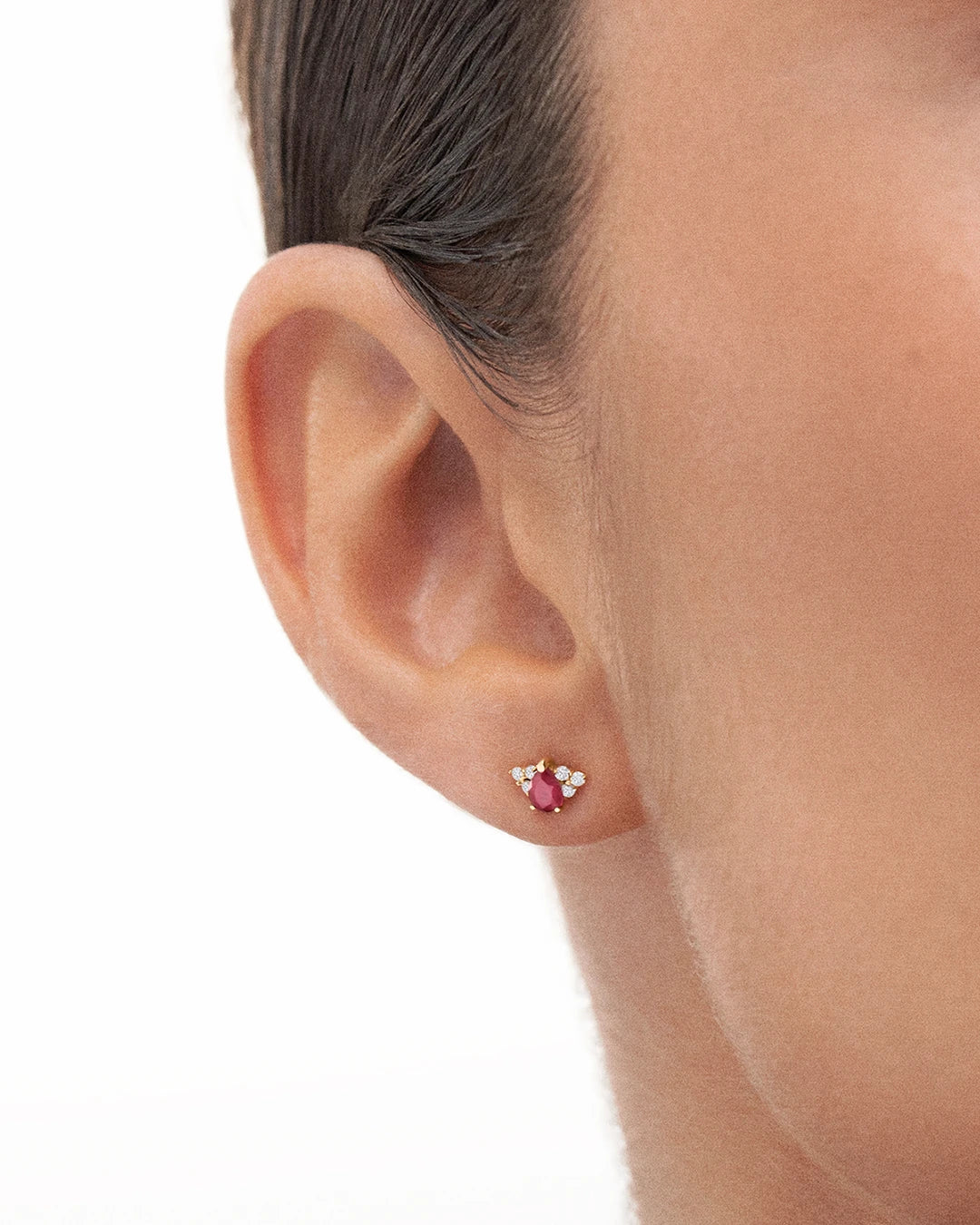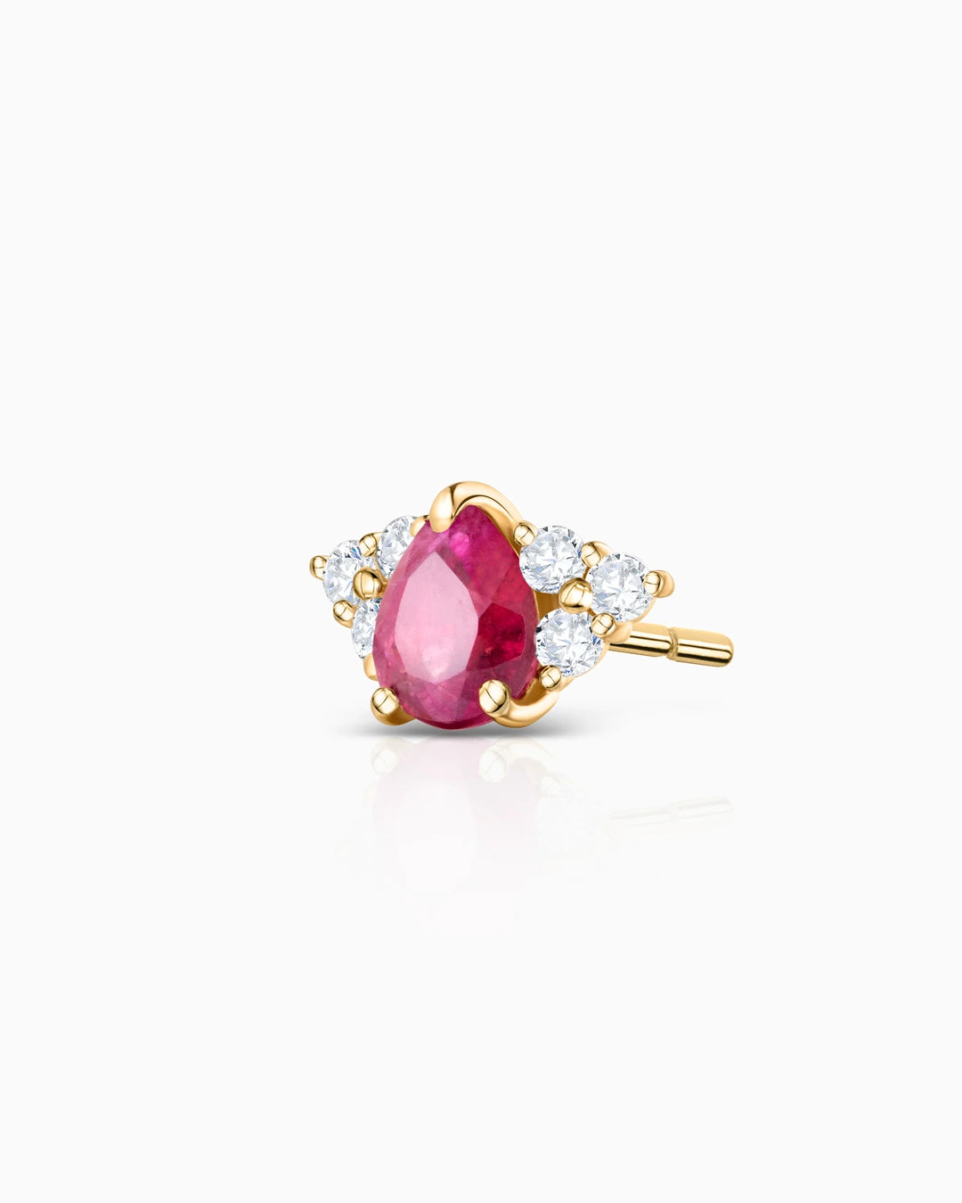 Brinco piercing Crown II Drops com rubi em ouro amarelo 18K. Inspirado na história da realeza que se mantém viva através do brilho das joias mais preciosas, coroas reais e tiaras. As peças da coleção Crown são uma interpretação minimalista requintada das imponentes pedras preciosas que deram vida às Joias da Coroa. Uma joia cheia de cor e brilho, fusão perfeita de elegância e modernidade, cujo protagonista é um rubi central guardado por seis diamantes lapidação brilhante.Cada brinco de piercing da coleção Crown II foi projetado levando em consideração os ângulos da orelha e sua posição, tornando esta peça uma joia perfeita para hélice, cartilagem e anti-hélice.Os piercings da coleção Crown estão disponíveis em ouro amarelo 18 quilates e em diversas versões, com uma pedra central em lapidação brilhante, marquesa, pêra e oval, com rubi, esmeralda ou safira.