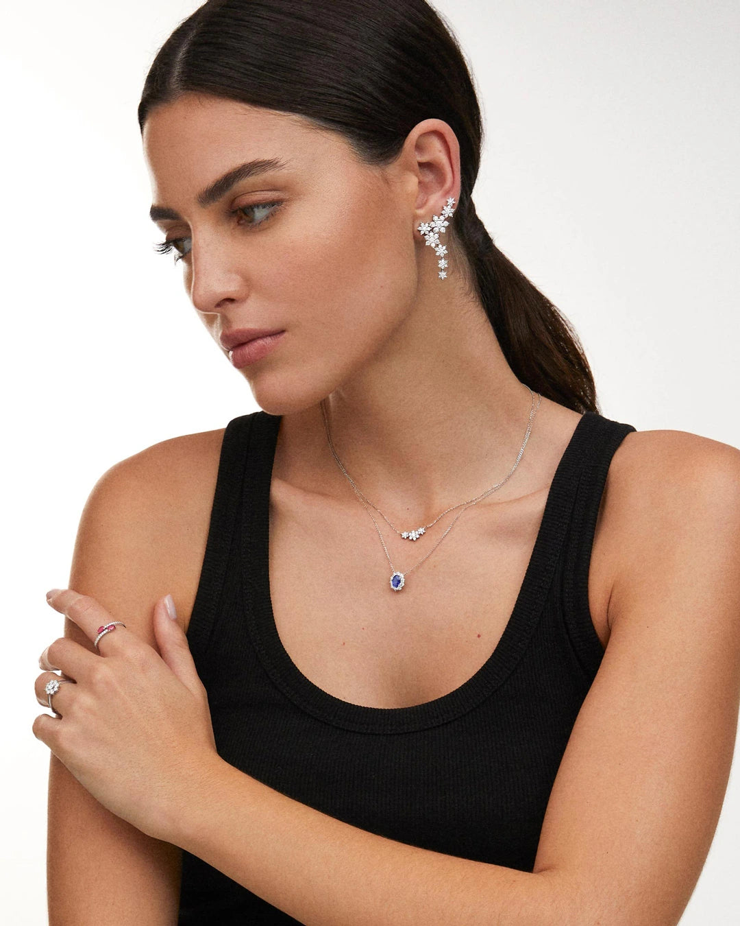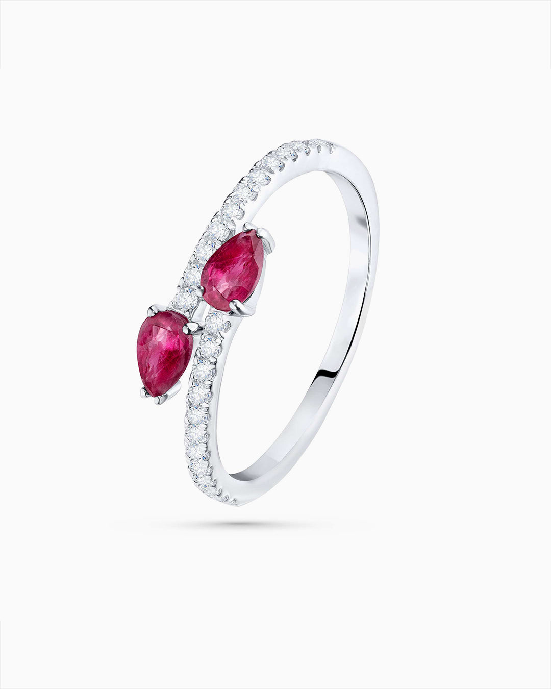Feito em ouro branco 18k e cravejado com dois rubis requintados e um diamante cravejado em pavé, o anel Anabel exala personalidade e elegância atemporal. Seu design romântico "você e eu" representa a união de duas metades que se complementam perfeitamente, enquanto os rubis lapidados em formato de pera acentuam o simbolismo da peça com suas linhas femininas e estilizadas. Perfeito para um presente significativo.