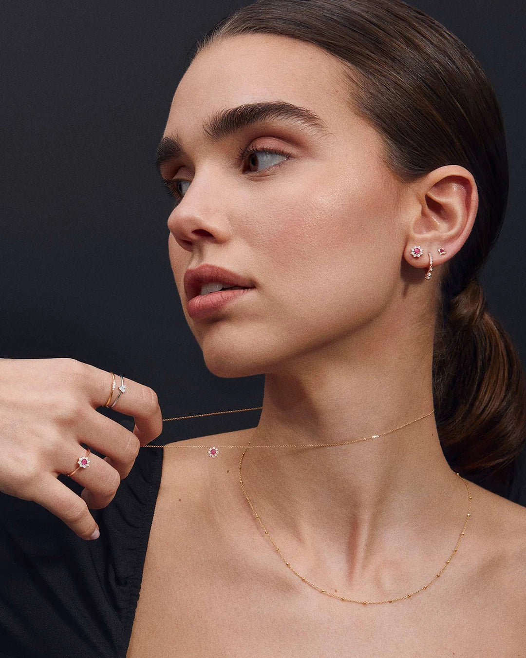 Anel Astrid com rubi e diamante feito em ouro rosa 18 quilates. O design do anel Astrid funde a estética romântica das rosetas e o espírito moderno que distingue a Mumit, resultando em uma expressão inesquecível de elegância atemporal. O tom vermelho característico do rubi contrasta perfeitamente com o brilho claro dos diamantes ao redor, criando um impacto visual único. Além disso, a borda de diamante aumenta o tamanho percebido da pedra central, realçando sua silhueta delicada e tornando-a o centro das atenções. Versátil e sofisticada, é uma joia perfeita tanto para uso diário quanto para combinar com as demais peças da coleção para elevar seu visual em qualquer evento especial. O anel Astrid está disponível em três versões: ouro amarelo 18 kt com esmeralda e diamantes, ouro branco 18 kt com safira e diamantes e ouro rosa 18 kt com rubi e diamantes.